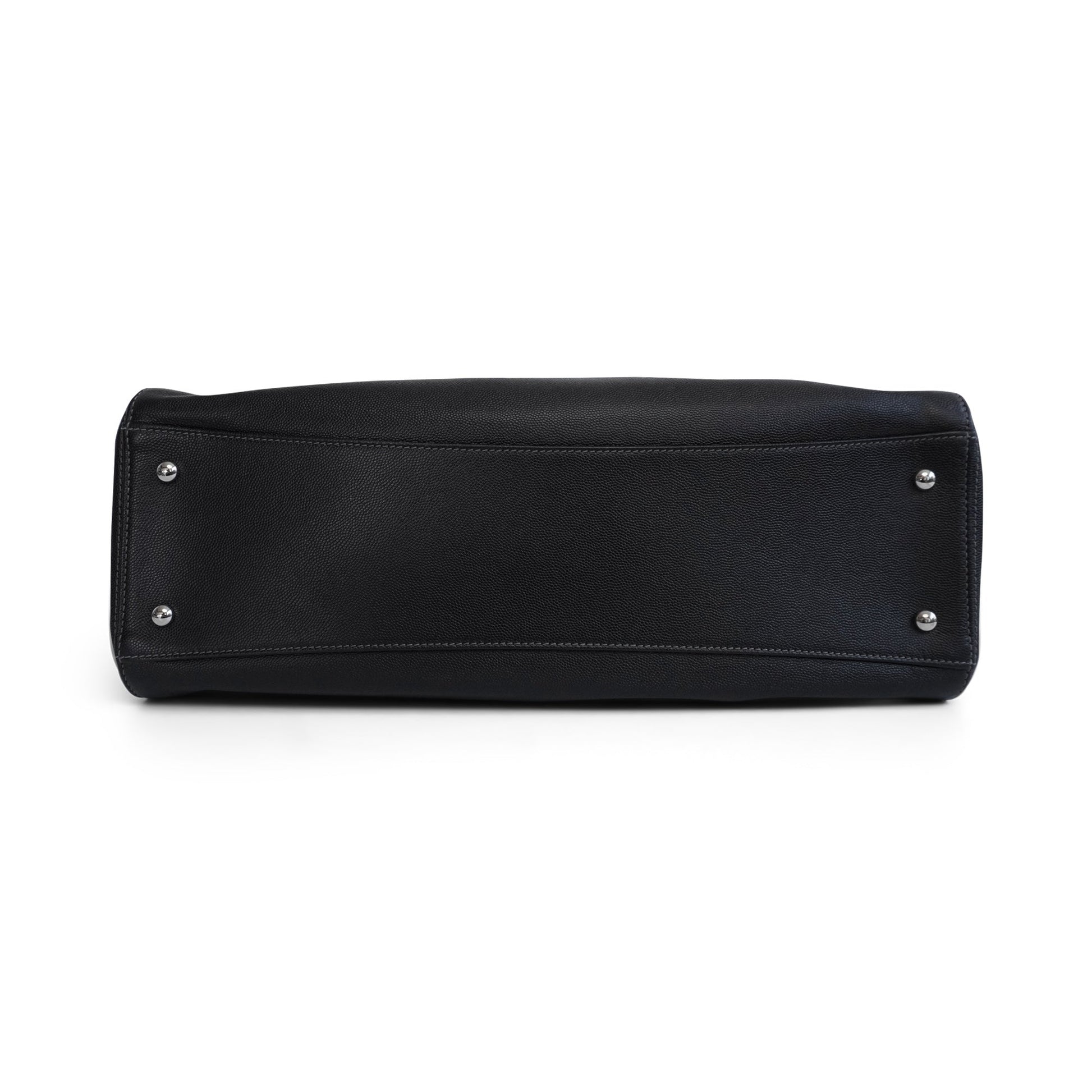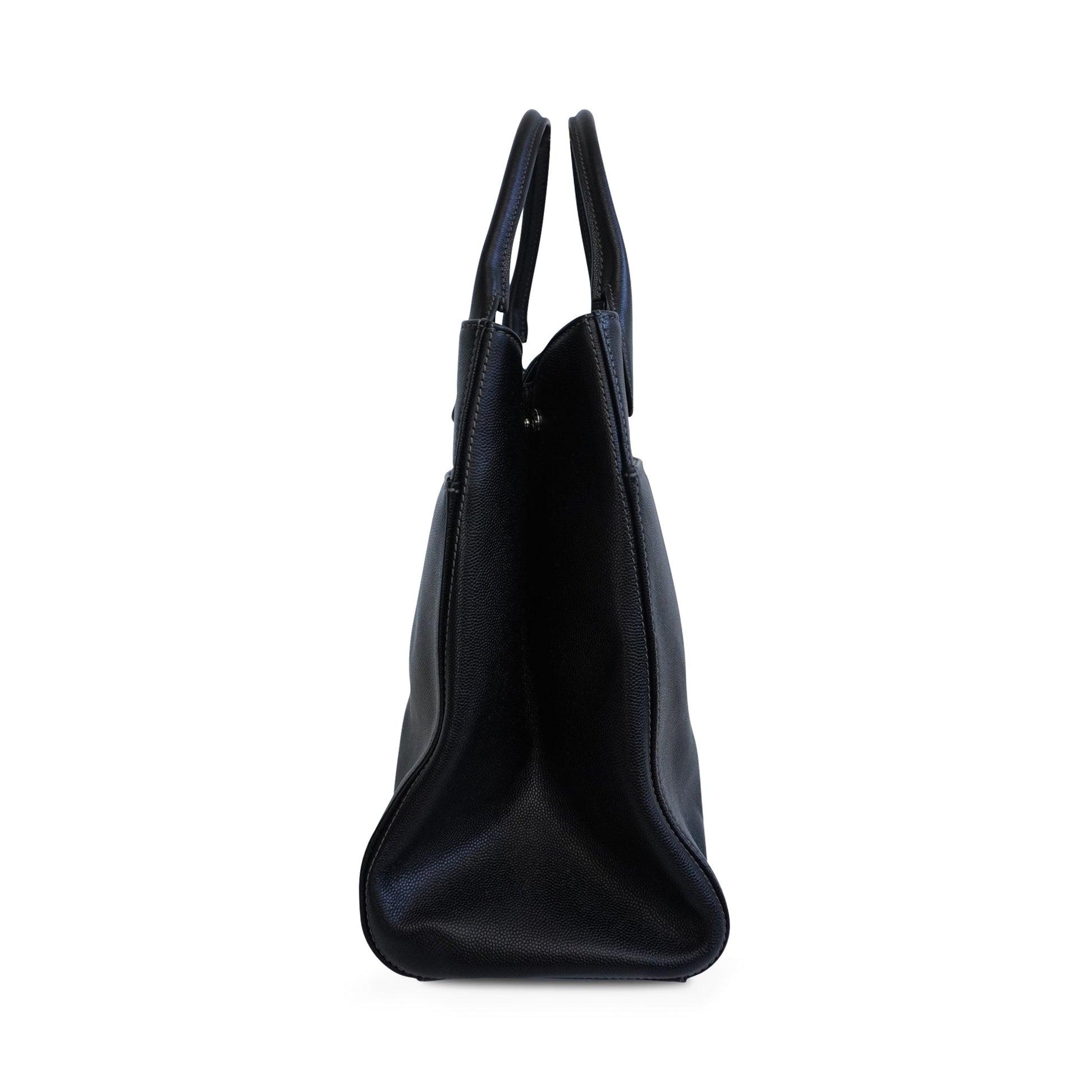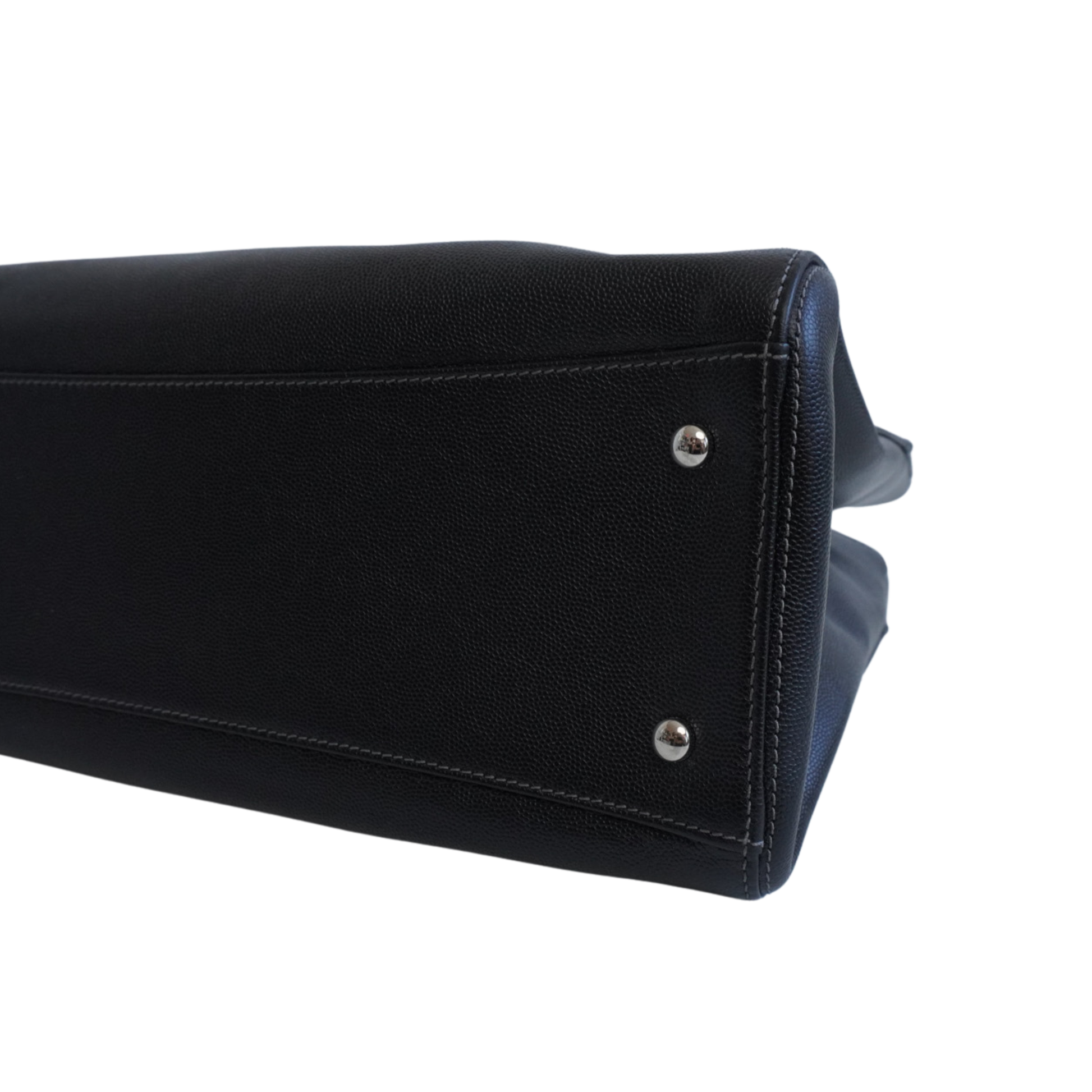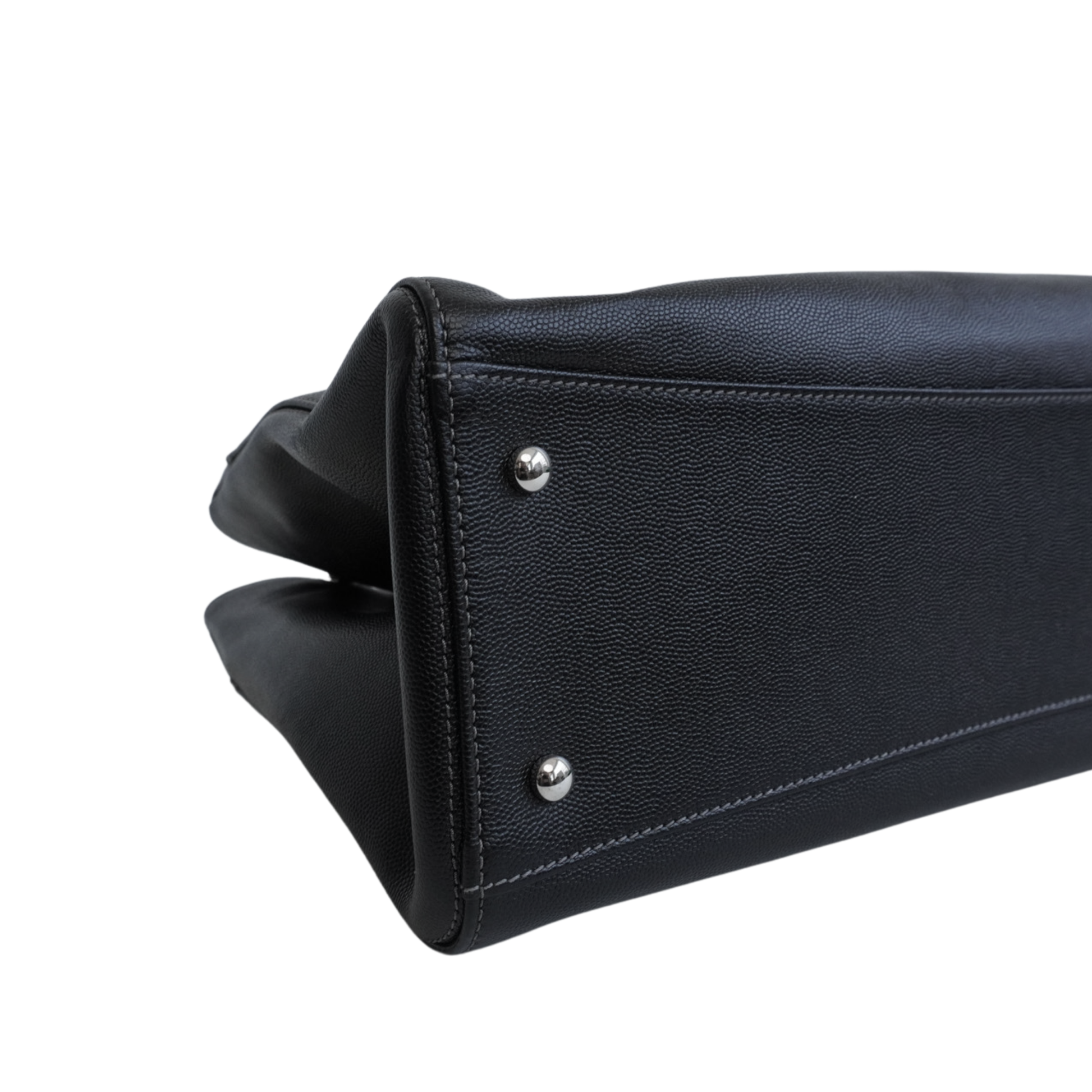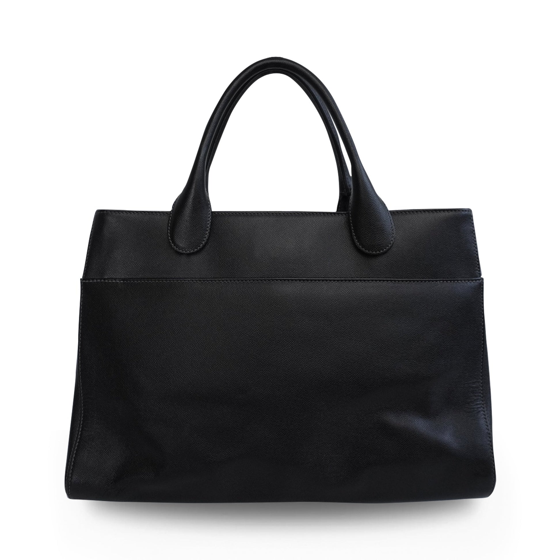 Chanel 'Neo Executive' tote bag in black caviar leather with grey contrast stitching and silver hardware. Features exterior slip pockets and a open pocket with 'CC' turnlock closure. The main pocket is lined with burgundy satin and features double slip and zip pockets as well a leather strap with lobster claw clasp. The gussets can be snapped shut or worn open.
