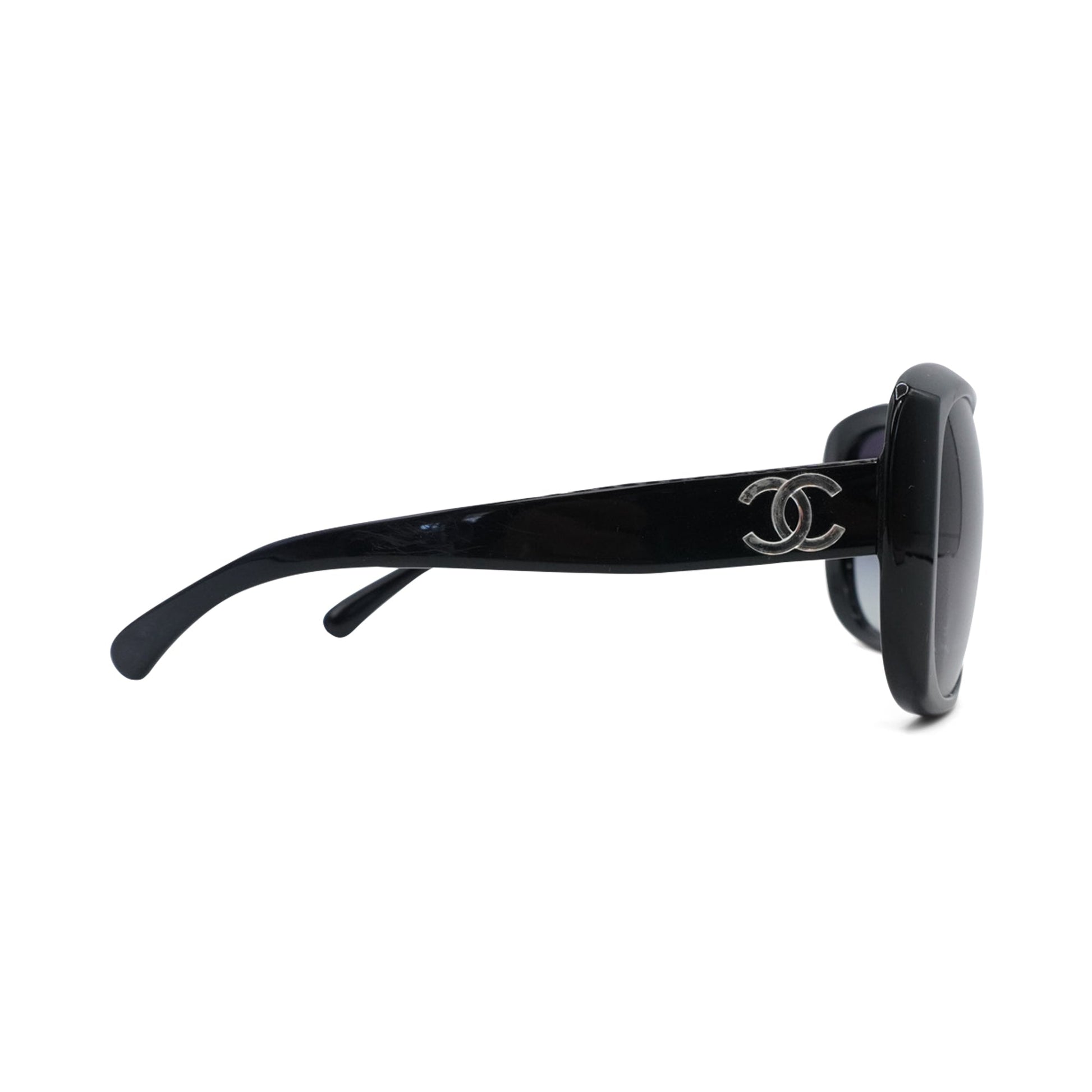 Chanel black oversized rounded sunglasses with mirrored silver CC logos on the arms.