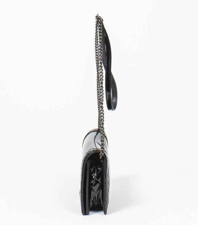 This flap bag is crafted of patent leather in black with silver-tone hardware. It features a shoulder strap made of silver-tone chain-link and adjustable leather that can be worn single or double. The press closure opens to a leather-lined interior partitioned into three compartments which include one zip pocket and two slip pockets.