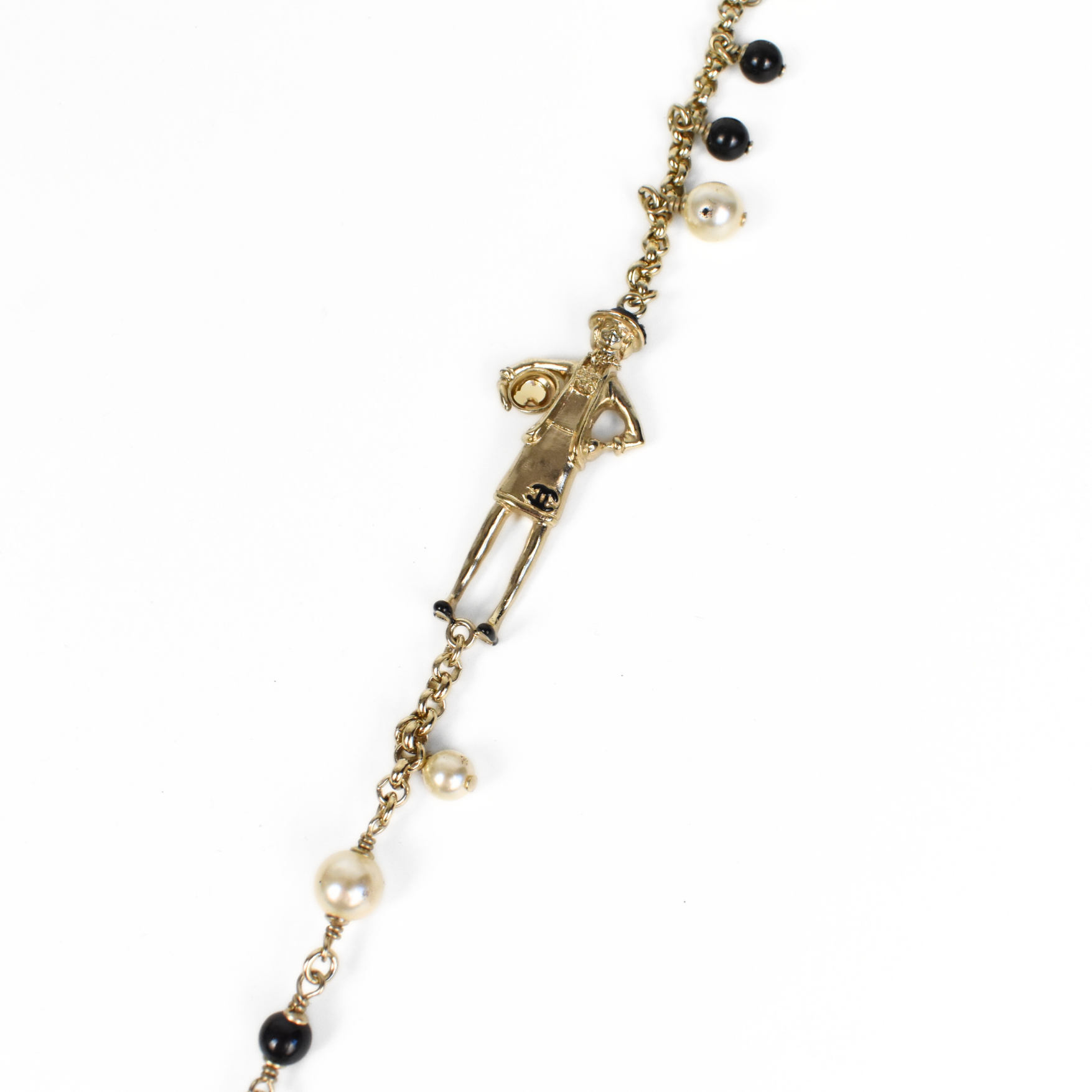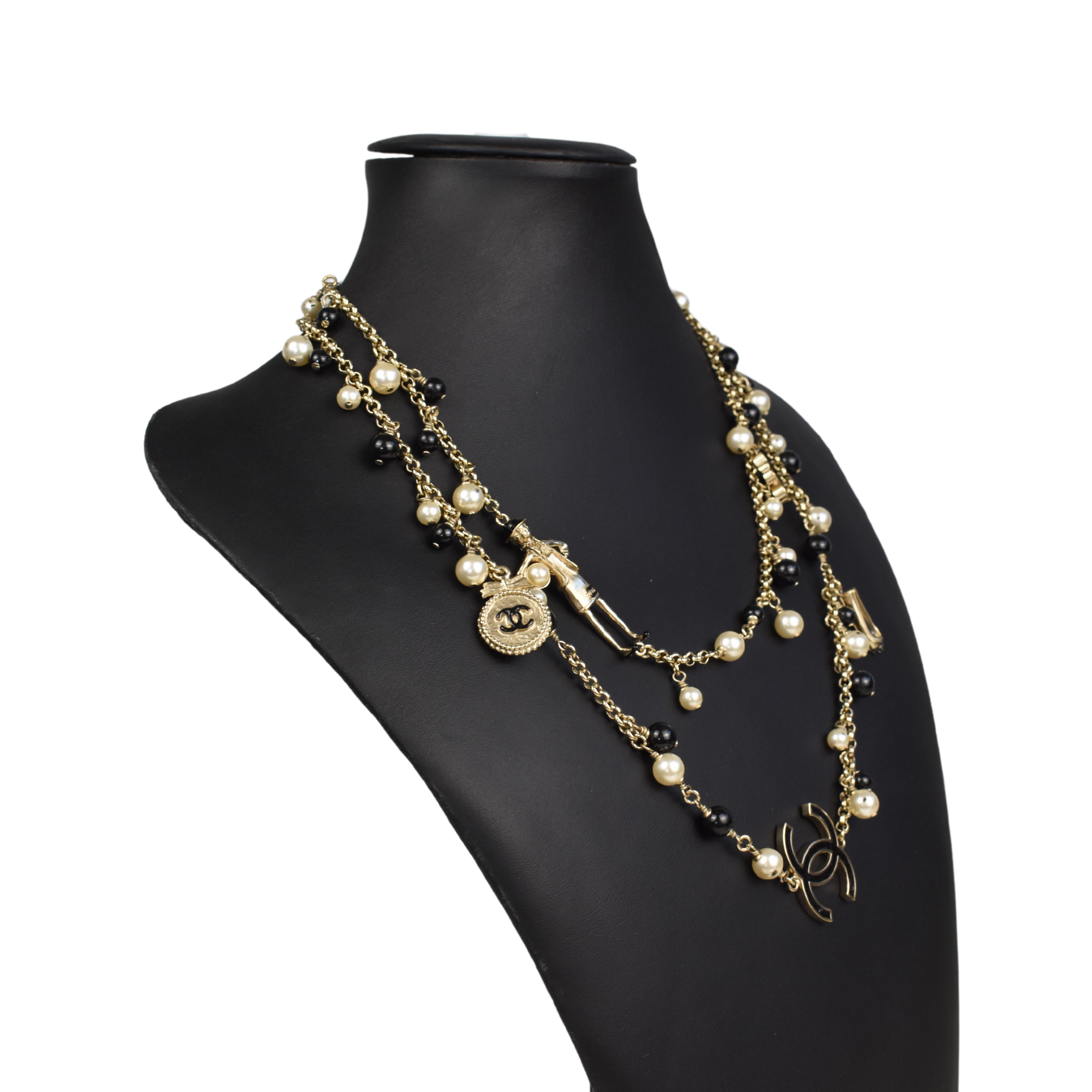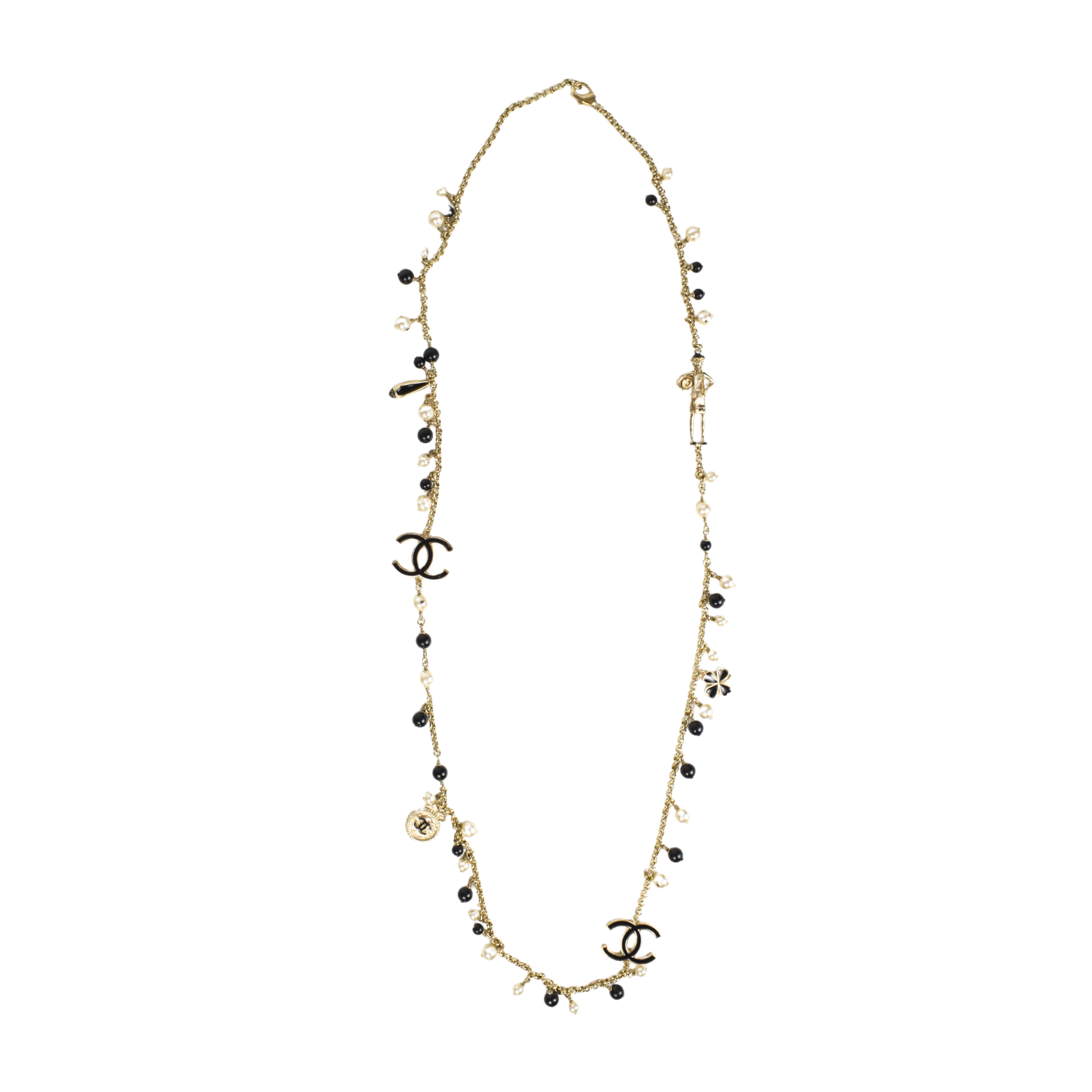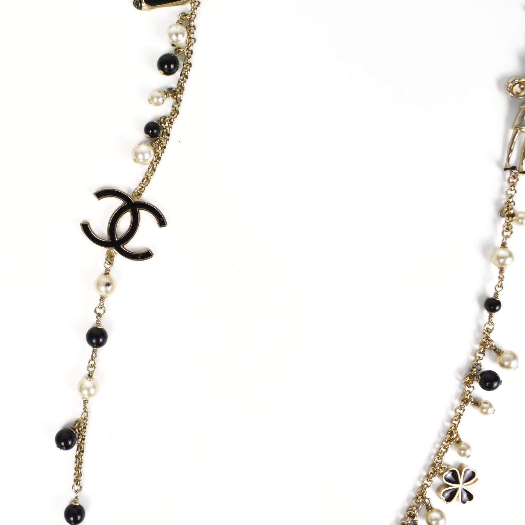 Chanel pearl long necklace in gold-tone metal with black and white pearls. Features black enamel-filled 'CC' logos, gold logo medallions, a black enamel-filled 4-leaf clover charm, a ballet flat charm, a female figure charm, and lobster clasp closure. Circa 2014.
