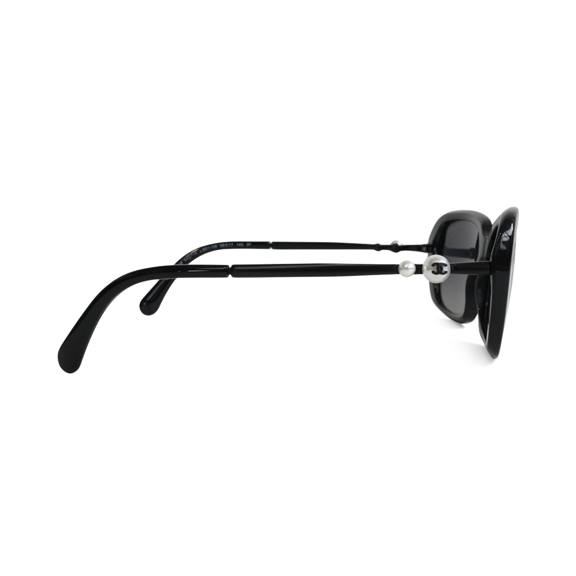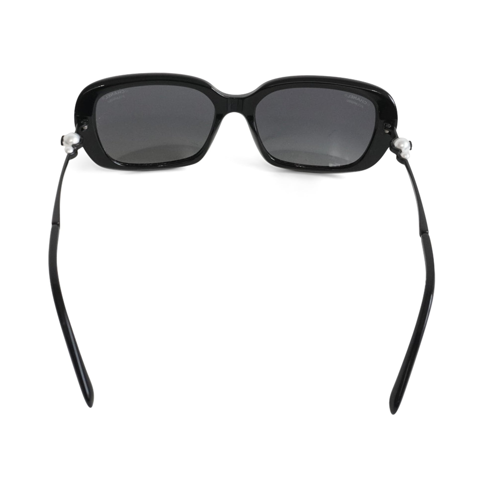 Chanel sunglasses in black acetate with rectangular lenses and thin arms with pearl details at the temple.