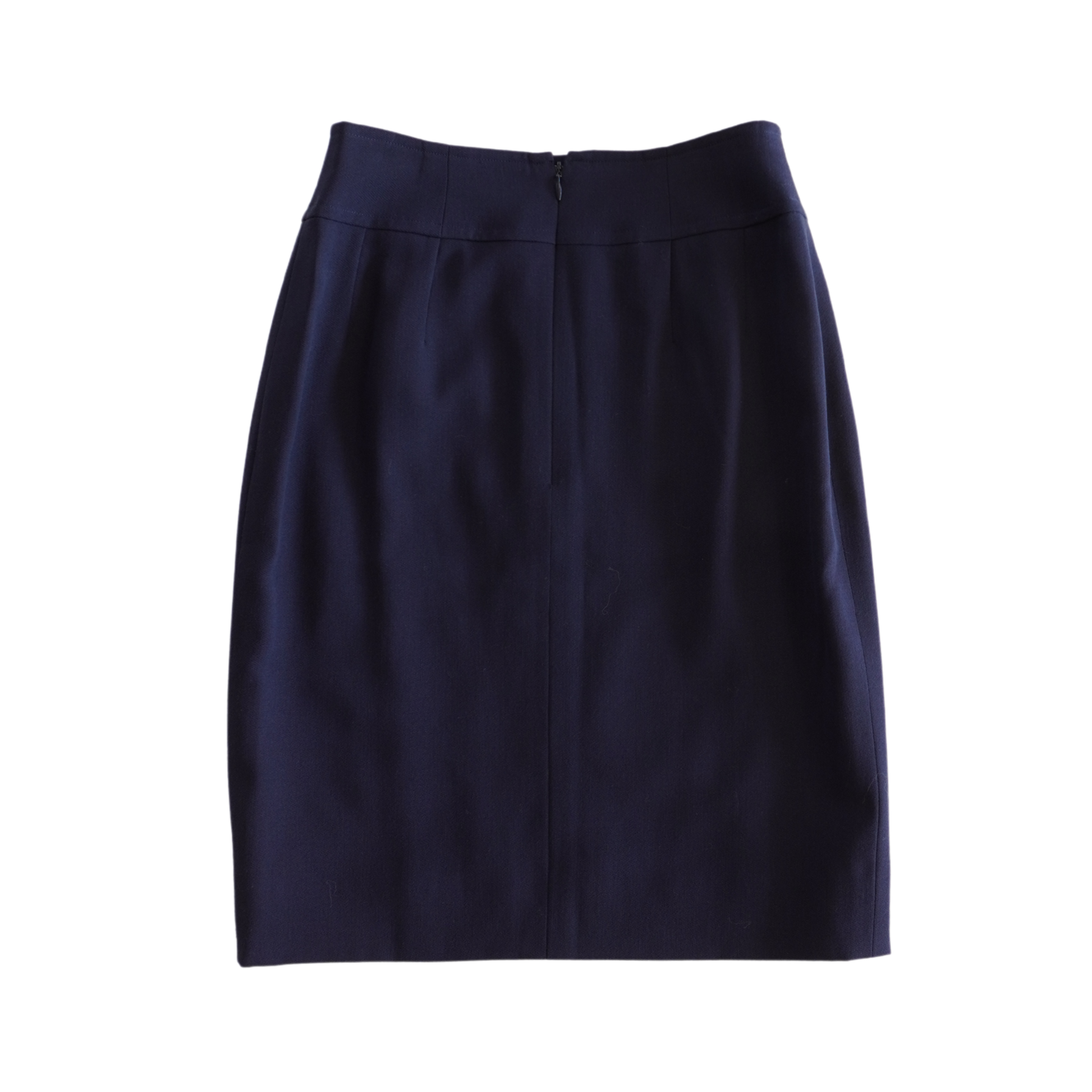 Chanel pencil skirt in navy wool with navy and gold sailor style buttons on the front and a hidden back zip opening.
