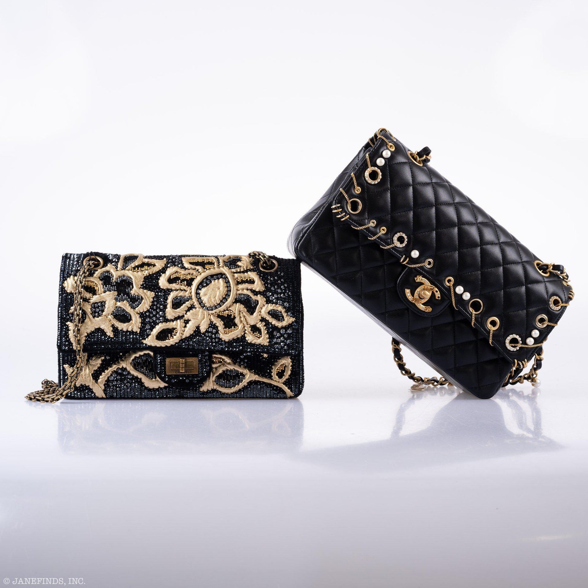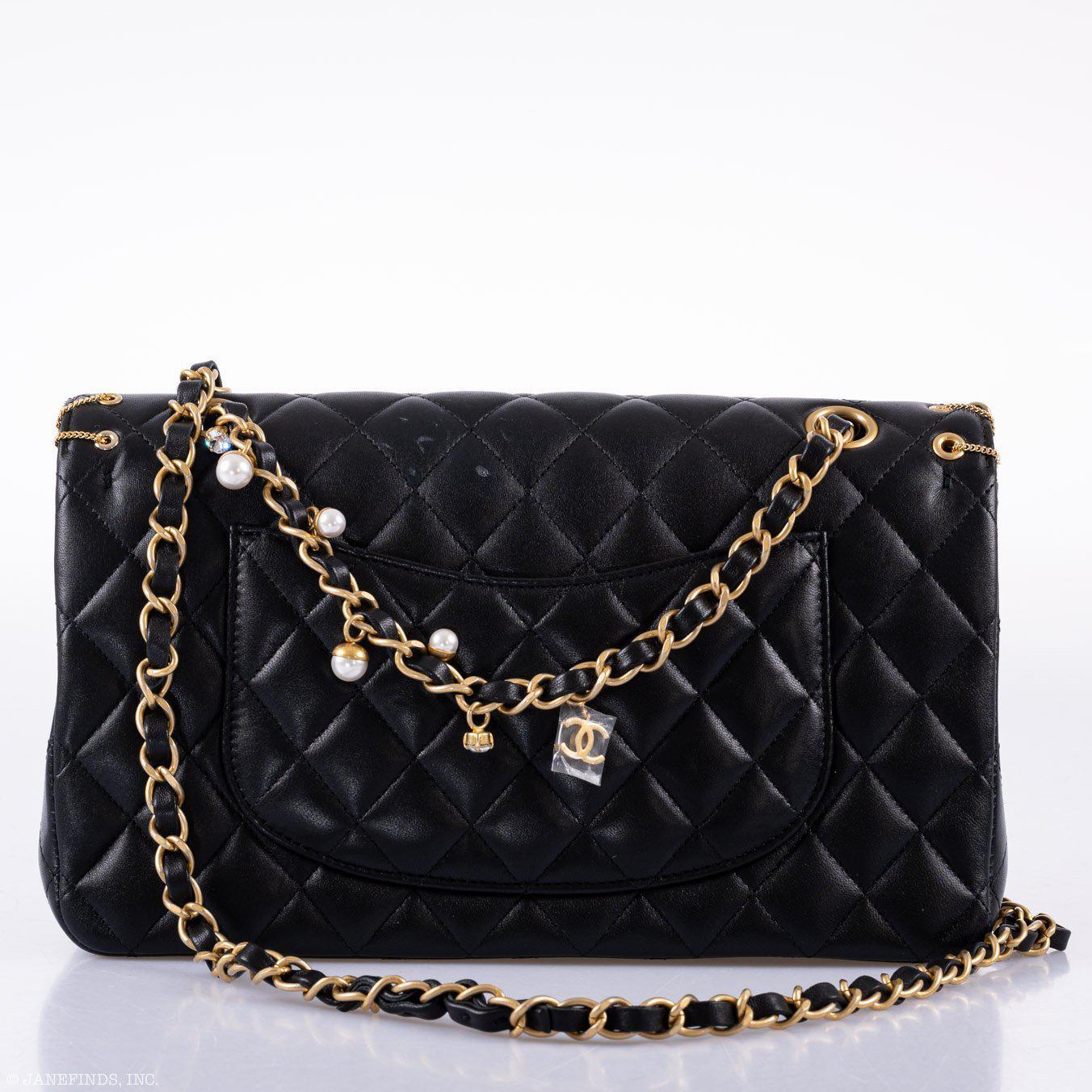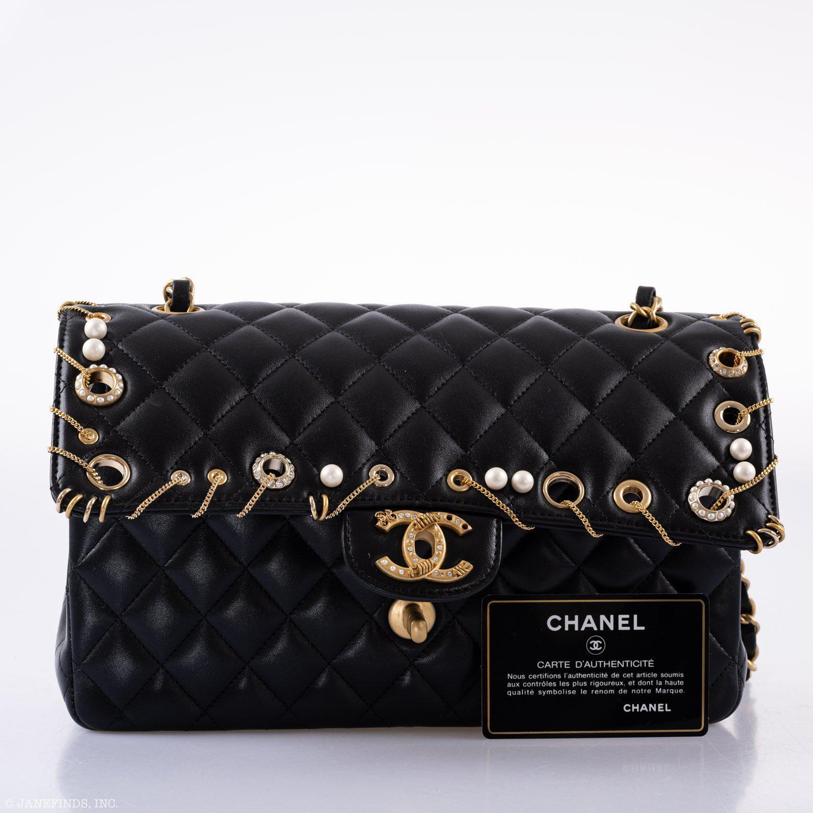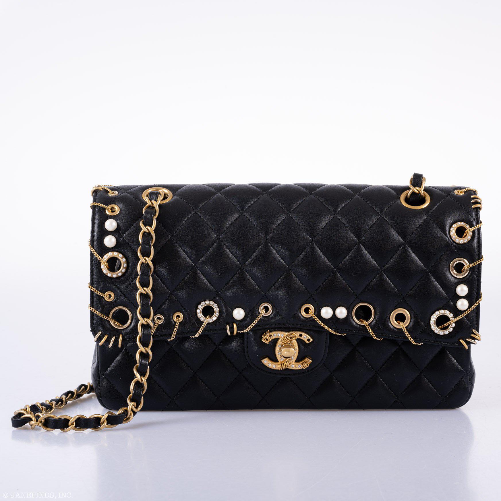 From the Cruise 2018 Collection. Black lambskin Chanel Piercing Chic Medium Classic Double Flap bag with gold-tone hardware, convertible chain-link and leather shoulder strap featuring Strass, faux pearl and CC charms, single slip pocket at exterior, single zip pocket at front flap underside, three interior compartments; two with snap closure at flap, gold-tone metallic leather lining, three interior slip pockets and embellished CC turn lock closure at front flap. Includes box, dust bag, ity card, tag and manual. Shop Chanel handbags on sale at Havik Shop. No longer available originally priced at $9500.00.