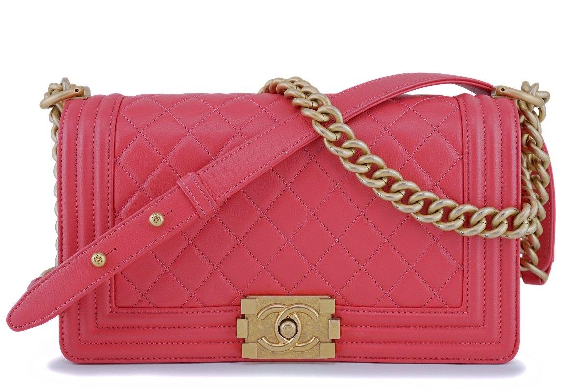 In coral pink caviar leather and brushed gold hardware. The color is a wonderful neutral coral pink color - looks different under different lighting. Very saturated and contrasts beautifully against the aged brushed gold hardware. The boy bag in caviar leather gives it a modern, durable feel. Caviar leather is a pebbled calfskin that is more resistant than lambskin to handling and the elements.