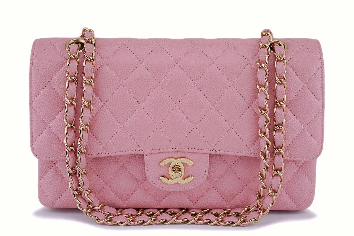 In pink caviar leather and 24k gold plated hardware. In caviar leather, the classic flap is durable with the pebbled grain nodes of calfskin leather.