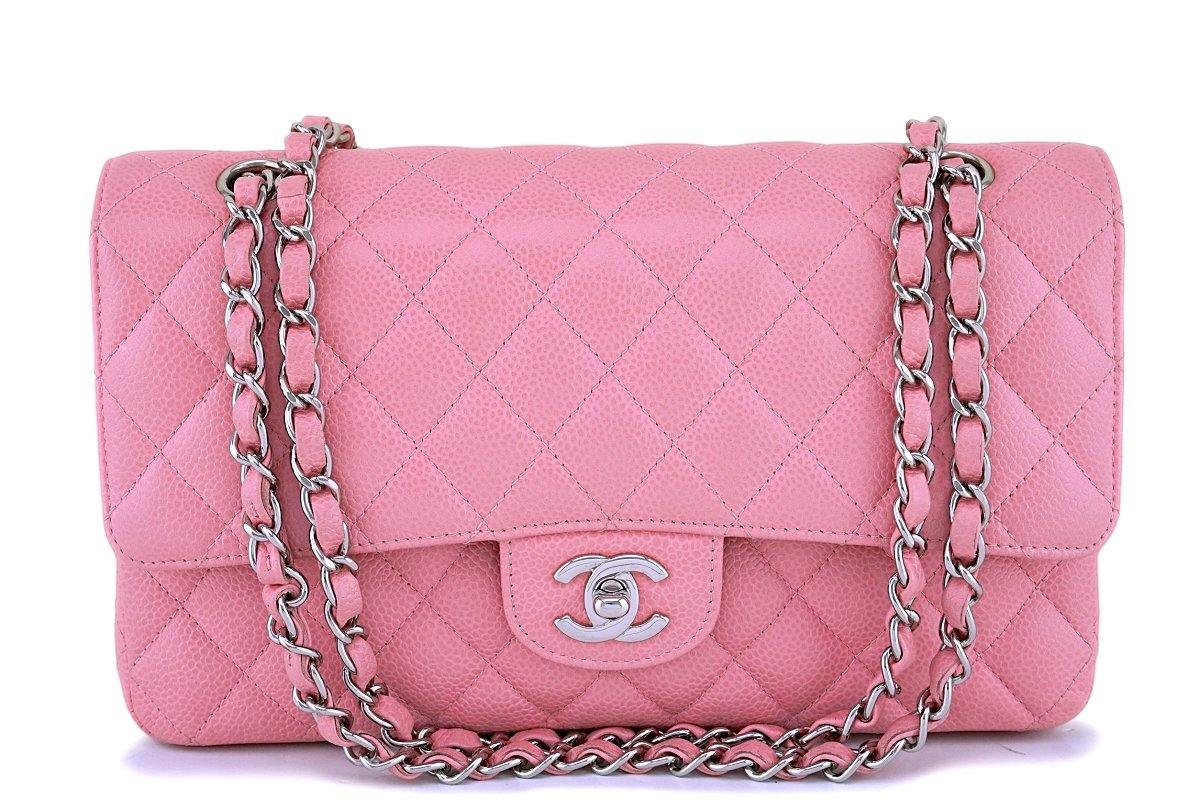In pink caviar leather and silver hardware. In a perfect bubble gum pink, contrasting with the silver hardware. The structure and craftsmanship of this generation is unparalleled. In caviar leather, the classic flap is durable with the pebbled grain nodes of calfskin leather.