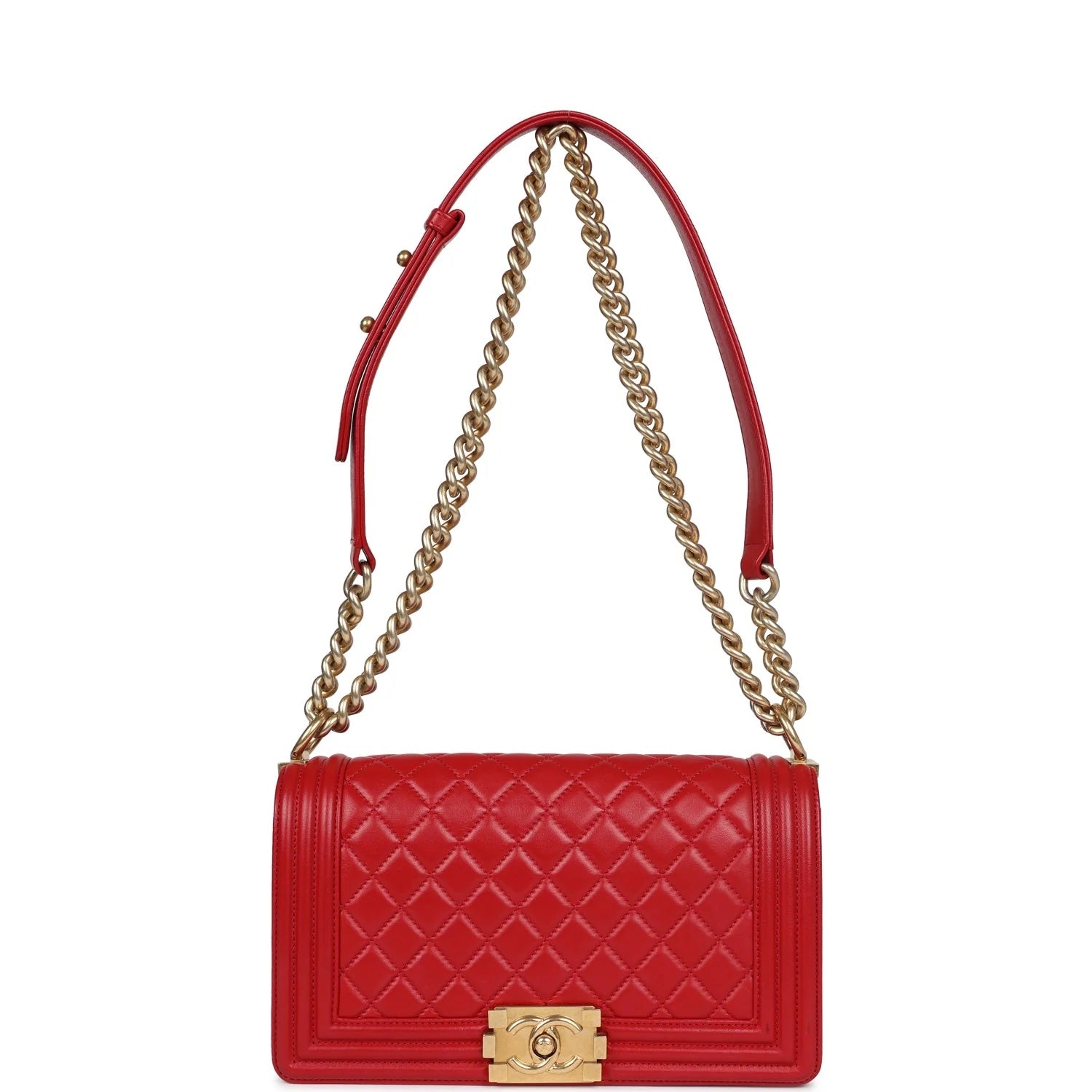 This Stunning Chanel Medium Boy bag Red Lambskin leather with antique gold hardware, and features tonal stitching, front flap with Le Boy CC push closure, smooth leather trim, and antique gold chain link and red leather shoulder strap.