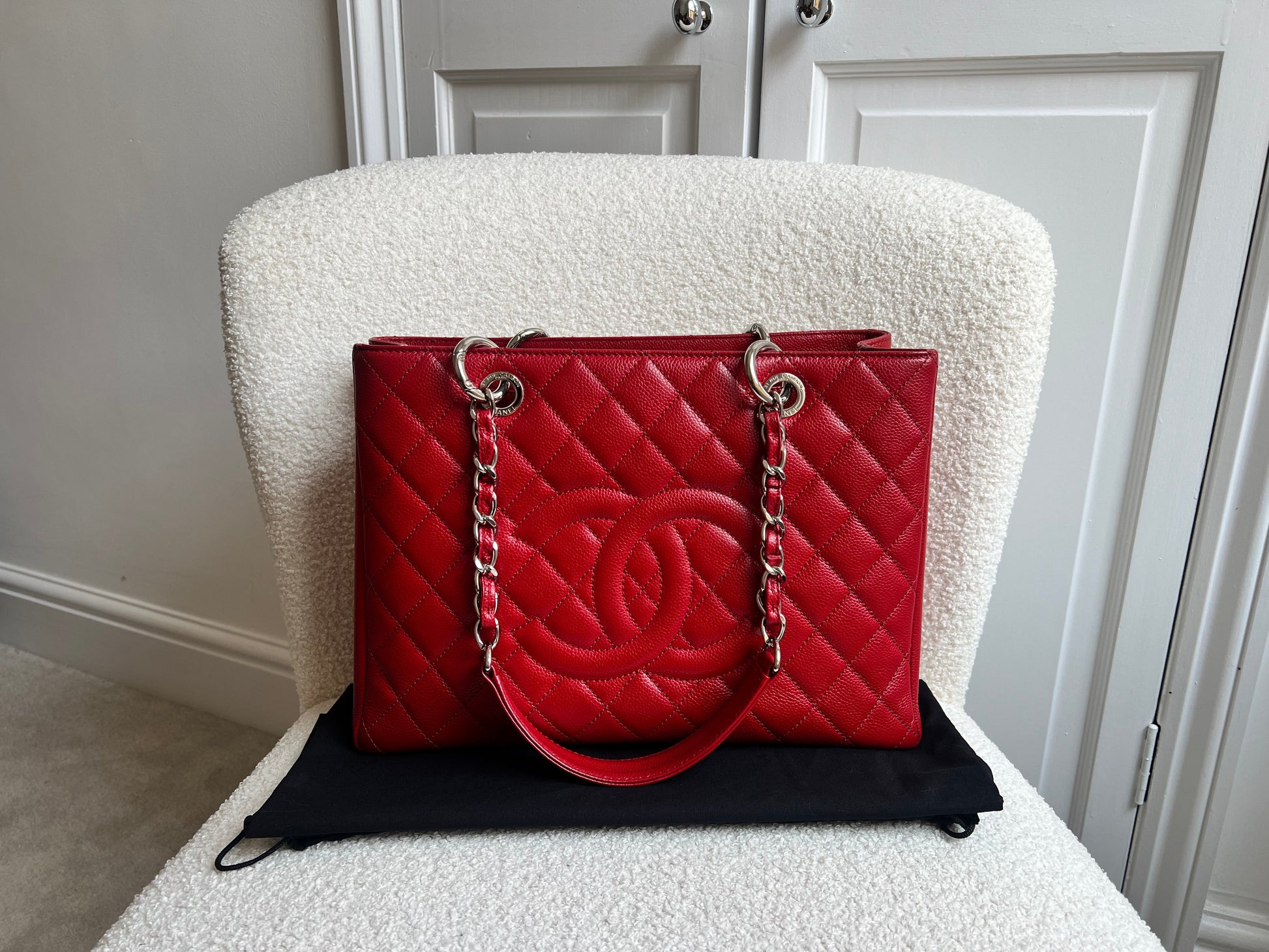 Chanel Grand Shopper Tote (GST) in Red Caviar Leather with silver hardware. This very popular chain tote is sadly now discontinued and only available to buy preloved. Great opportunity to own a practical, iconic and sophisticated Chanel bag without the same price tag as the classic flap styles. Perfect for day or evening use and the caviar leather is very resilient and durable. Can be carried in the crook of the arm or over shoulder using the chain straps.
