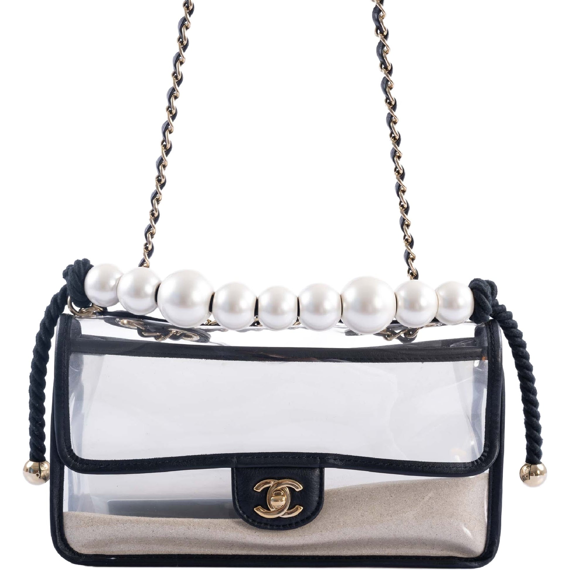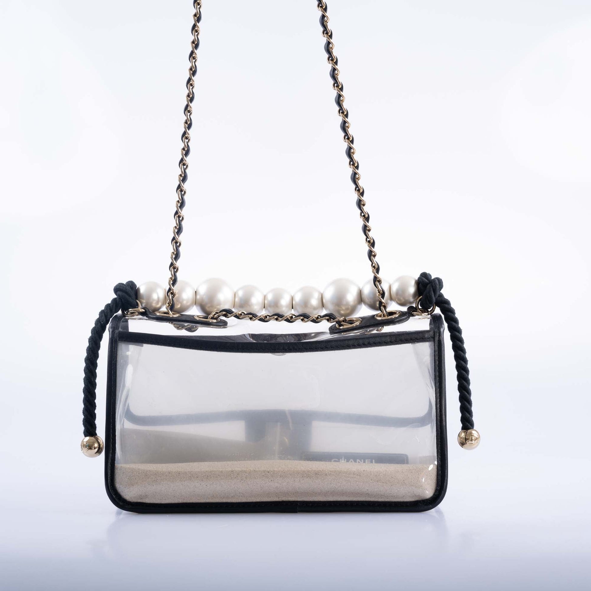 The Chanel Sand By The Sea PVC Flap Bag is truly a statement piece that captures the eye. Hailing from Chanel's 2019 Runway collection, this shoulder bag boasts an unexpected flair with its sand-filled sides, all wrapped up in transparent PVC and accented with black leather trim. What elevates it further is the pearl strap, making it not just visually stunning but also practical. It's meticulous down to the last detail, coming with its original box, dust bag, ribbon, camellia flower, and an ity card—everything you'd expect from a luxury fashion house like Chanel.