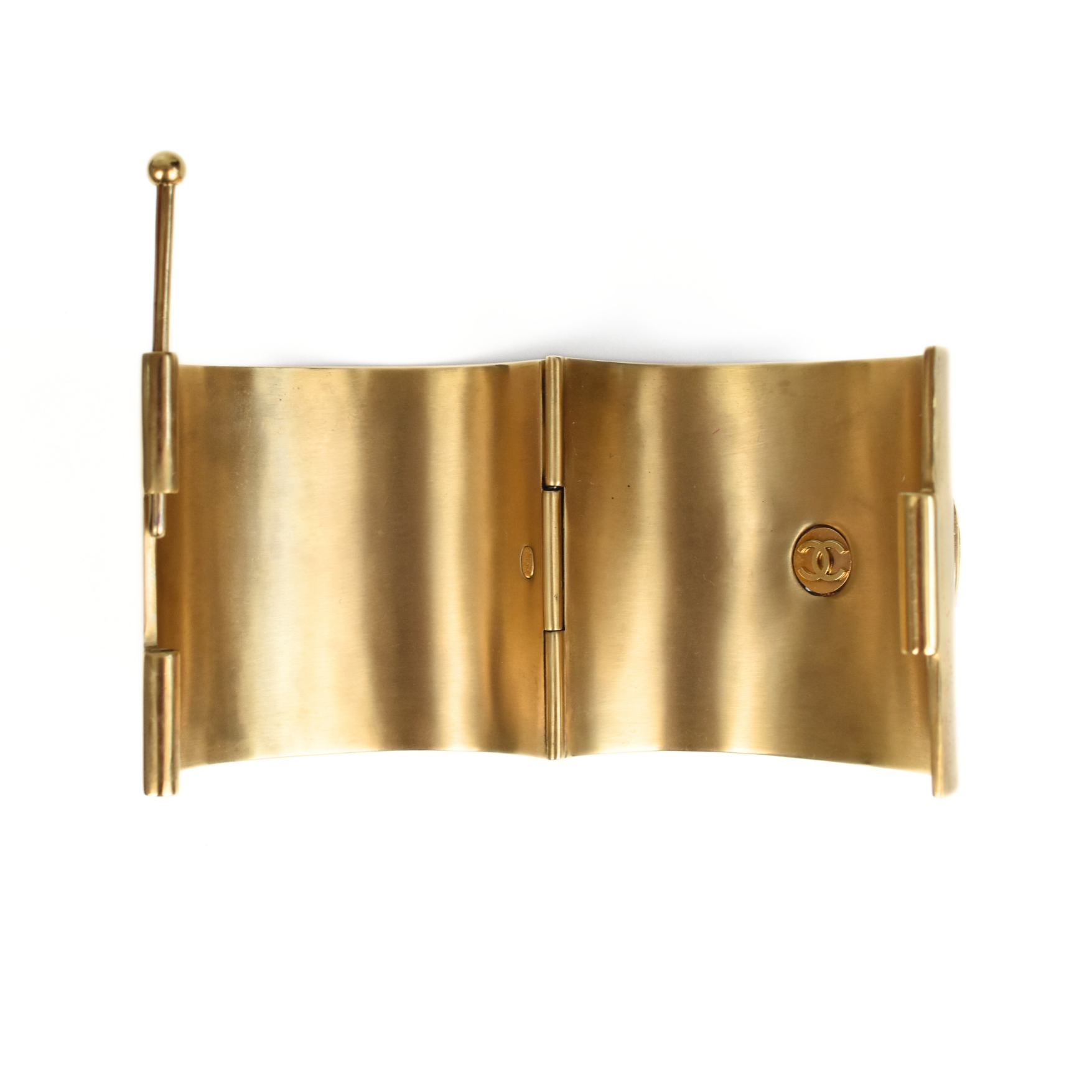 Chanel scarab beetle cuff bracelet in hammered gold. Features a pin closure and beetle with 'CC' logo and crown. From the Paris Egypt 2019 runway collection.