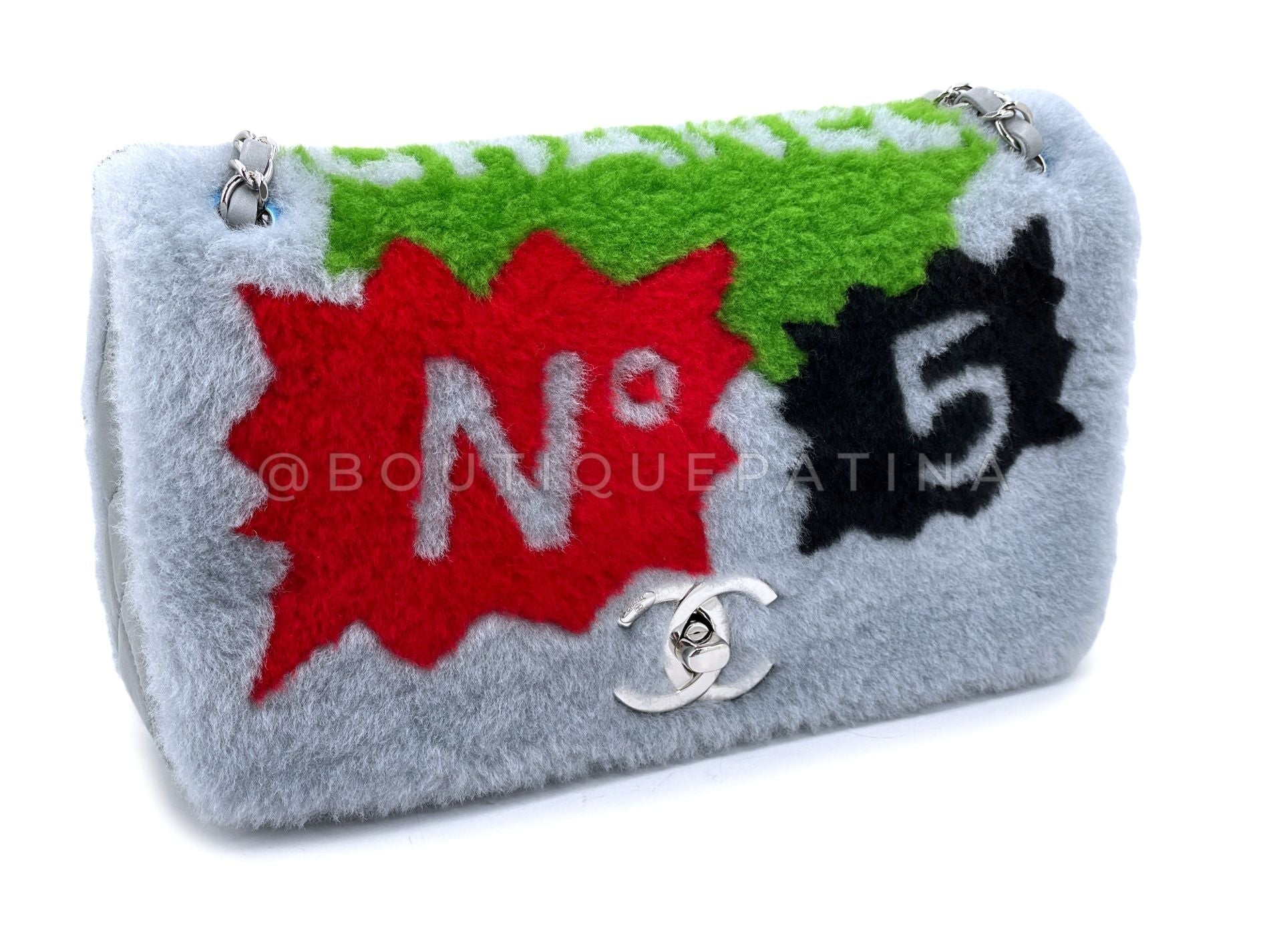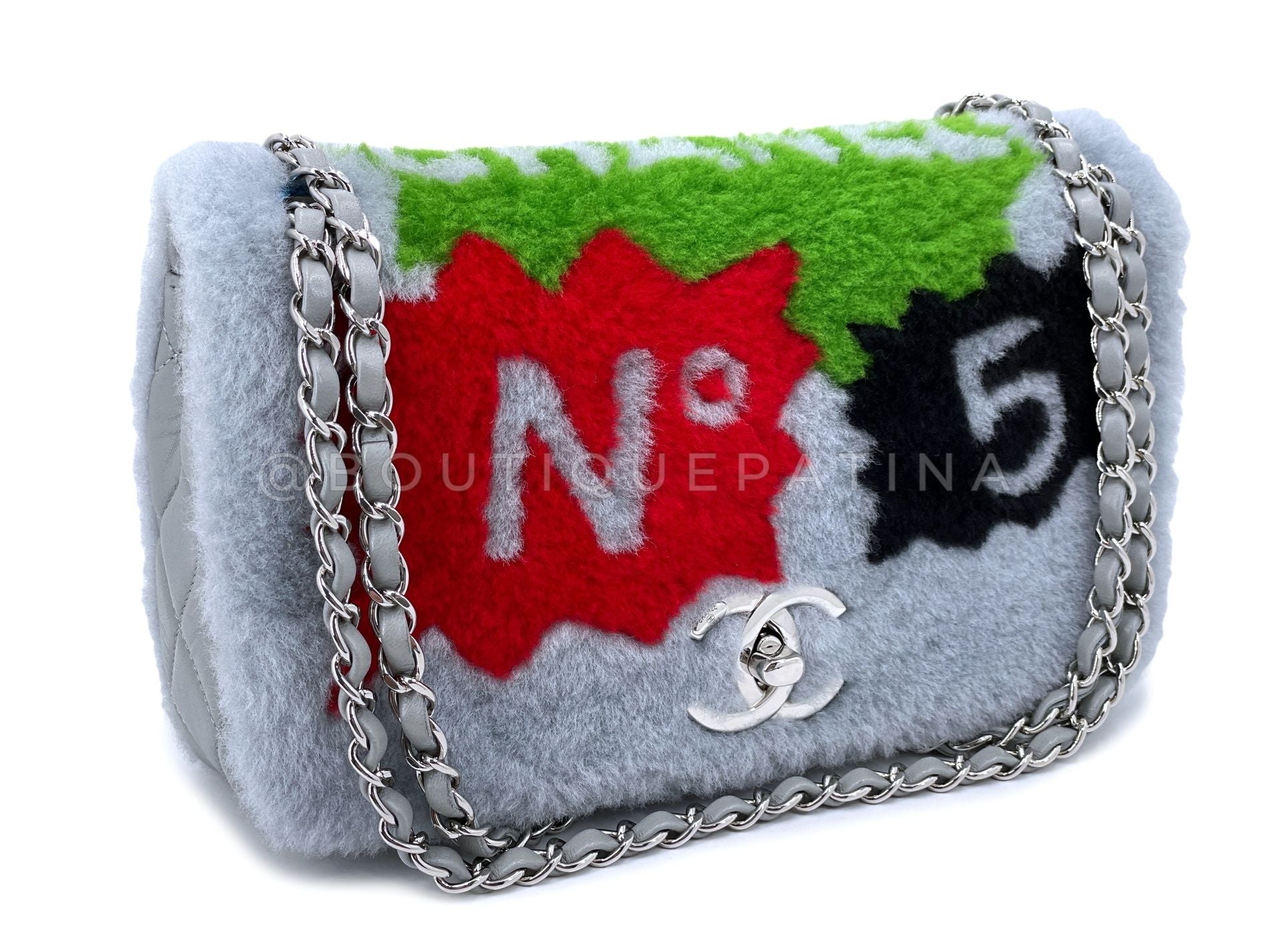 This is a rare collector's item - Chanel 2014 Gray Supermarket Comic Multicolor Shearling Flap Bag SHW with quilted gray lambskin side and bottom panel, front and back shearling with comic print and gray leather interior.
