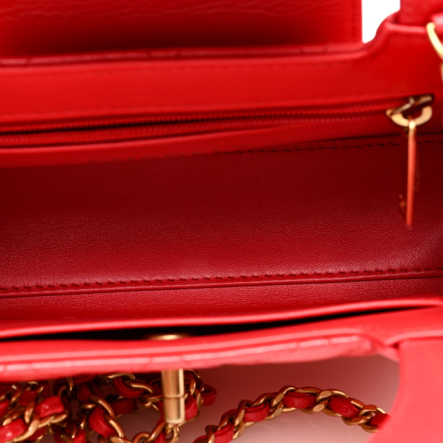 This Stunning Nano Bag is a twist on an archival Chanel bag, Featuring a long Crossbody chain strap. This dual top handle bag is quilted in shiny aged calfskin leather in Red, accented by aged Gold-tone hardware, including a Chanel CC turn-lock at the flap. This opens to a compact leather interior with zipper and flat pockets.