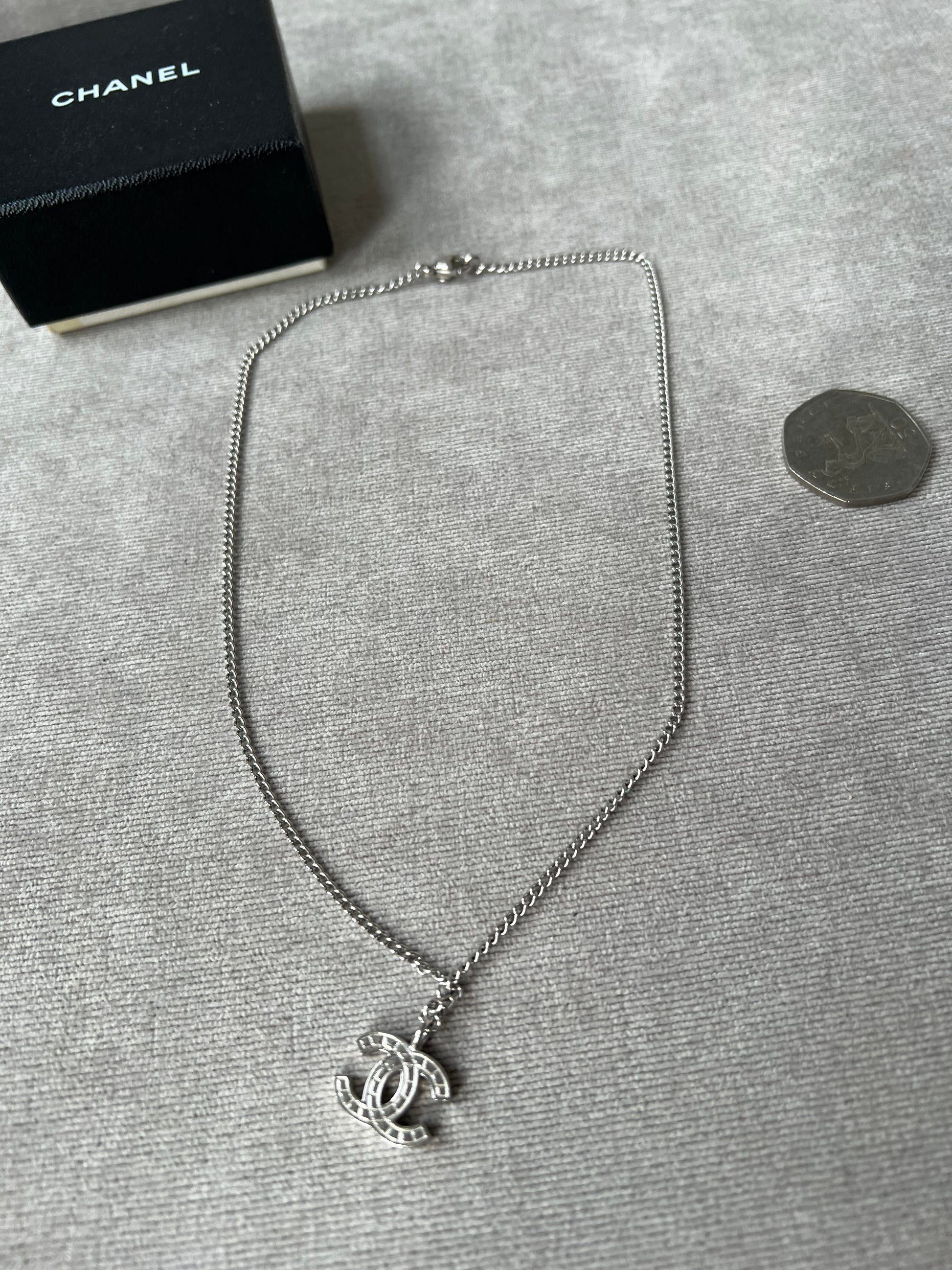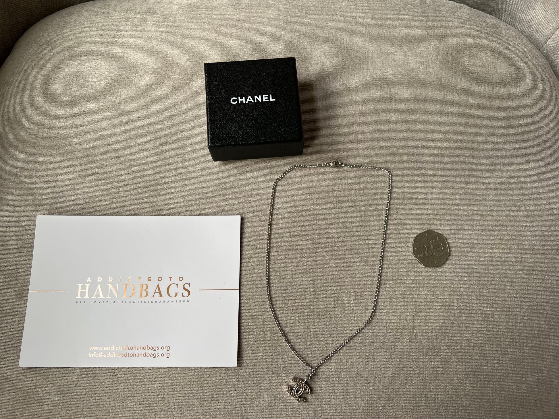 Chanel Silver Toned Embossed CC Pendant Necklace Stunning piece to compliment an outfit.