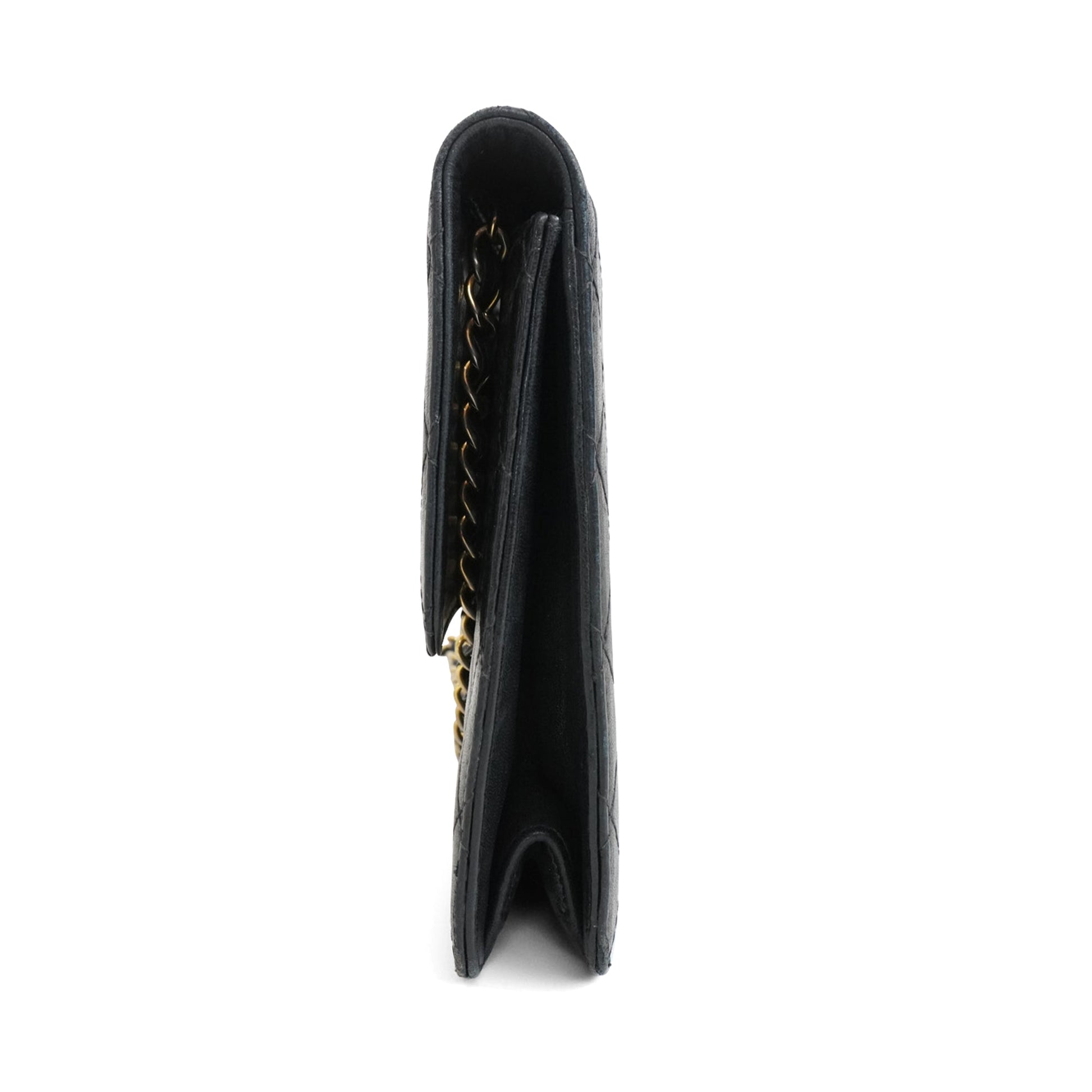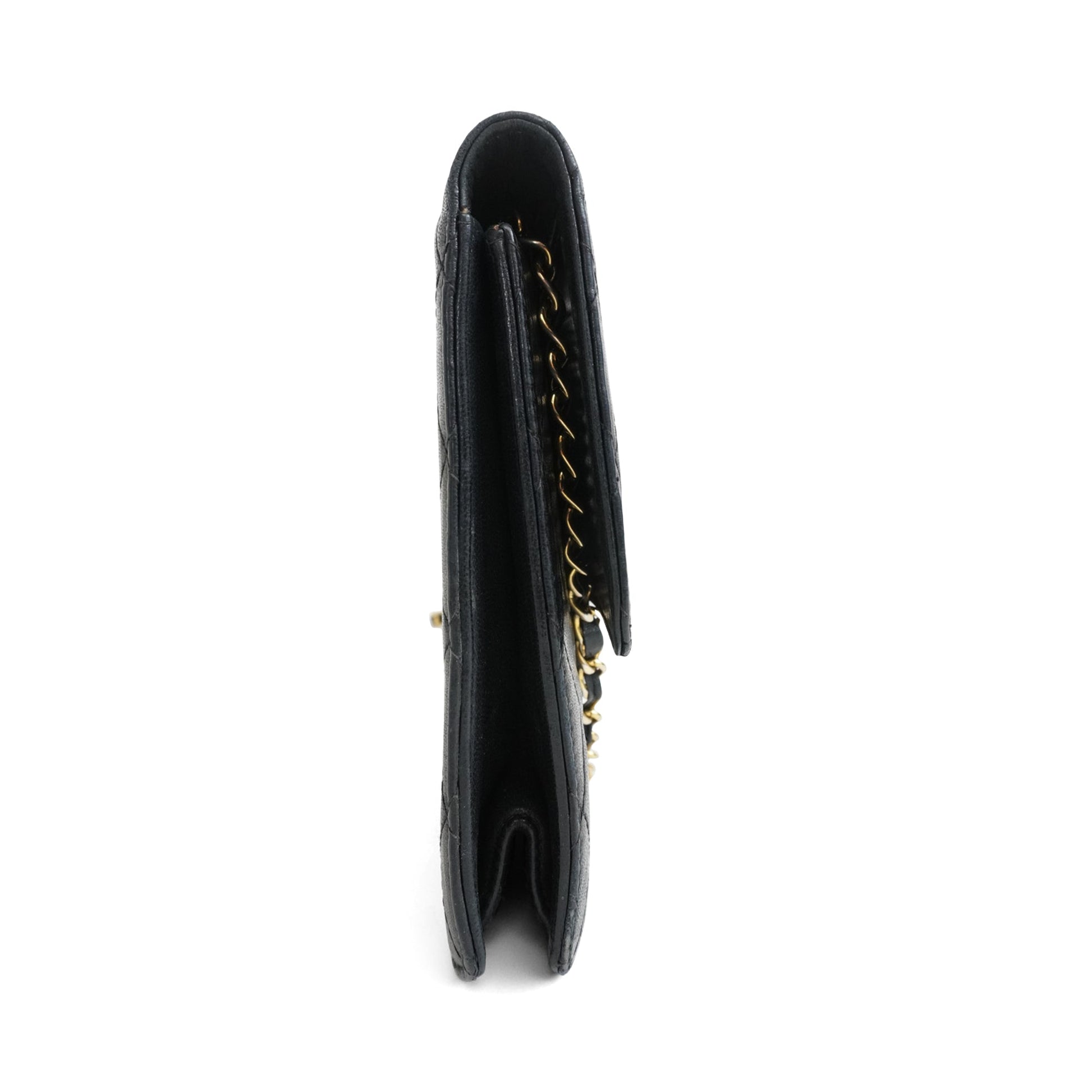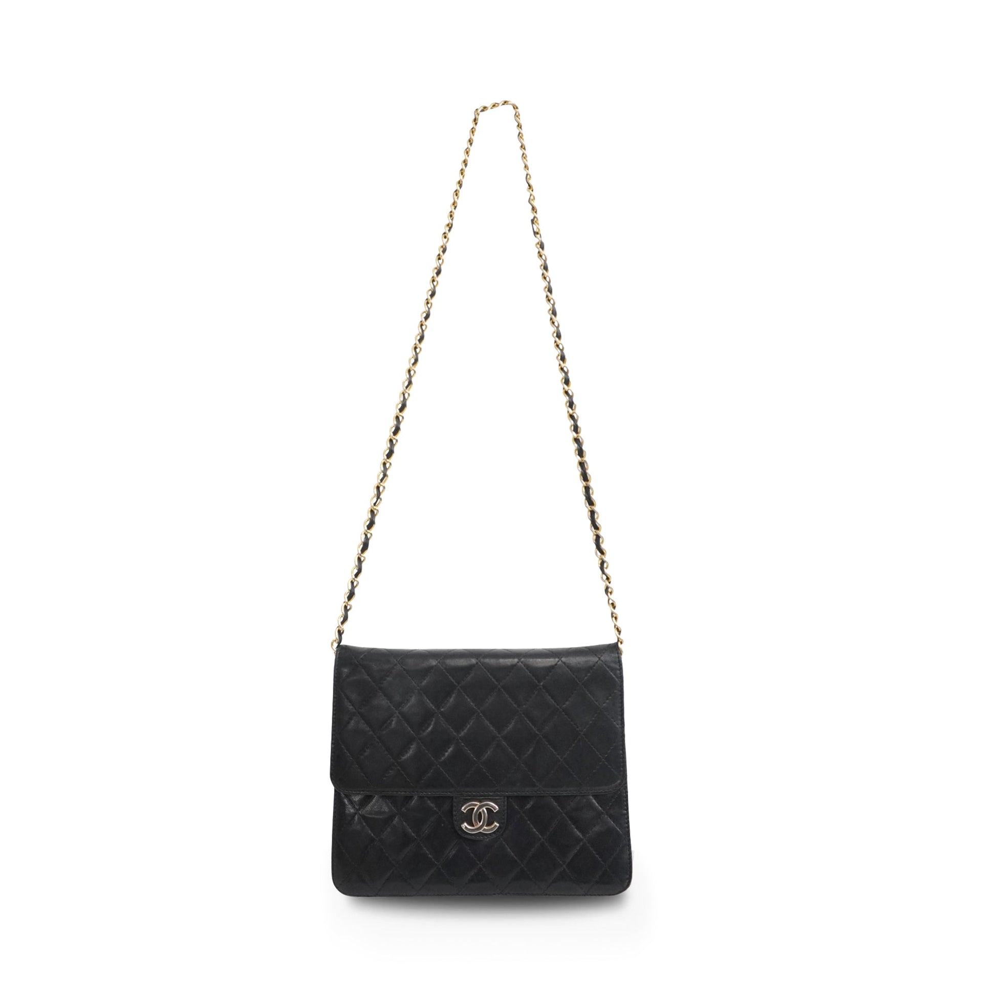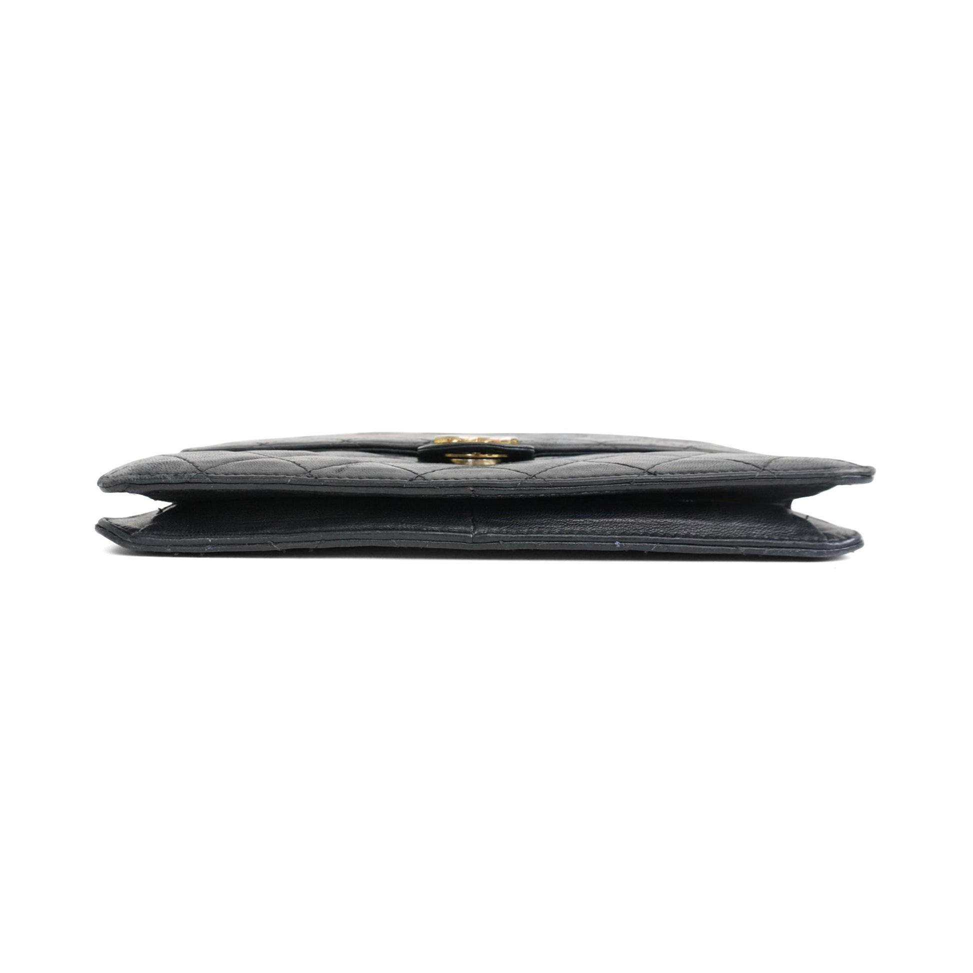 Chanel vintage single flap bag in quilted black lambskin leather with 24kt gold plated hardware and CC logo. Features a magnetic button closure and burgundy leather lining with zip pocket.