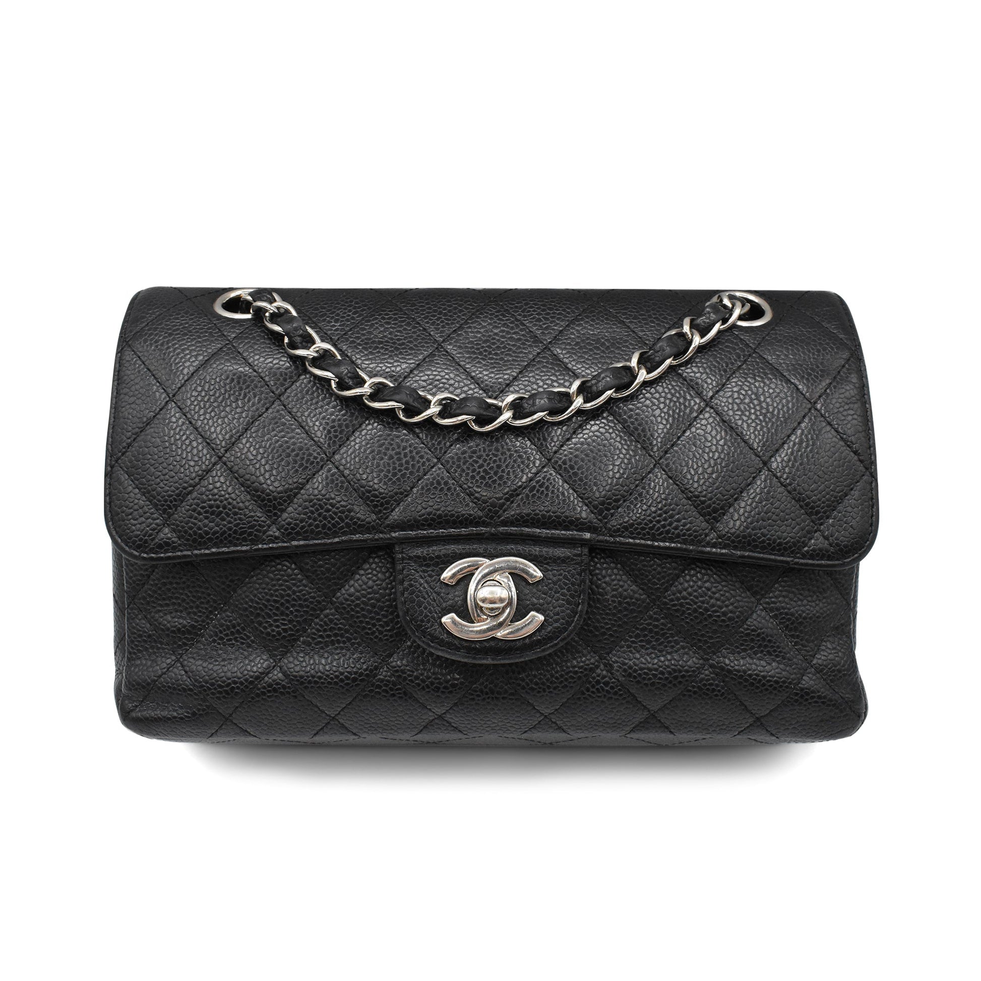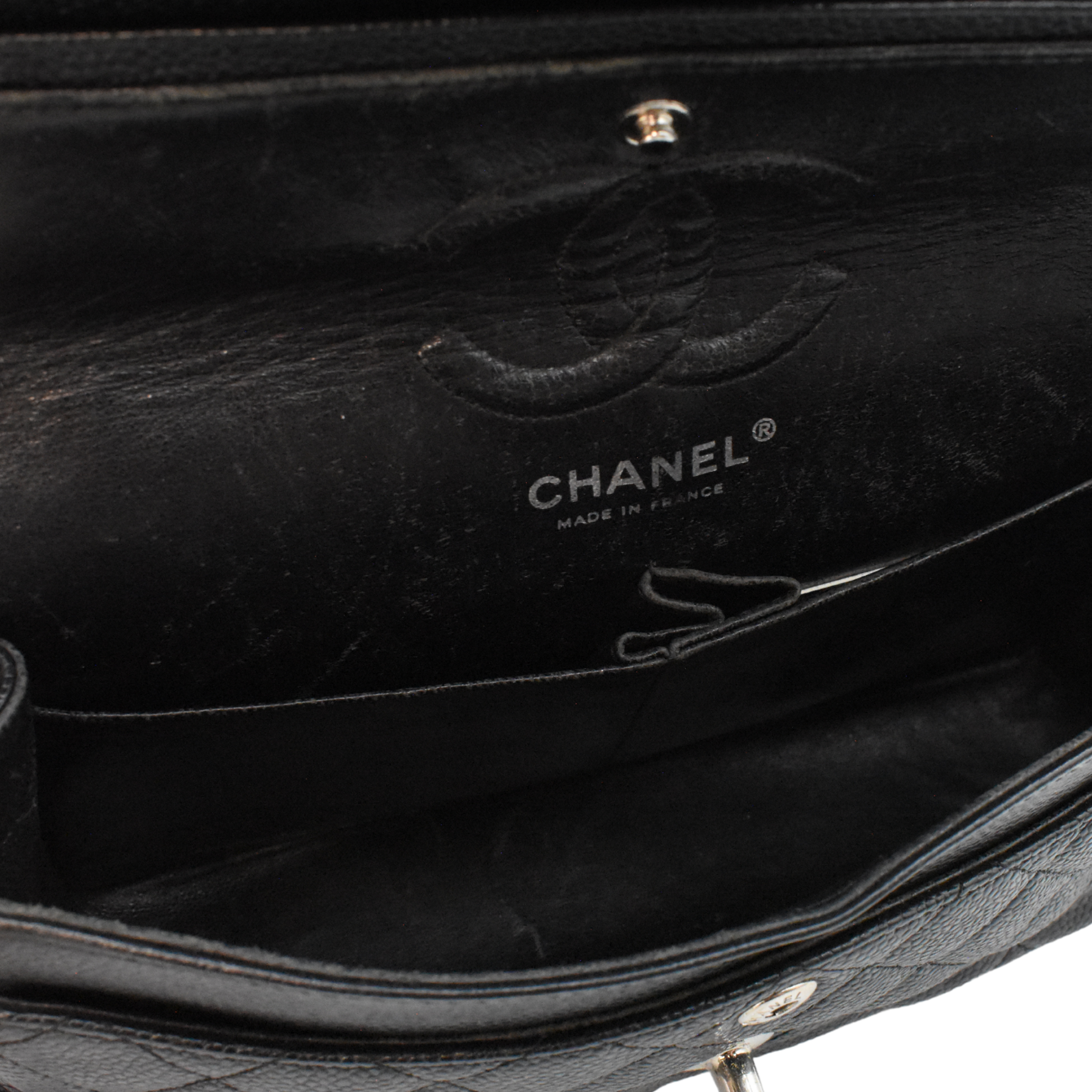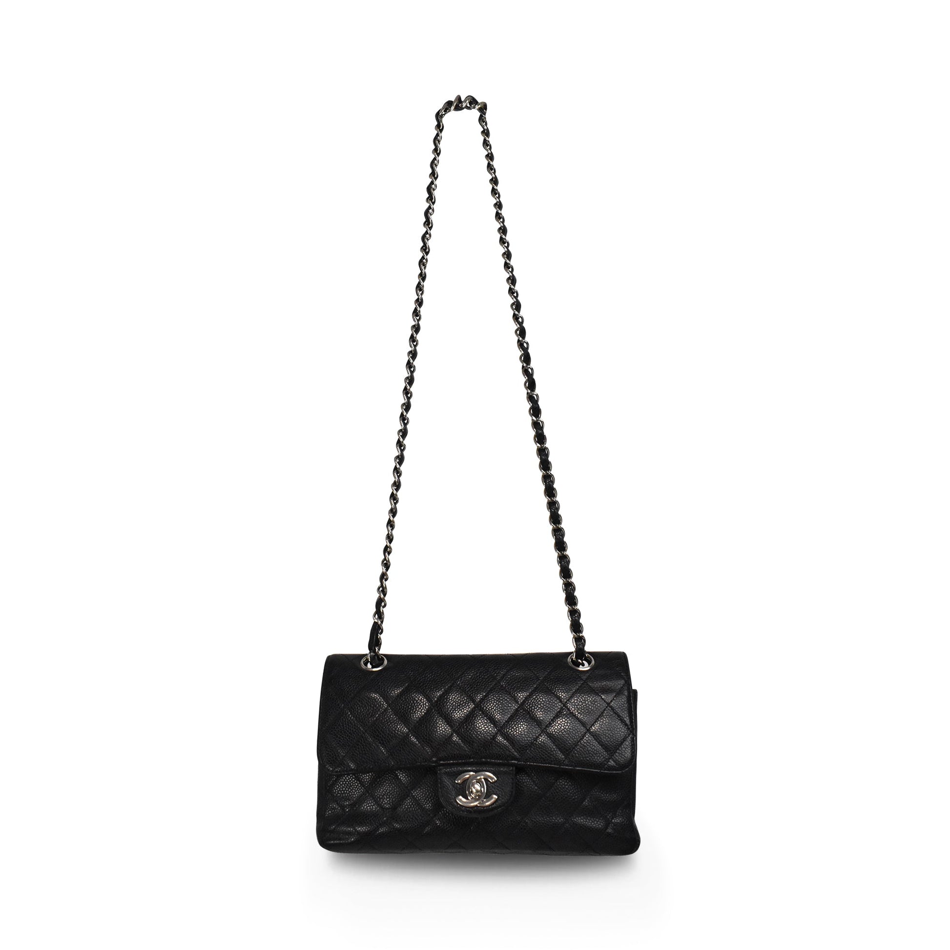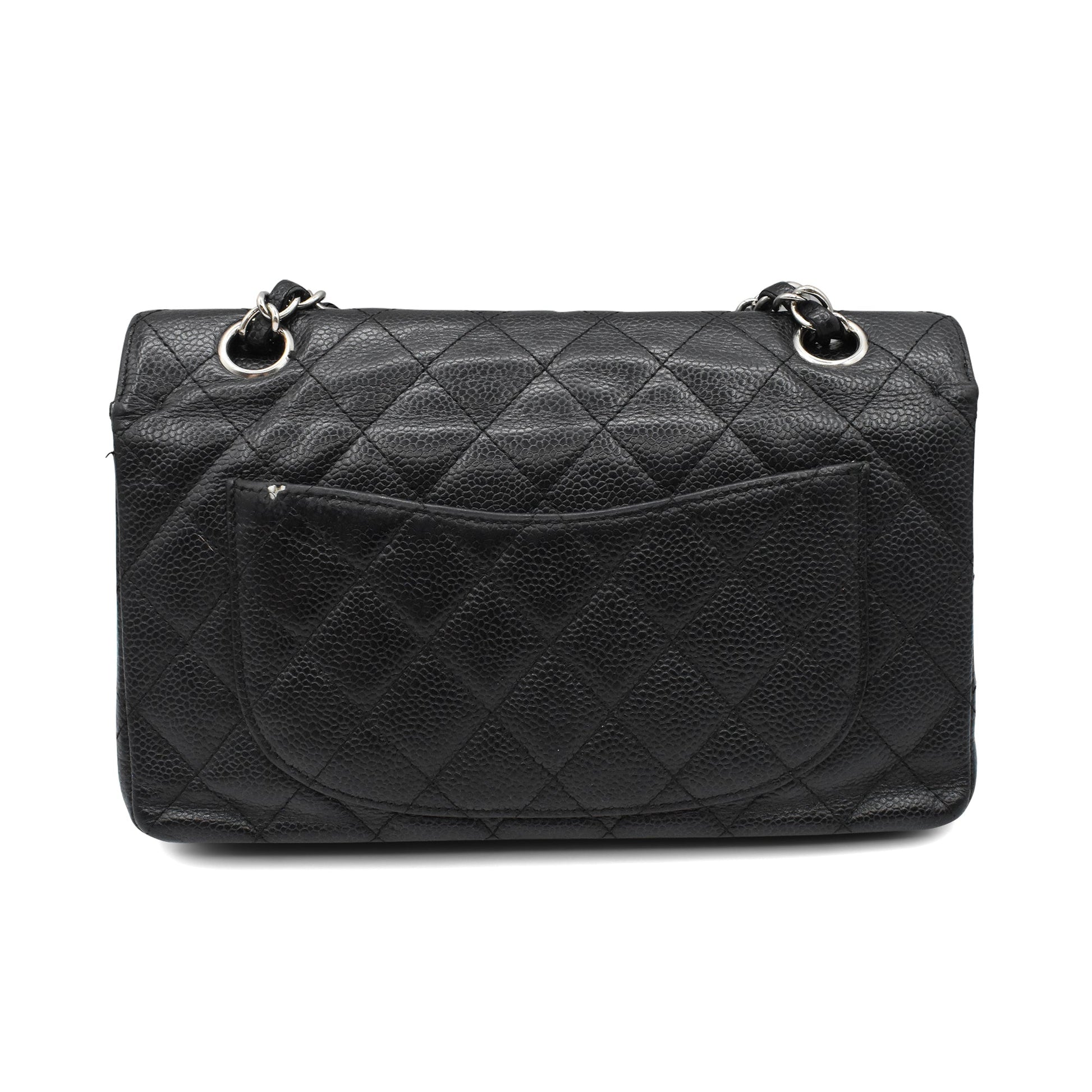 Chanel 'Small Classic Double Flap' in black caviar leather with silver hardware. Features a CC turnlock closure and an interior flap with snap button closure. The bag is fully lined in smooth black leather and features a two slip pockets with a smaller 'lipstick' pocket between them. There is a small zip pocket on the inside of the flap and a slip pocket on the back of the bag.