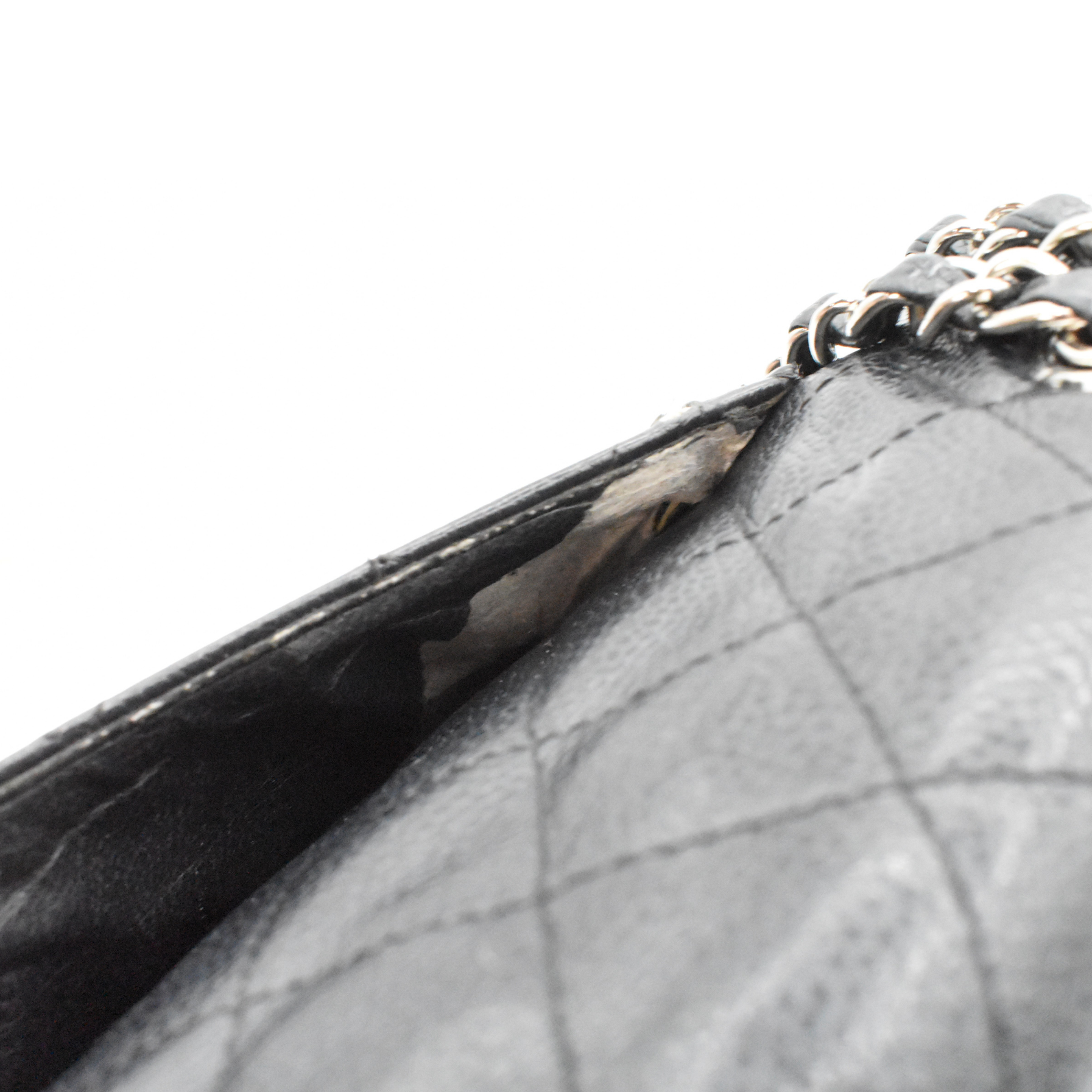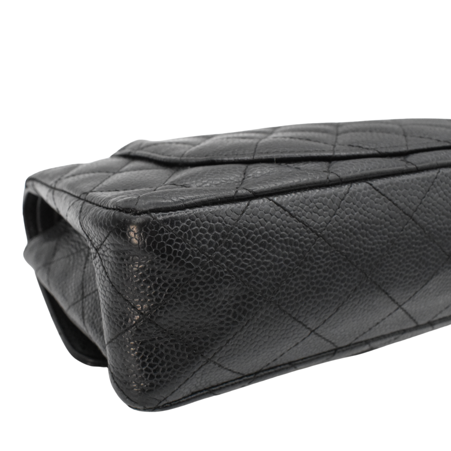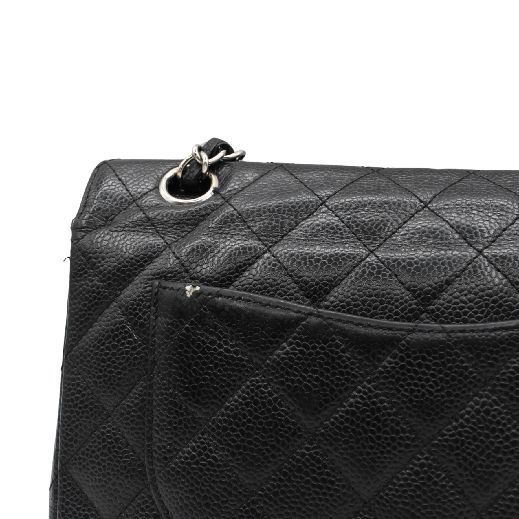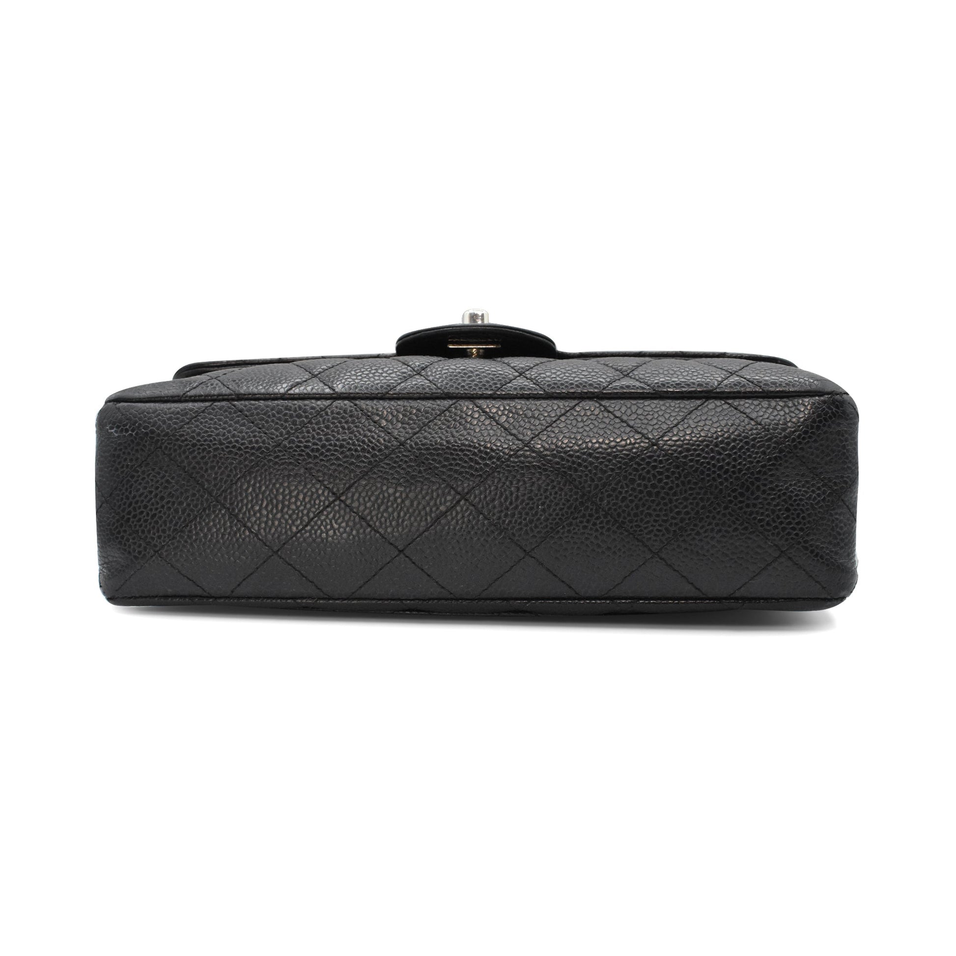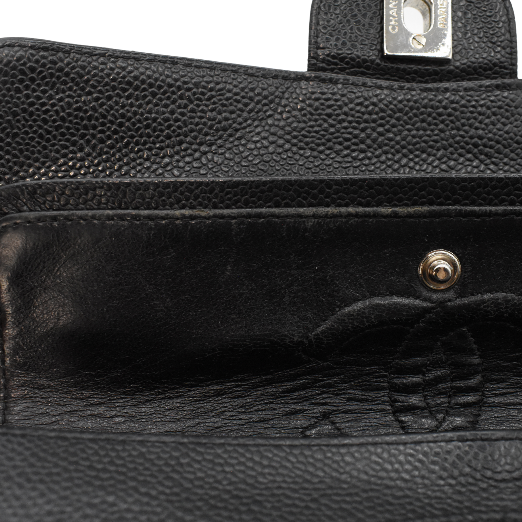 Chanel 'Small Classic Double Flap' in black caviar leather with silver hardware. Features a CC turnlock closure and an interior flap with snap button closure. The bag is fully lined in smooth black leather and features a two slip pockets with a smaller 'lipstick' pocket between them. There is a small zip pocket on the inside of the flap and a slip pocket on the back of the bag.