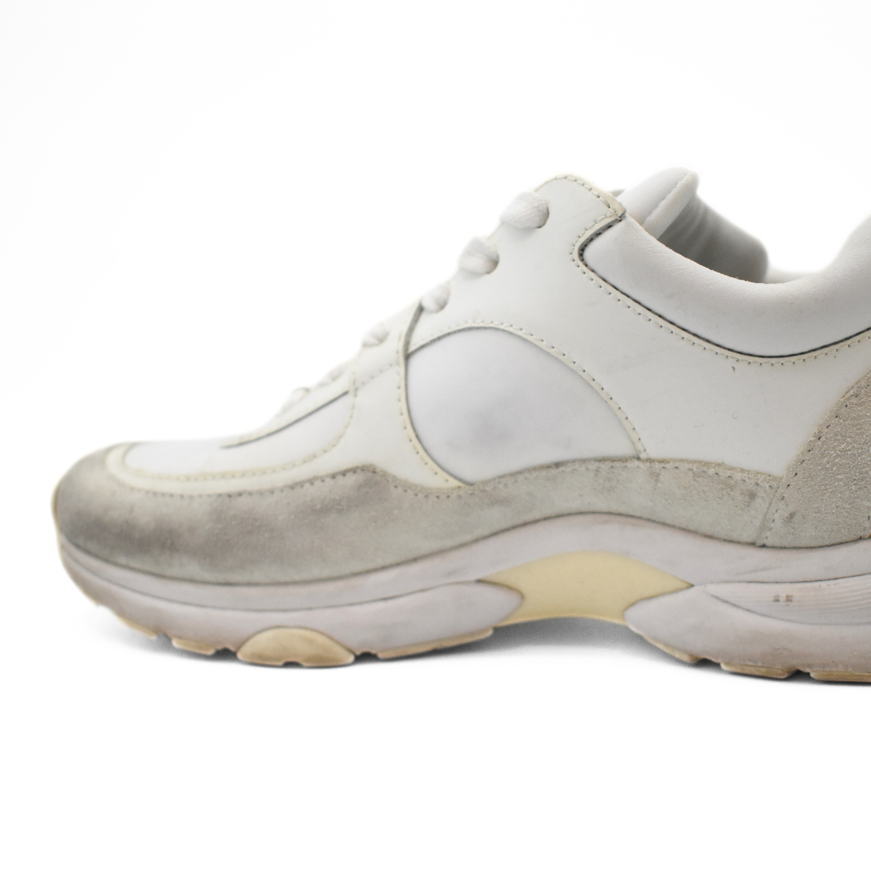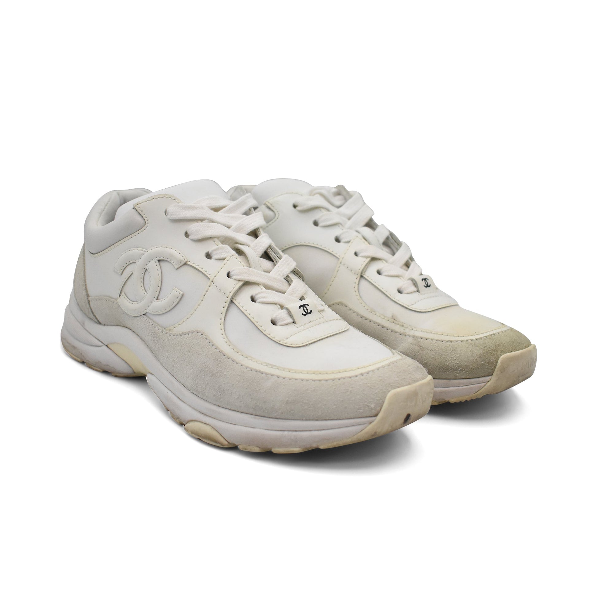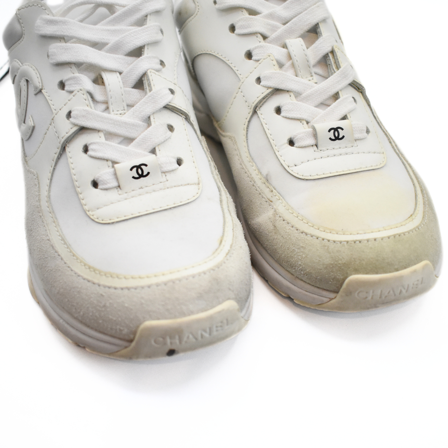 Chanel low-top sneakers in white leather with light grey suede panelling. Features 'CC' leather logo patch on the sides, flat white laces, black logo on the front laces, and white sole.