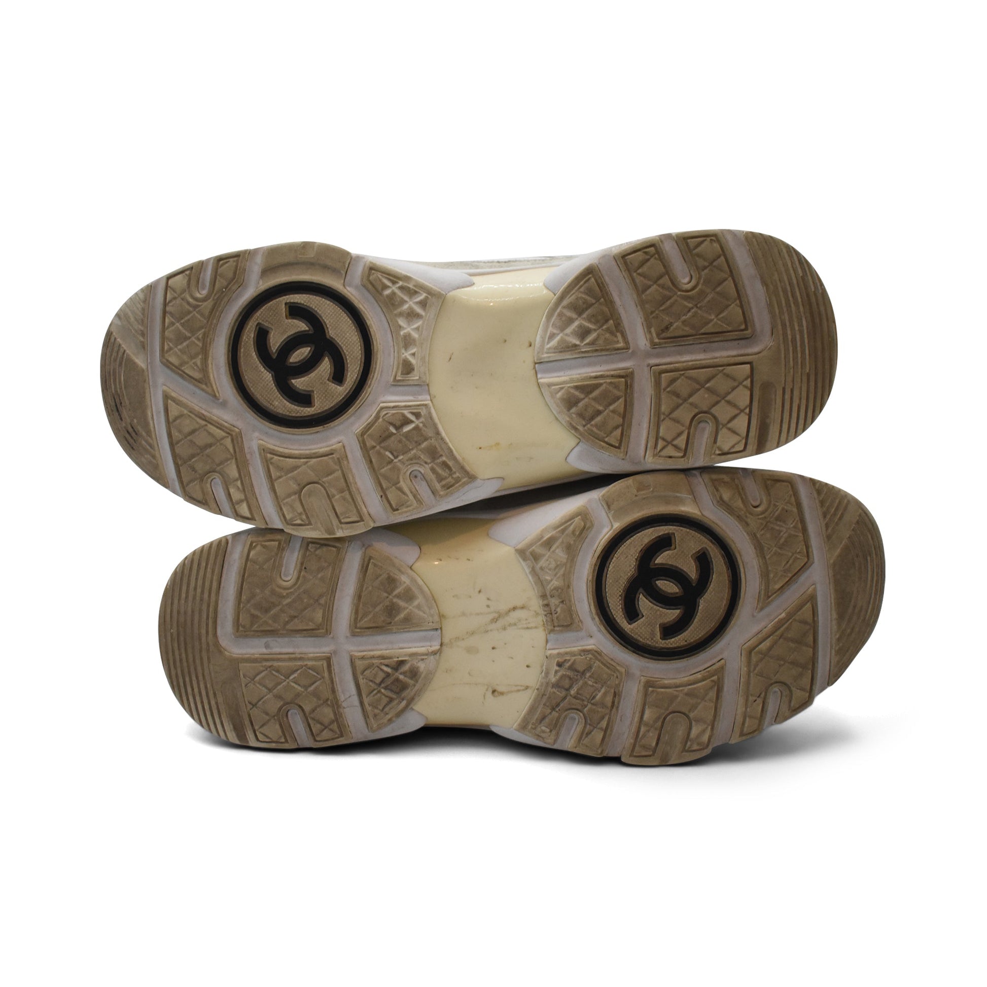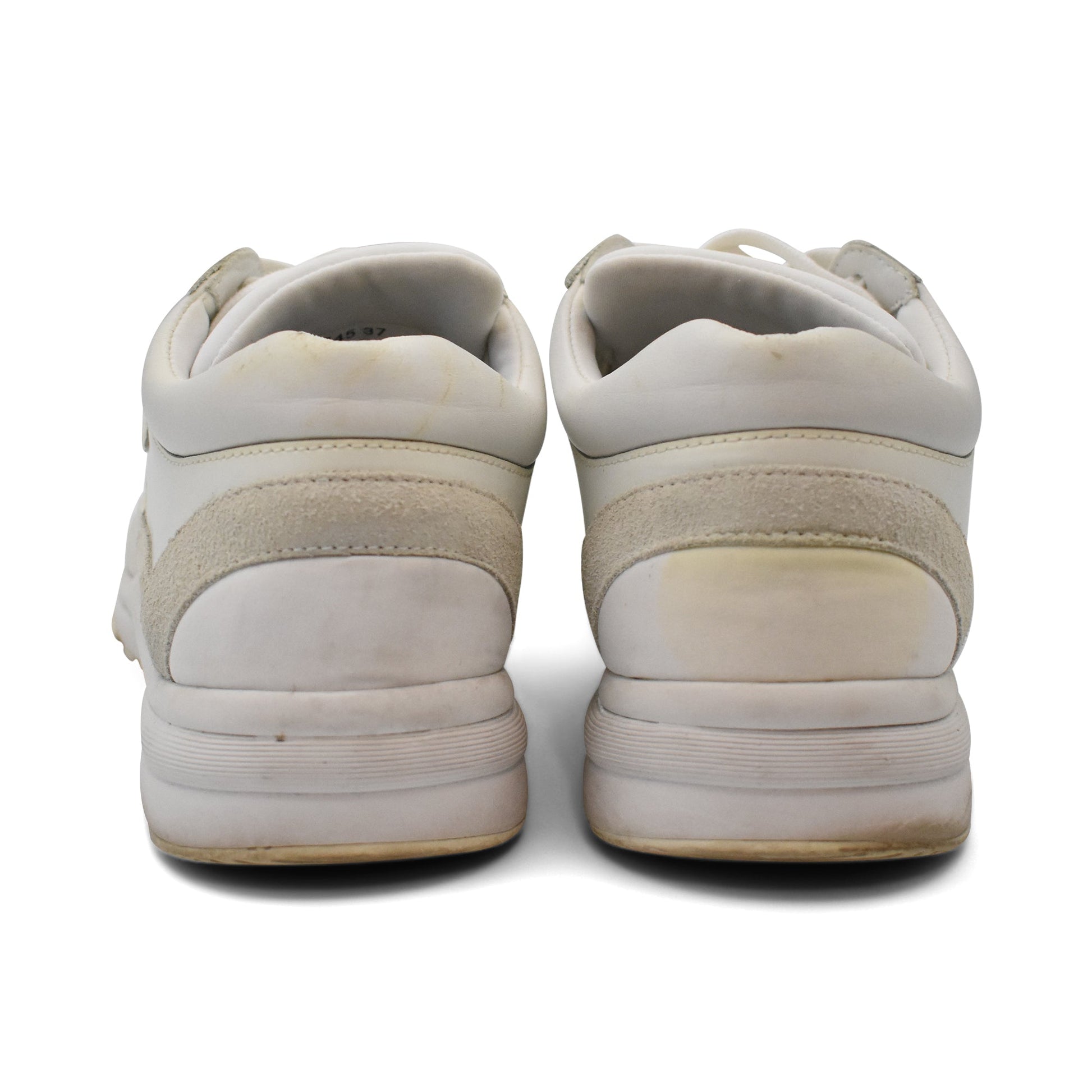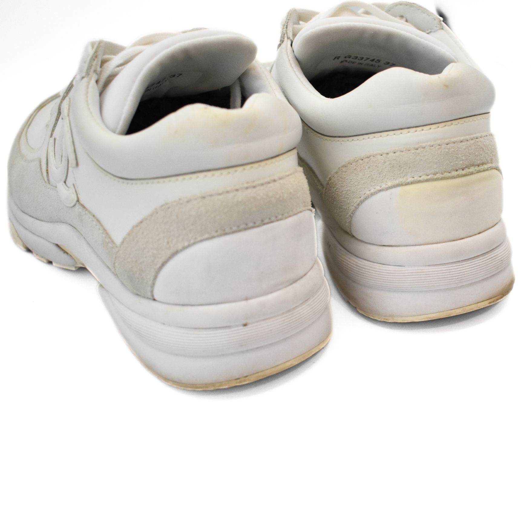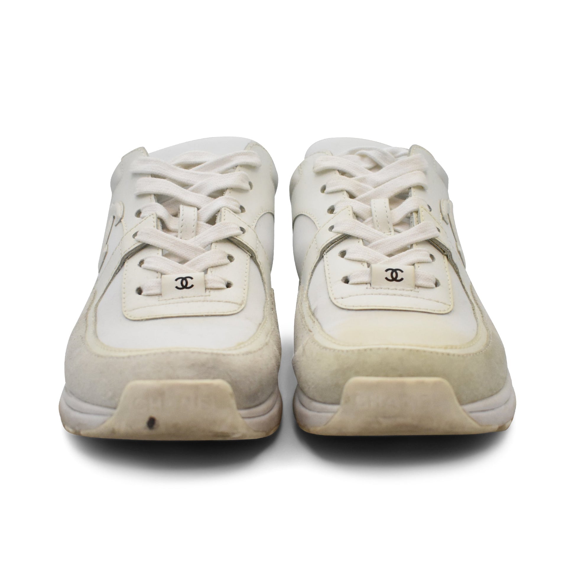 Chanel low-top sneakers in white leather with light grey suede panelling. Features 'CC' leather logo patch on the sides, flat white laces, black logo on the front laces, and white sole.