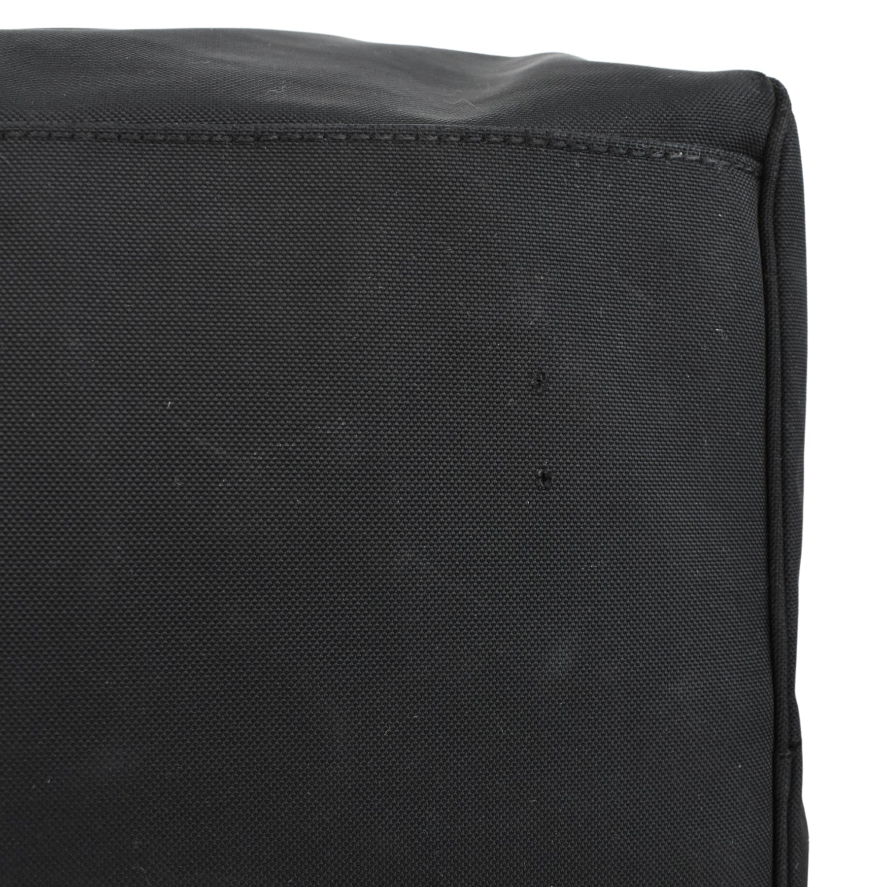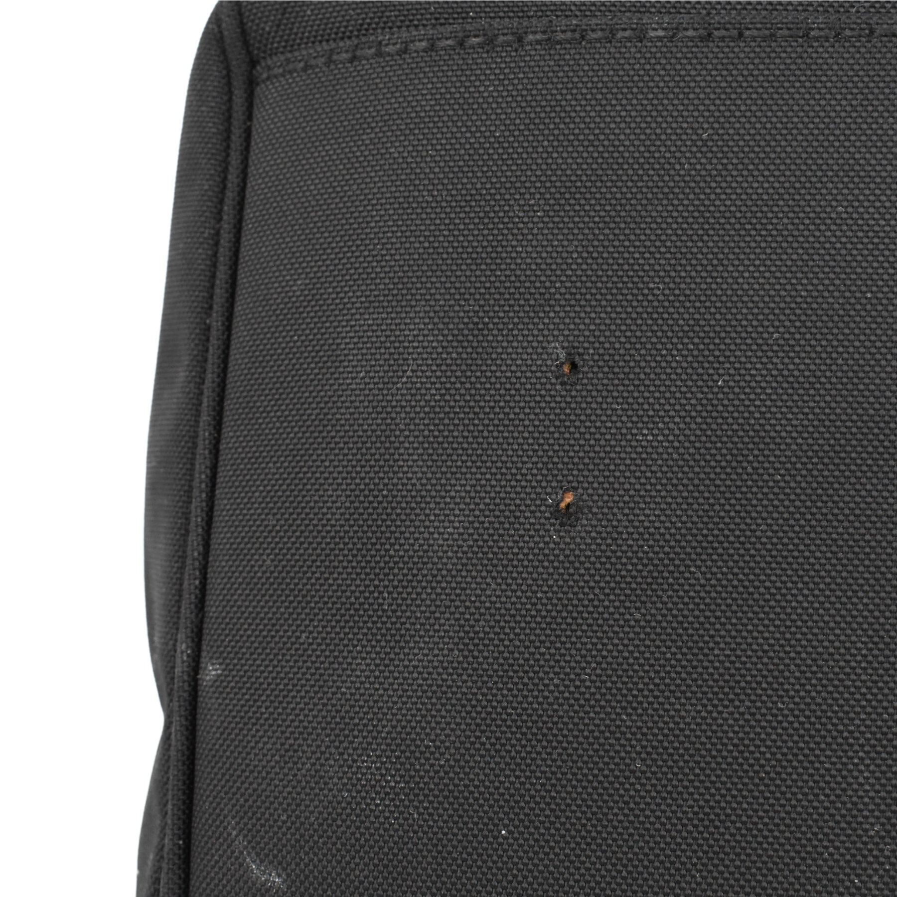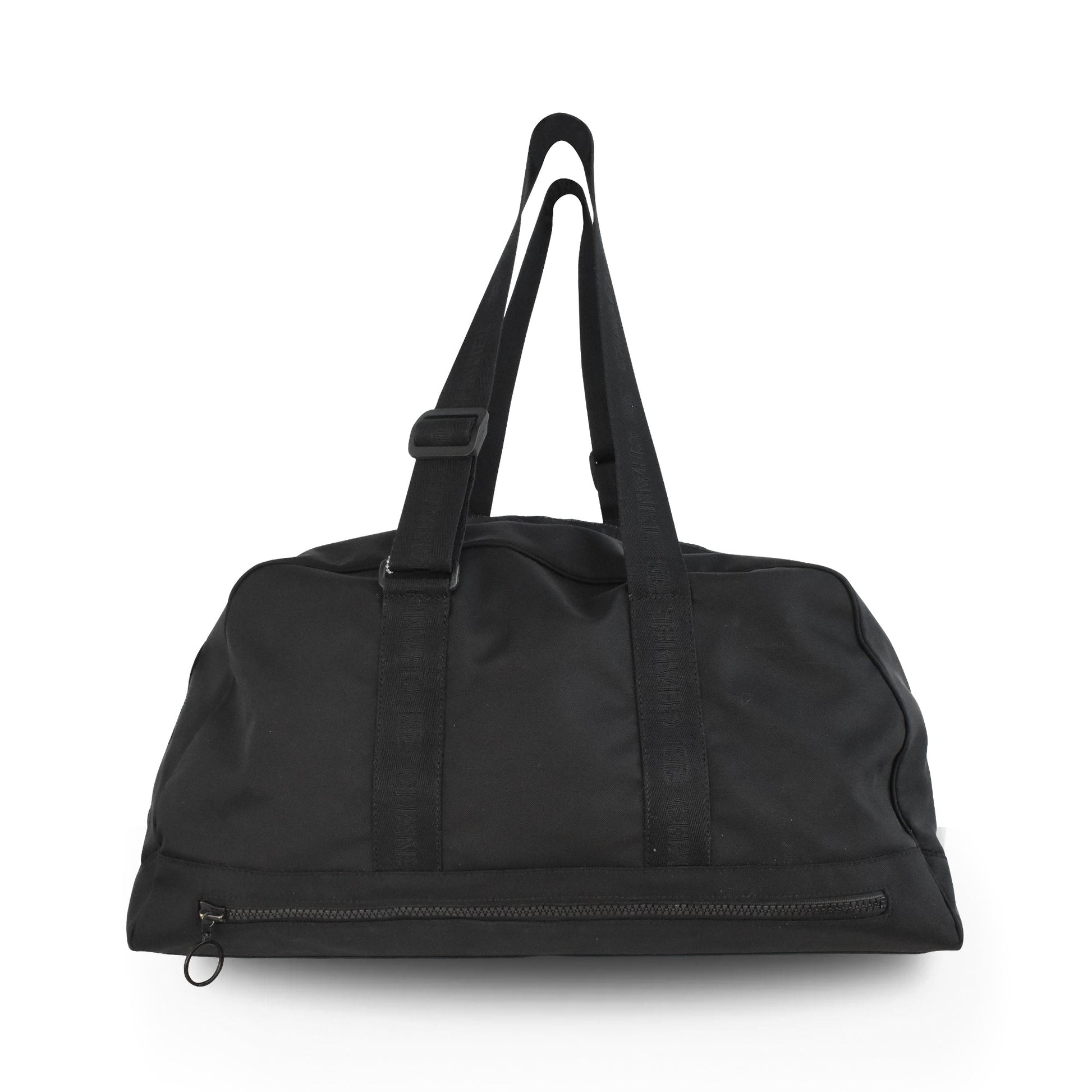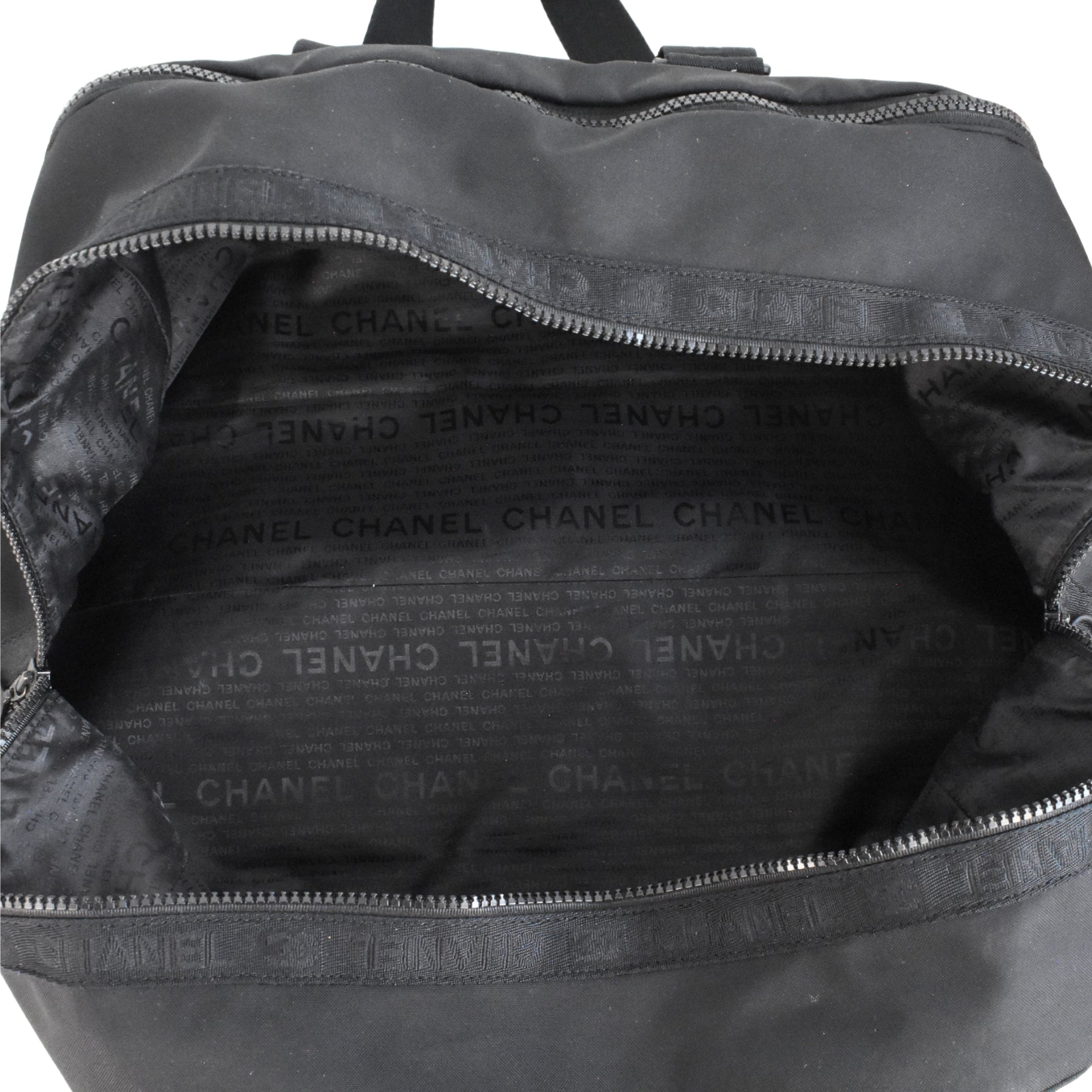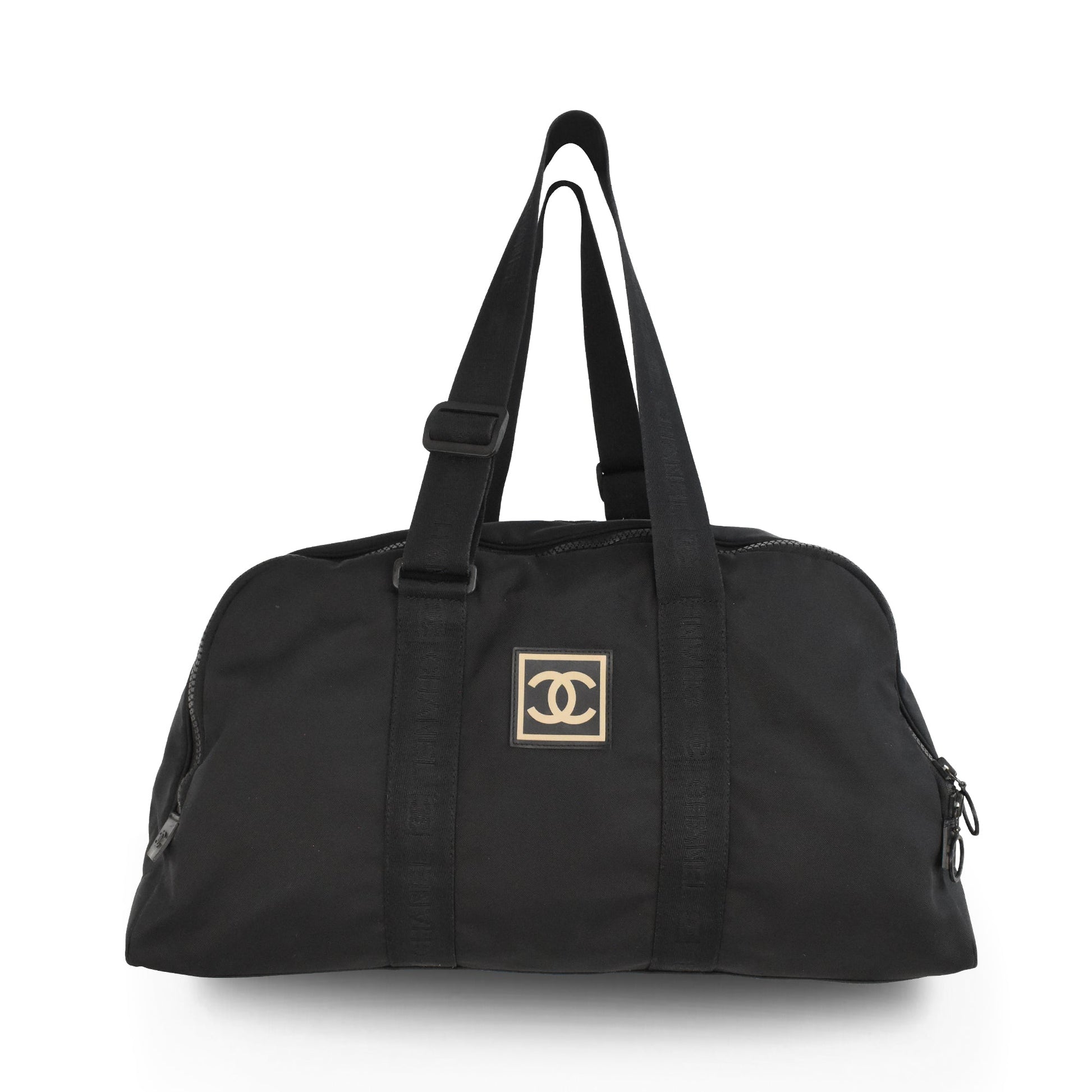 Chanel 'Sport' duffle bag in black canvas with a tonal monogram ribbon trim and a cream rubber 'CC' logo on the front. The bag has a large front zip pocket and a full zip opening in black hardware revealing a black canvas inner lining with zip and slip pockets.