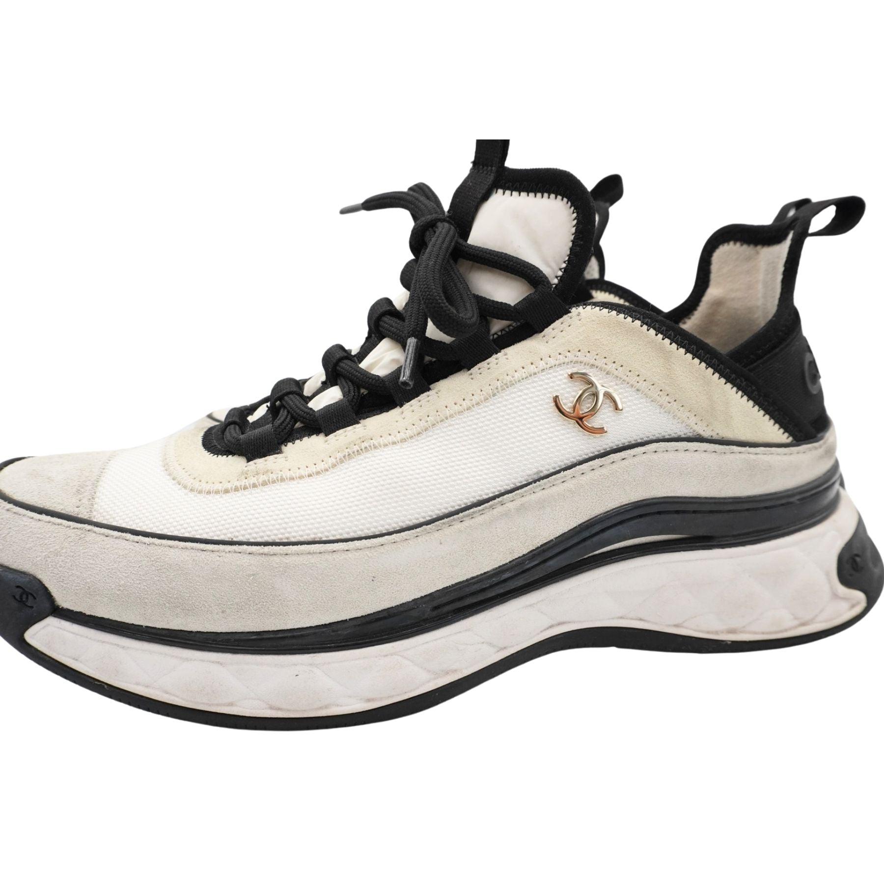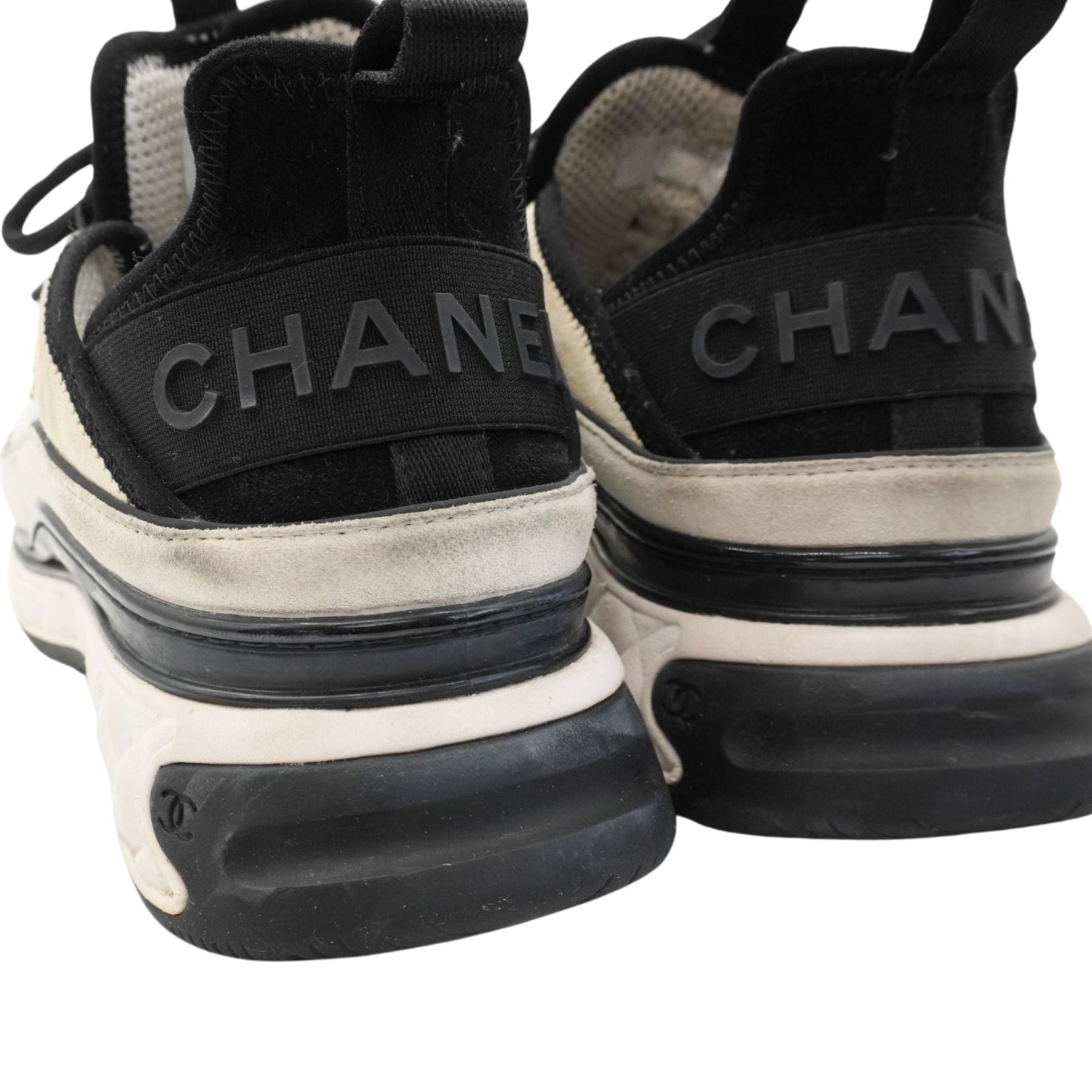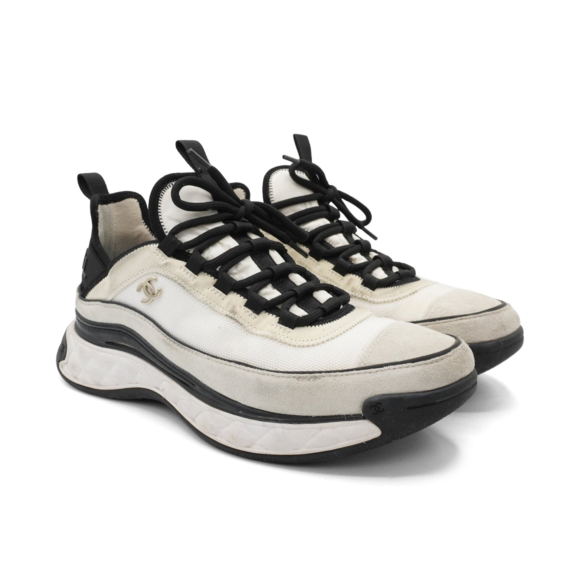 Chanel sporty low top sneakers in white mesh with grey and cream suede details and black rubberized logo across the back of the heel. Feature gold metal CC details and quilted midsoles.