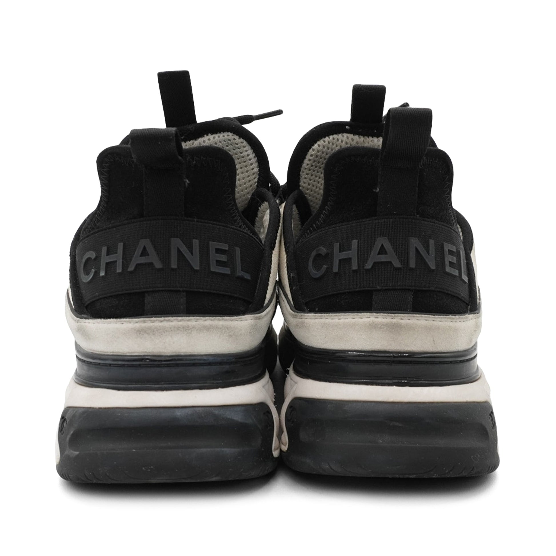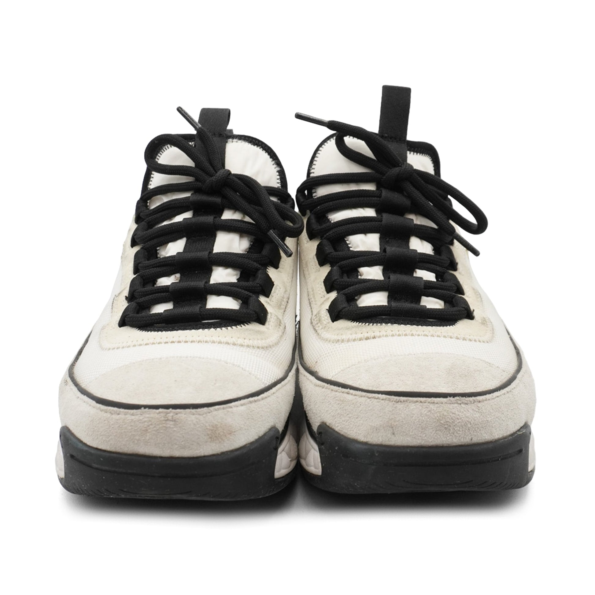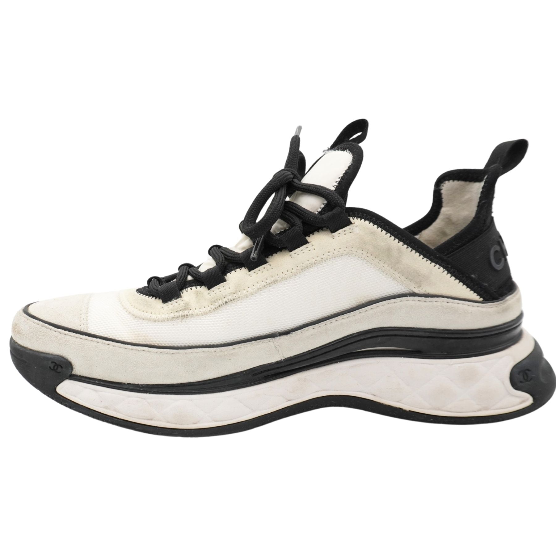 Chanel sporty low top sneakers in white mesh with grey and cream suede details and black rubberized logo across the back of the heel. Feature gold metal CC details and quilted midsoles.