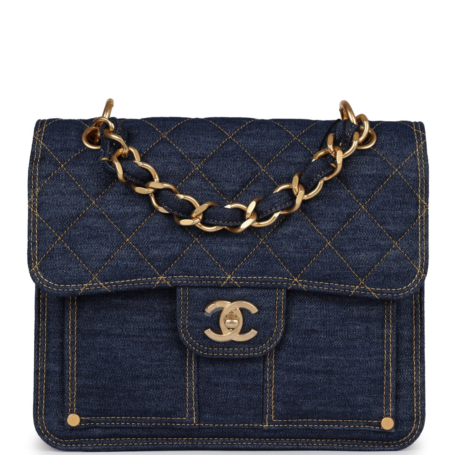 Chanel Square Flap Backpack Blue Denim Antique Gold Hardware