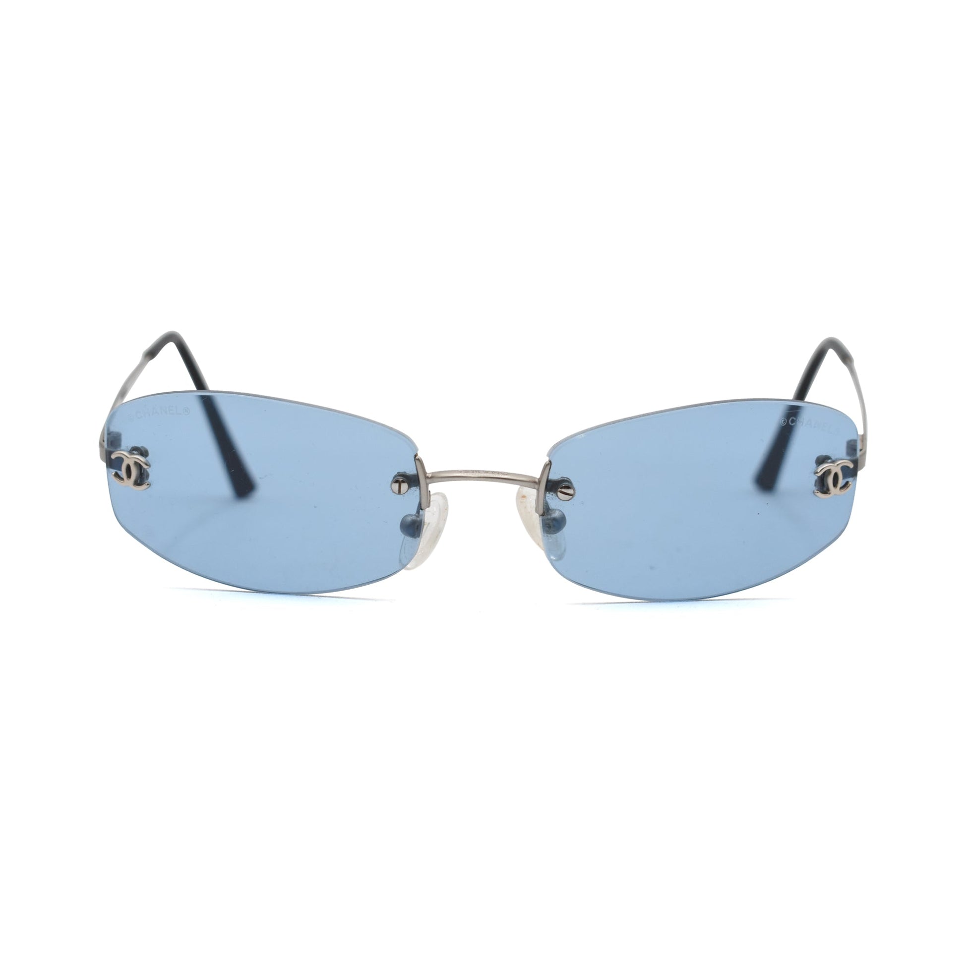Chanel vintage sunglasses in silver metal hardware with small blue frameless lenses, black acetate arms, and a silver 'CC' logo on the lens.