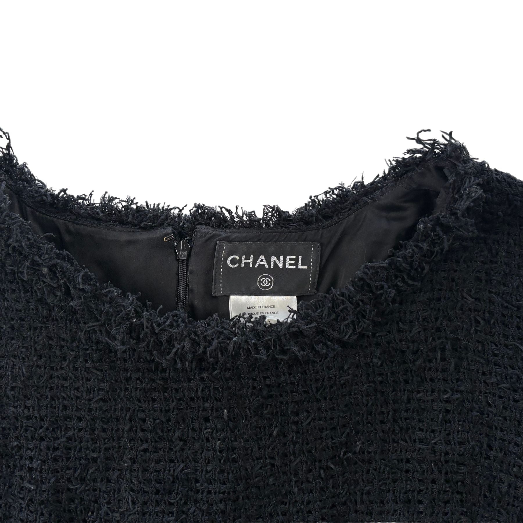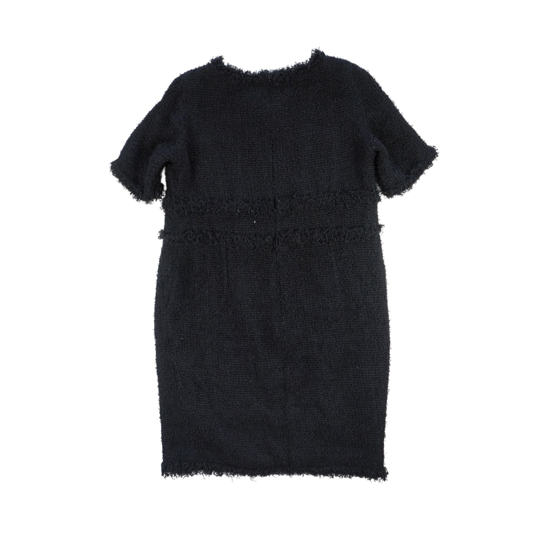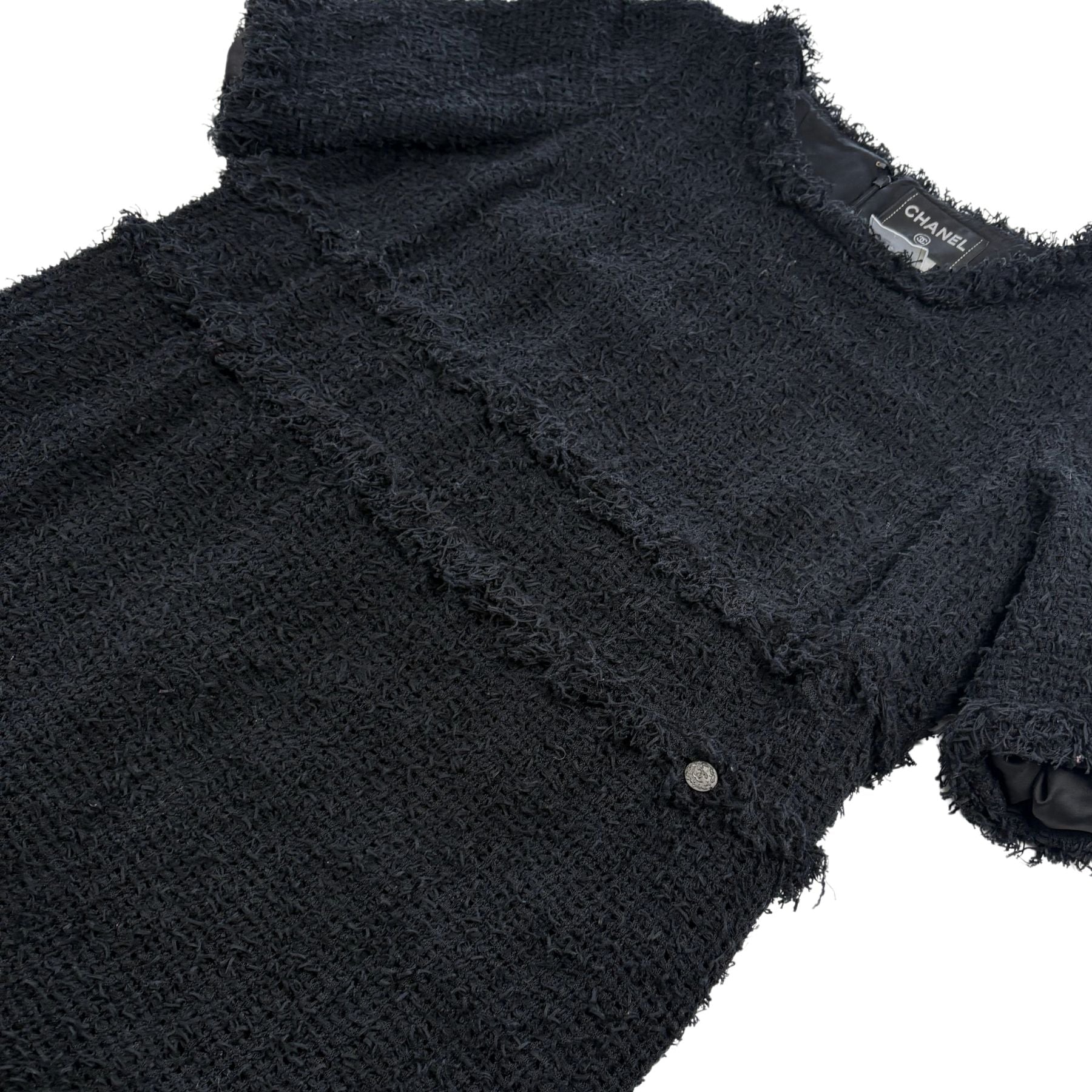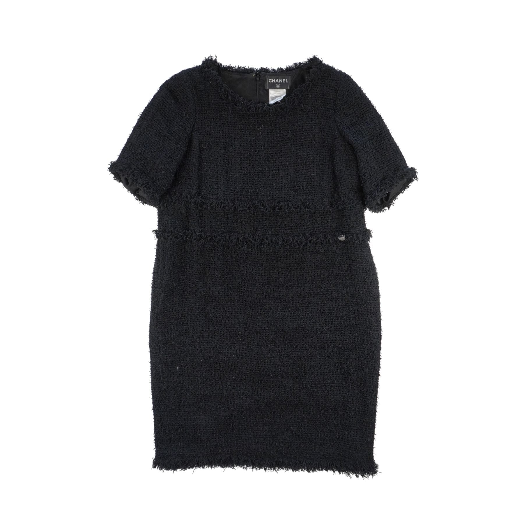 Chanel 'Timeless' sheath dress in black cotton tweed with short sleeves, a crew neckline, a frayed trim, and a small 'CC' logo button on the waist in gunmetal hardware. The dress has a hidden back-zip opening in black hardware.