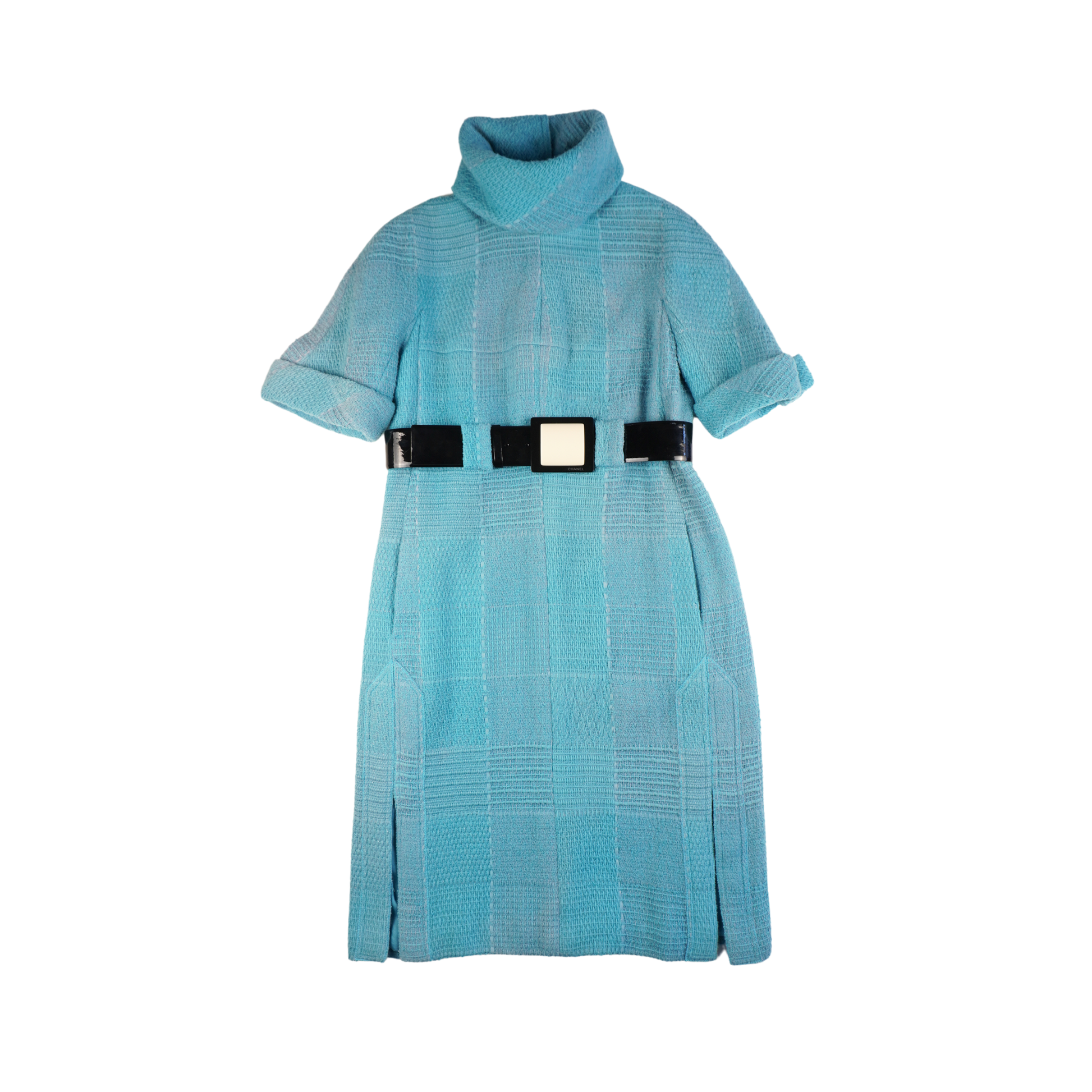 Chanel turtleneck dress in bright blue tweed with a black half-button closure with gunmetal chain detailing on the buttons, cuffed sleeves, and a black patent leather belt at the waist. From the F/W 2007 collection.