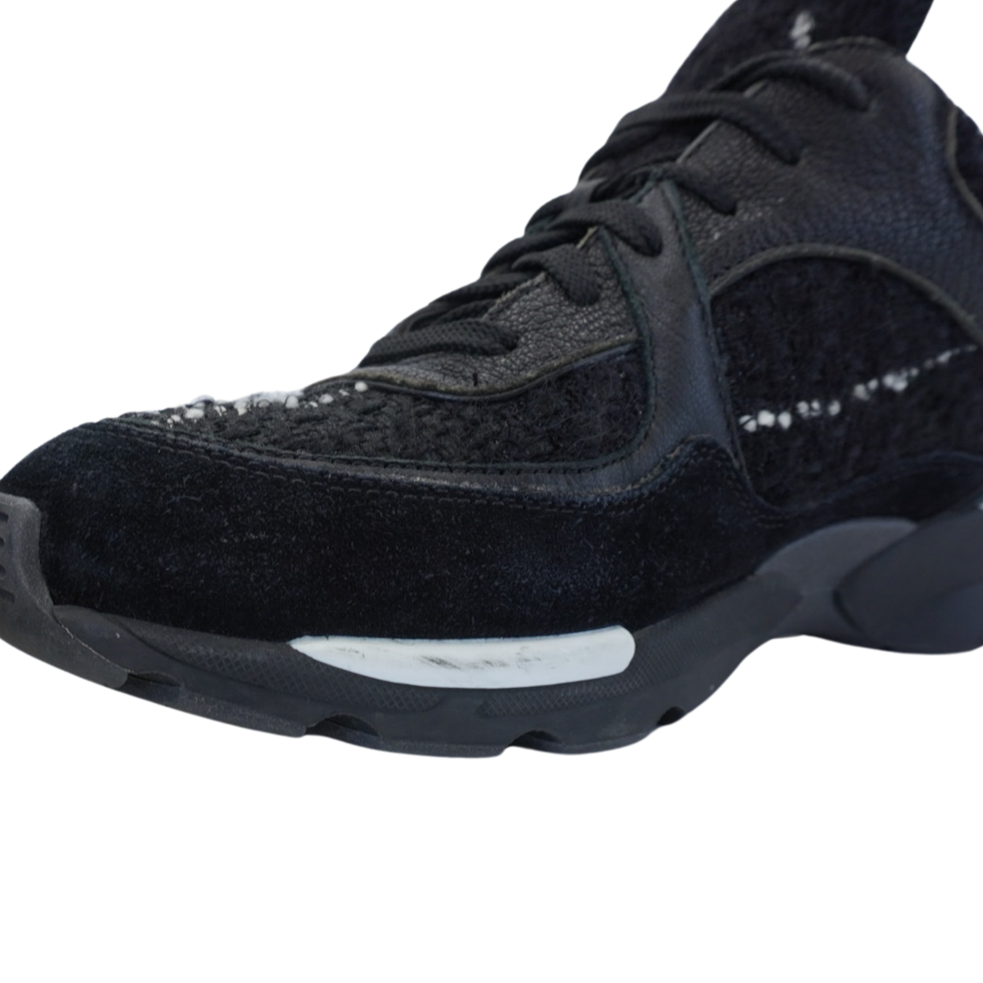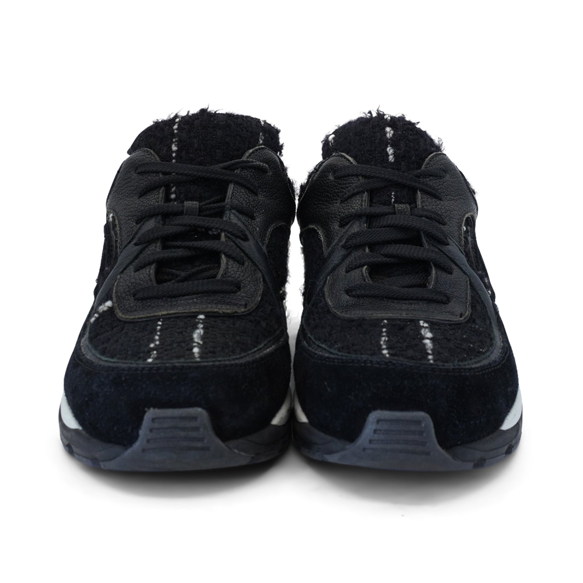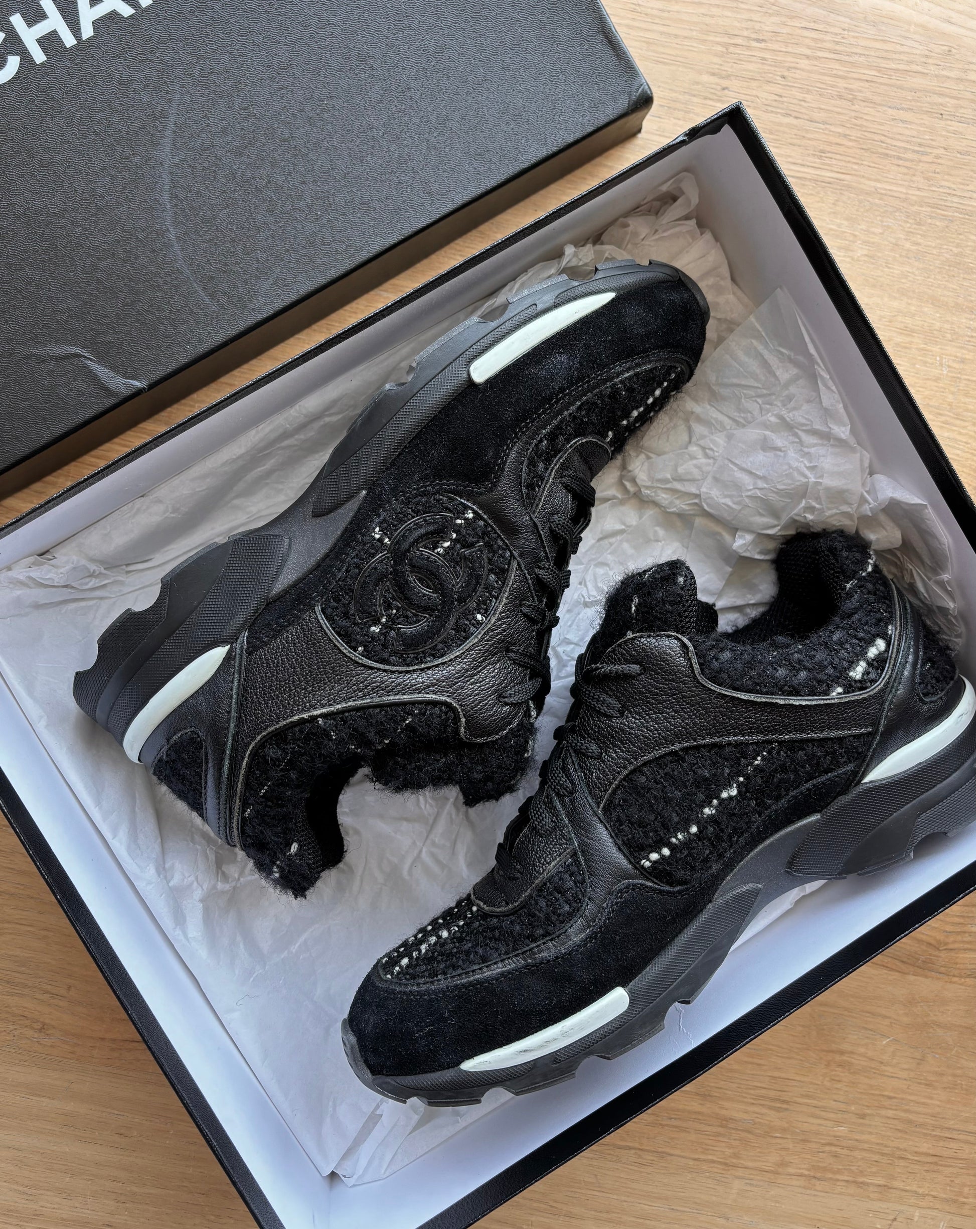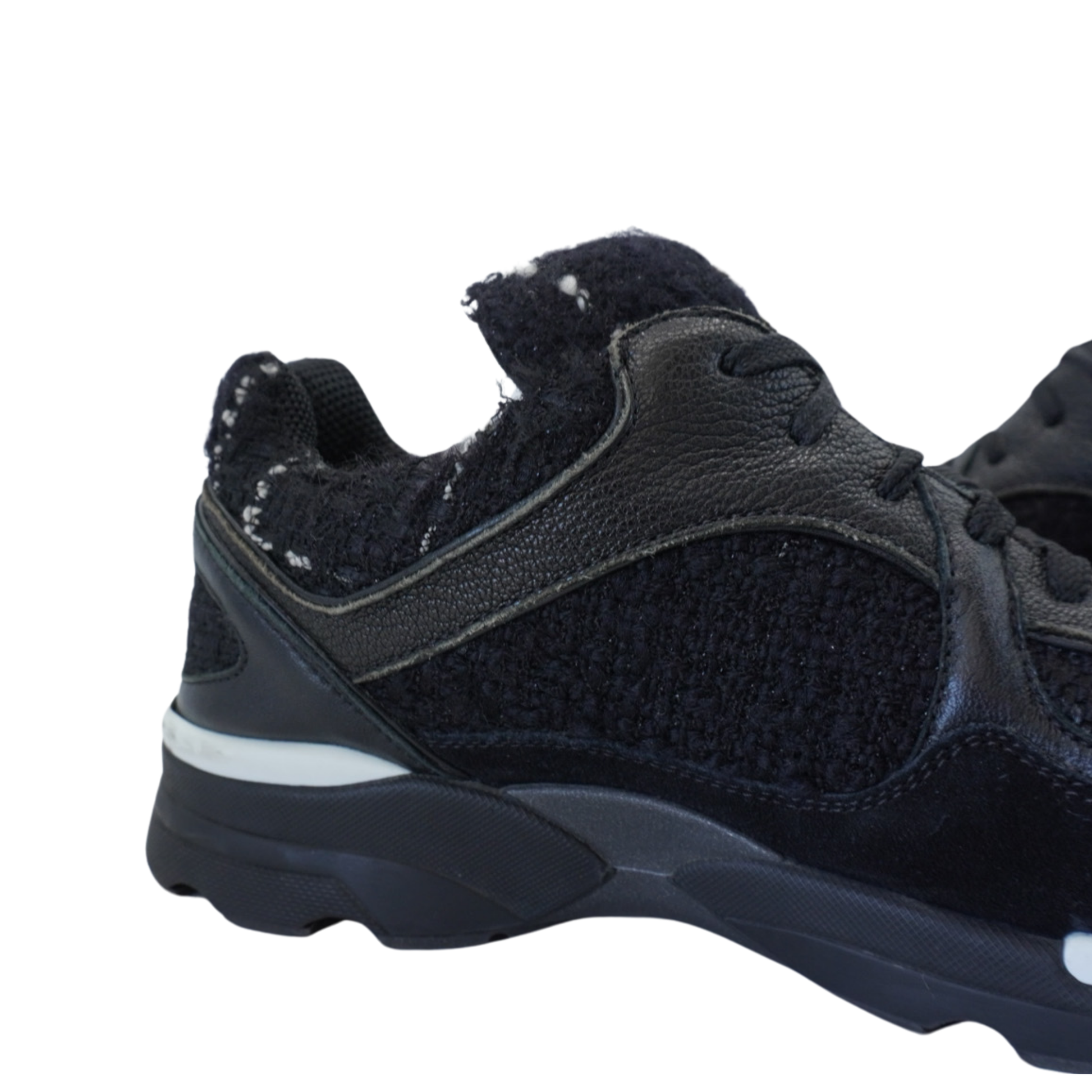 Chanel chunky sneakers in black tweed with leather and suede panels and 'CC' patches on the sides.