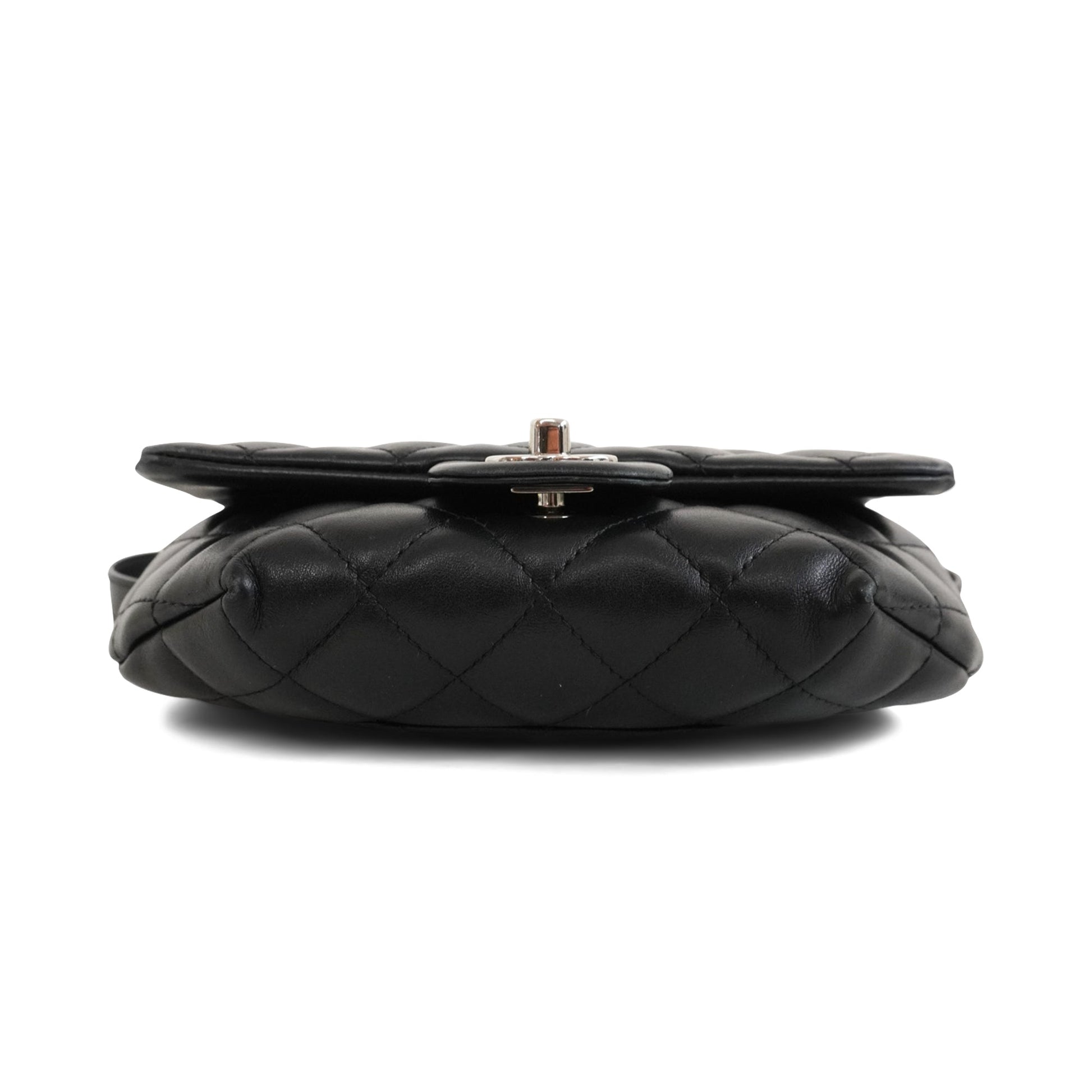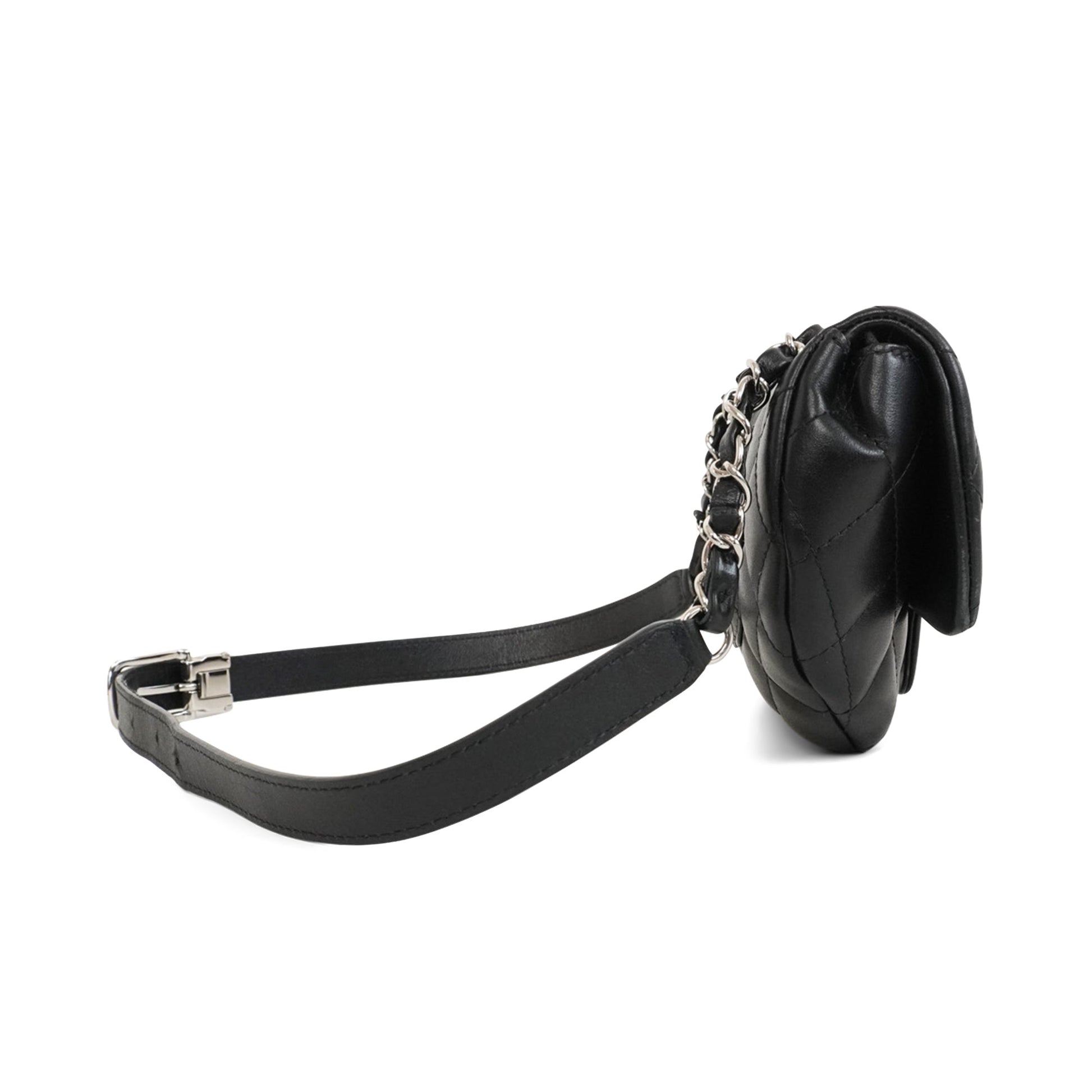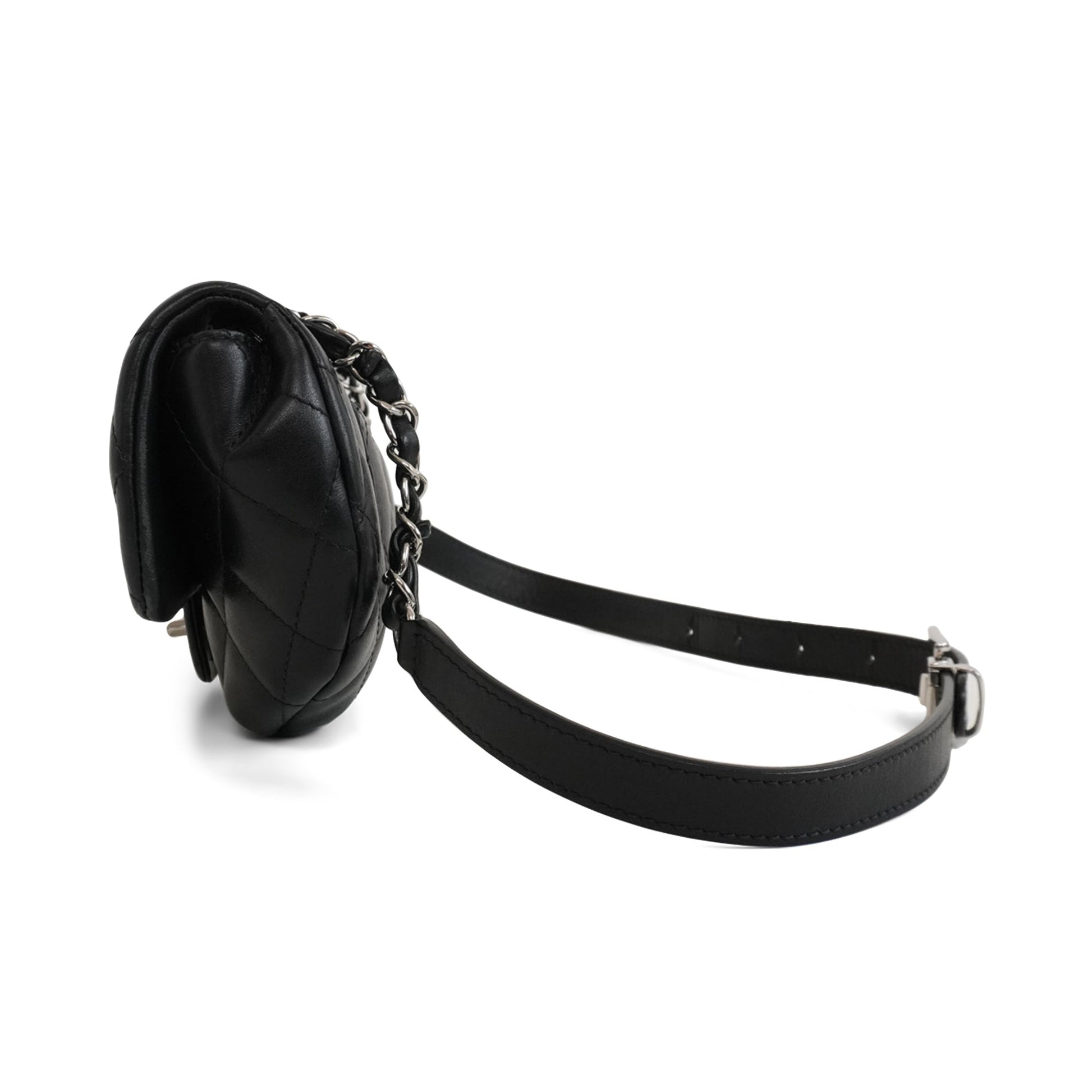 Chanel Uniform waist bag in black quilted leather with an adjustable strap, a back slip pocket, a top flap opening with a silver 'CC' turnlock closure, and a canvas lined interior with dual compartments.