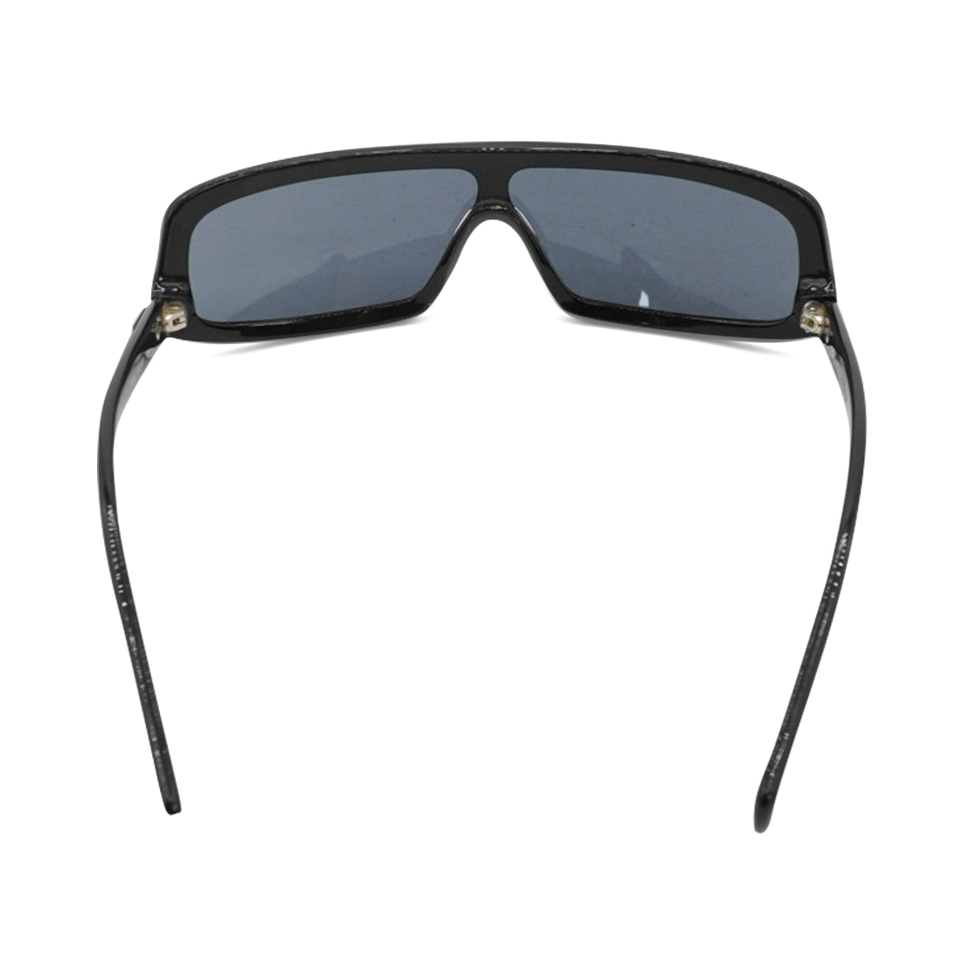Chanel vintage shield sunglasses in black acetate with upside down appearing arms that feature silver logo engraving.