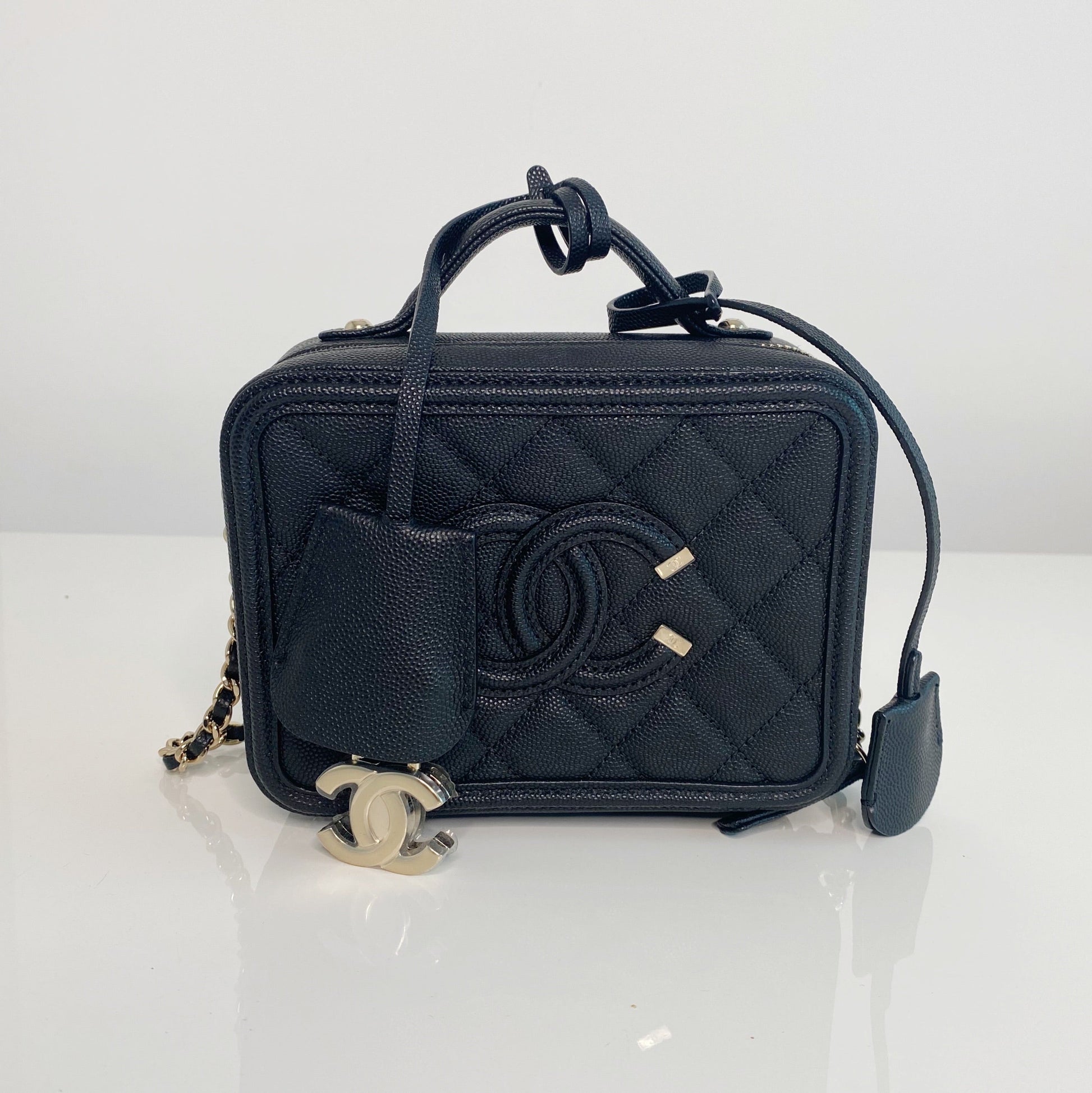Crafted from durable black caviar leather, this small Chanel vanity case features a chunky cc charm and gold hardware. Carry with its top handle or as a cross body with the shoulder strap.