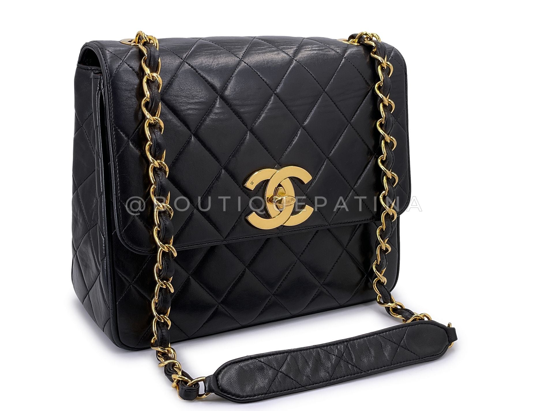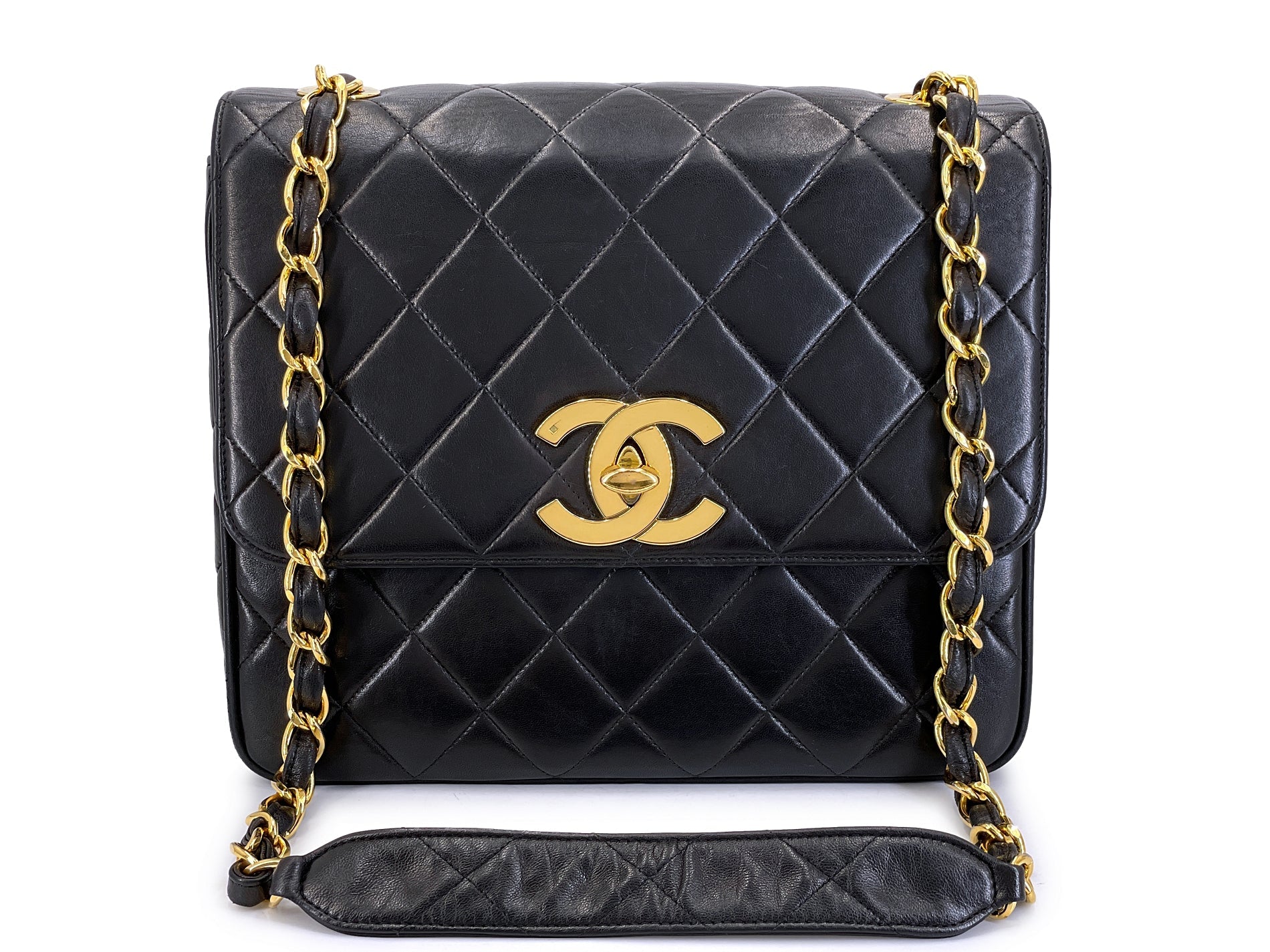 The large gold CC closure is a great contrast to the black lambskin. Single chunky gold woven chain has padded caviar center for comfort. Vertical "square" shape adds versatility and ultra-chic style.