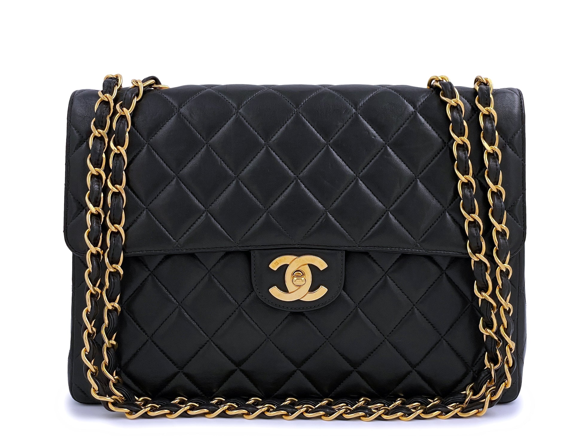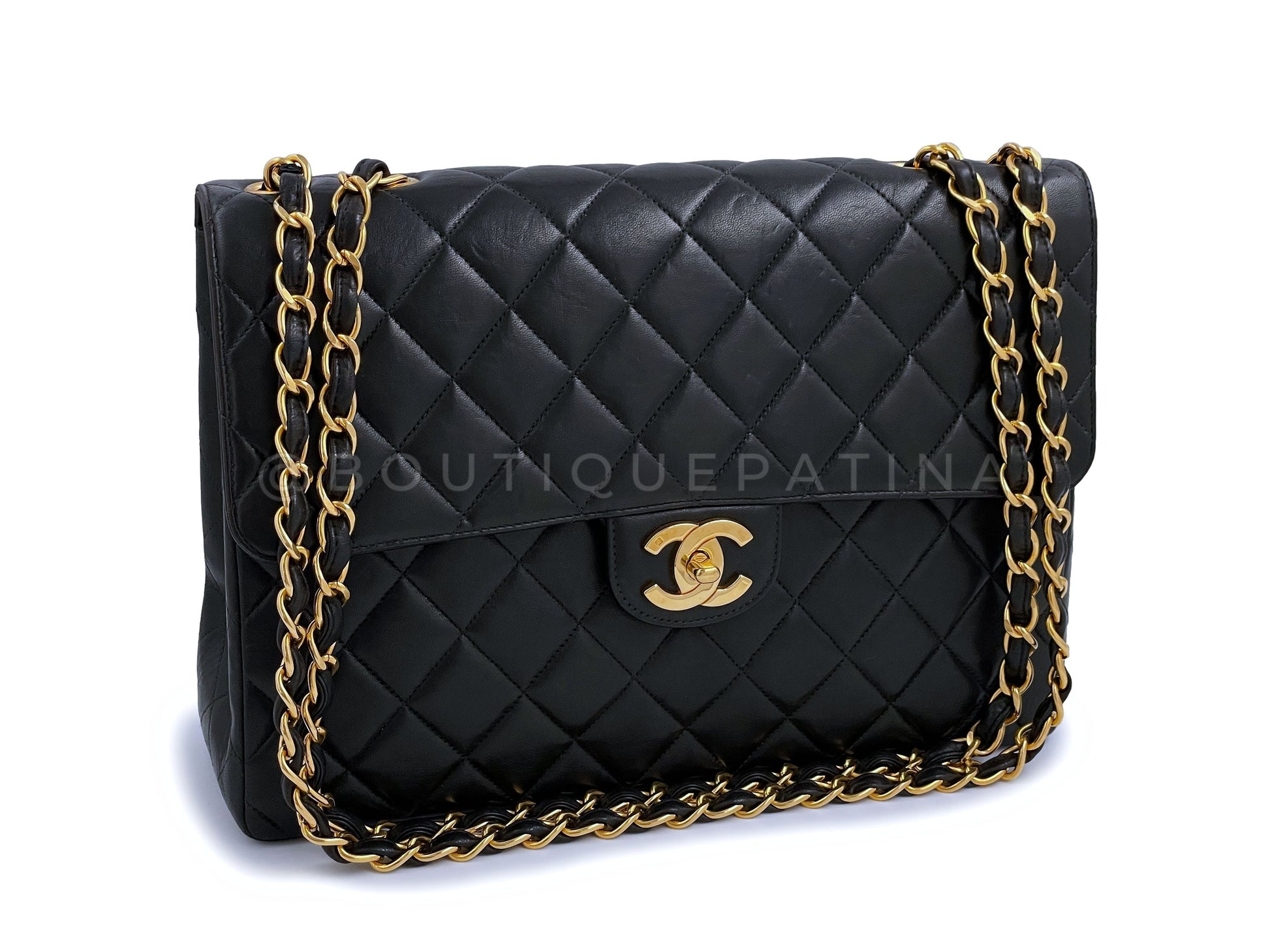 In Black lambskin leather and 24k gold plated hardware. In lambskin leather, the original classic flap in all its glory with its petal soft quilts, true luxury. Boutique Patina specializes in sourcing and curating the best condition preowned vintage Chanel leather treasures by searching closets around the world.