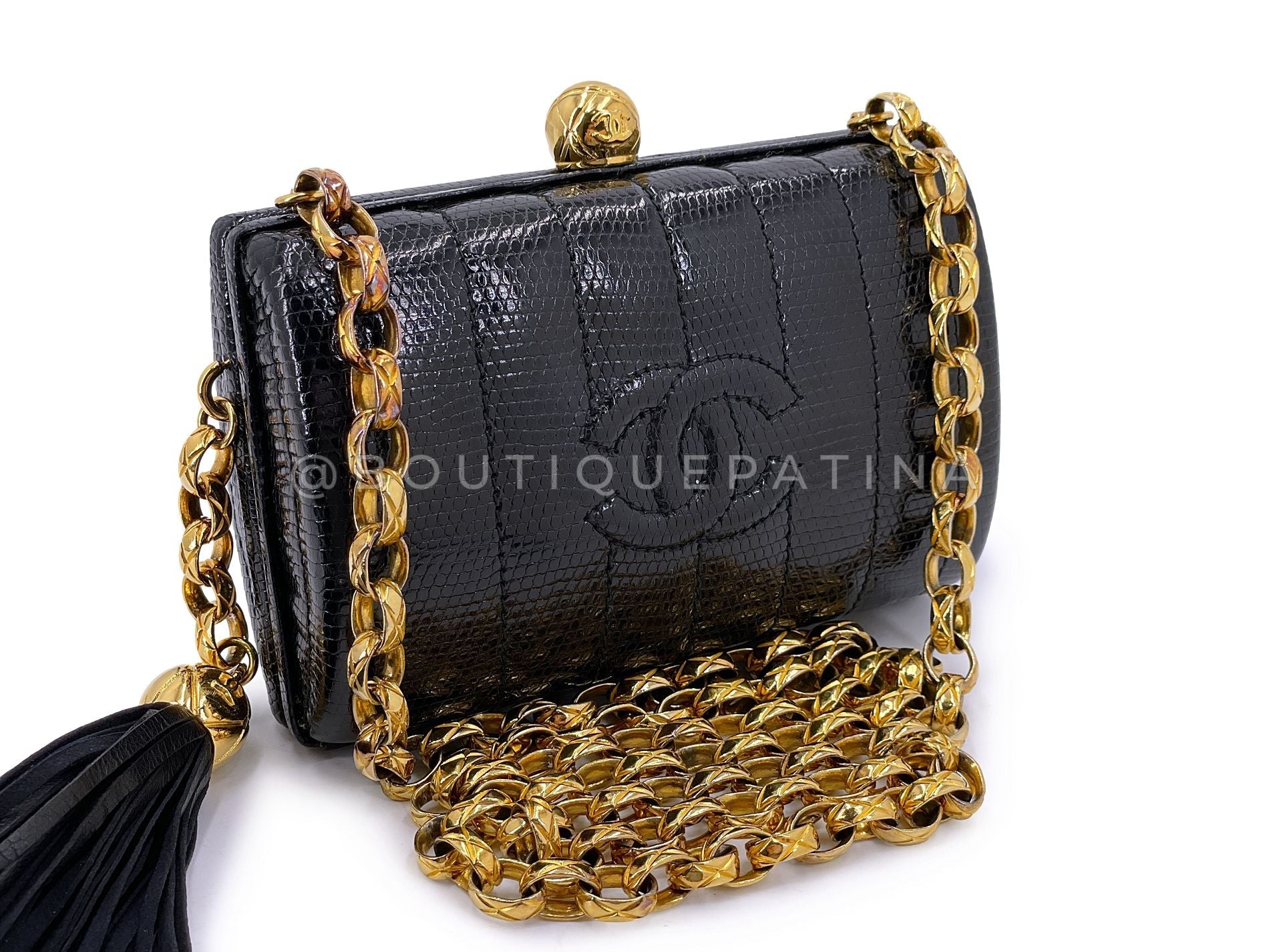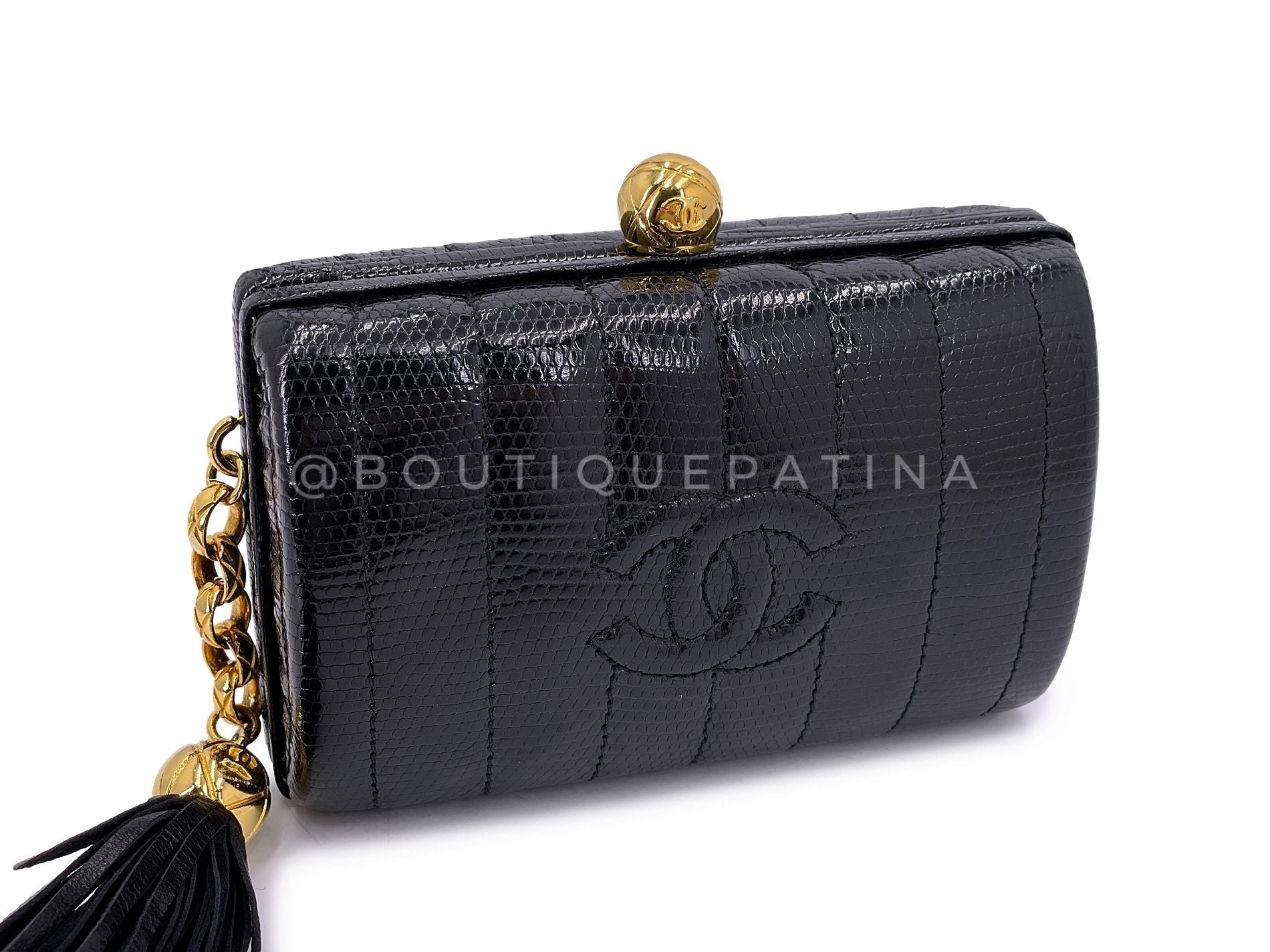 In glossy, pristine lizard (which has been discontinued by Chanel in 2019, no more exotics), this micro clutch has the diamond etched hardware that vintage enthusiasts love.