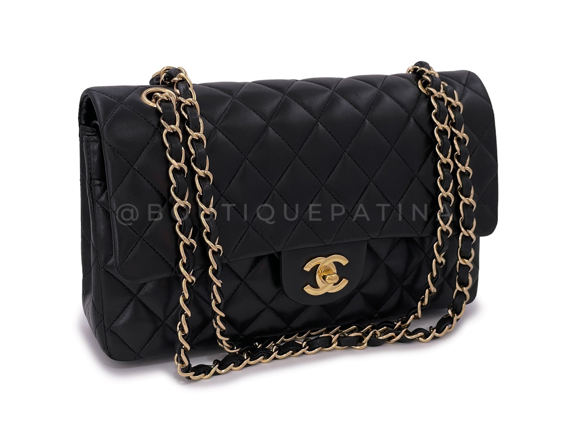 In Black lambskin leather and 24k gold plated hardware. In lambskin leather, the original classic flap in all its glory with its petal soft quilts, true luxury. Boutique Patina specializes in sourcing and curating the best condition preowned vintage Chanel leather treasures by searching closets around the world.
