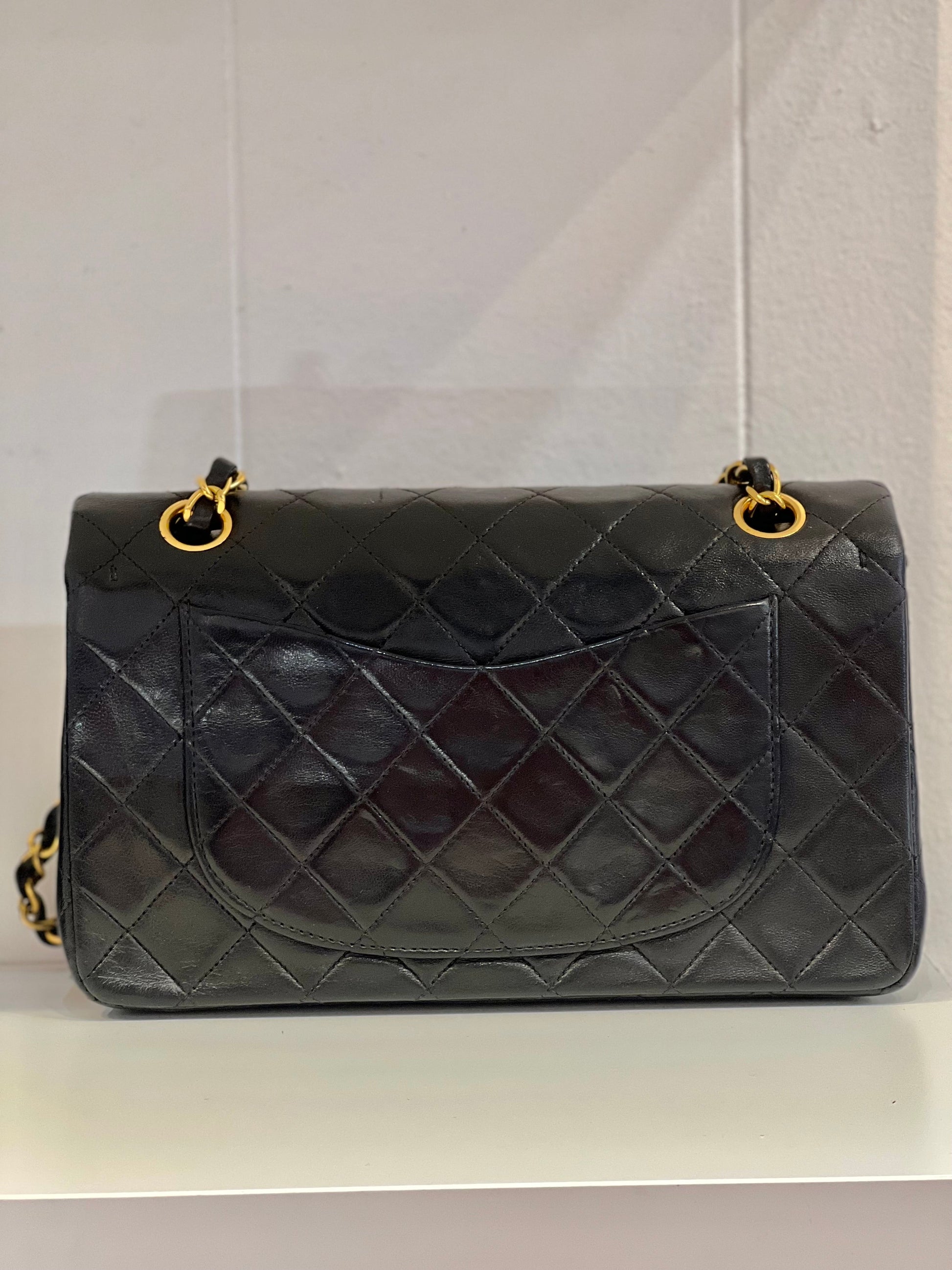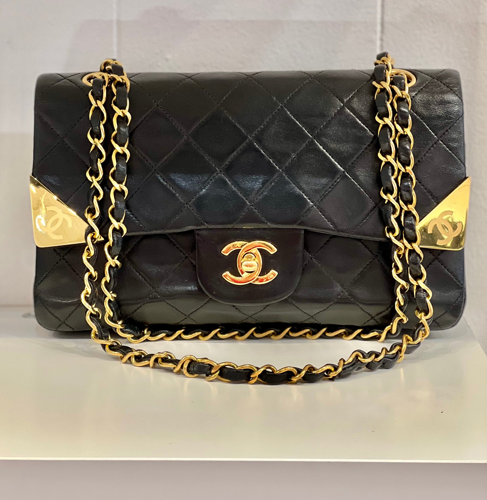 Crafted of luxurious quilted leather in black. The bag features a leather threaded gold chain-link shoulder strap, a rear patch pocket, and a crossover flap with a gold classic CC turn lock. The flap opens to reveal an inner flap and a leather interior with patch pockets.