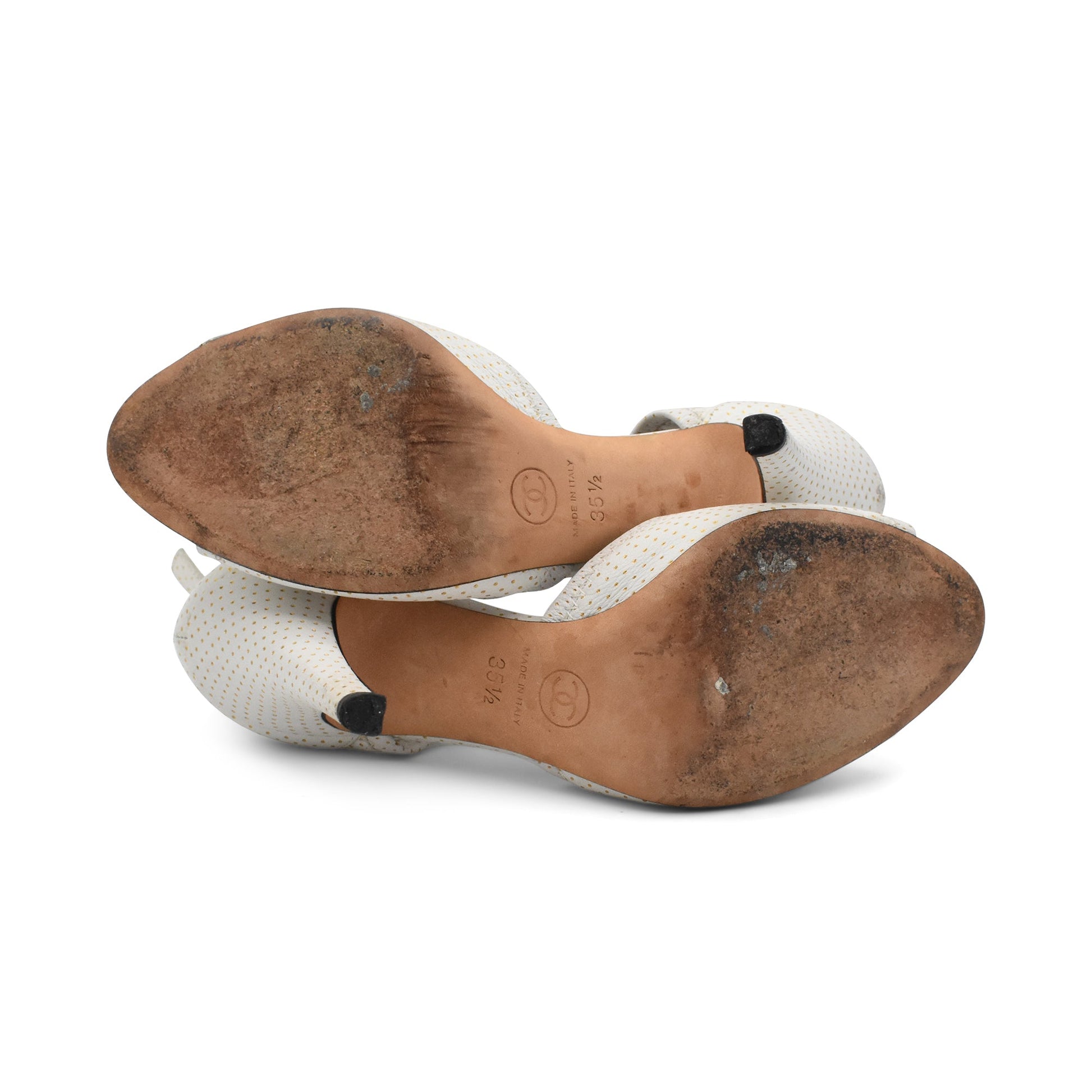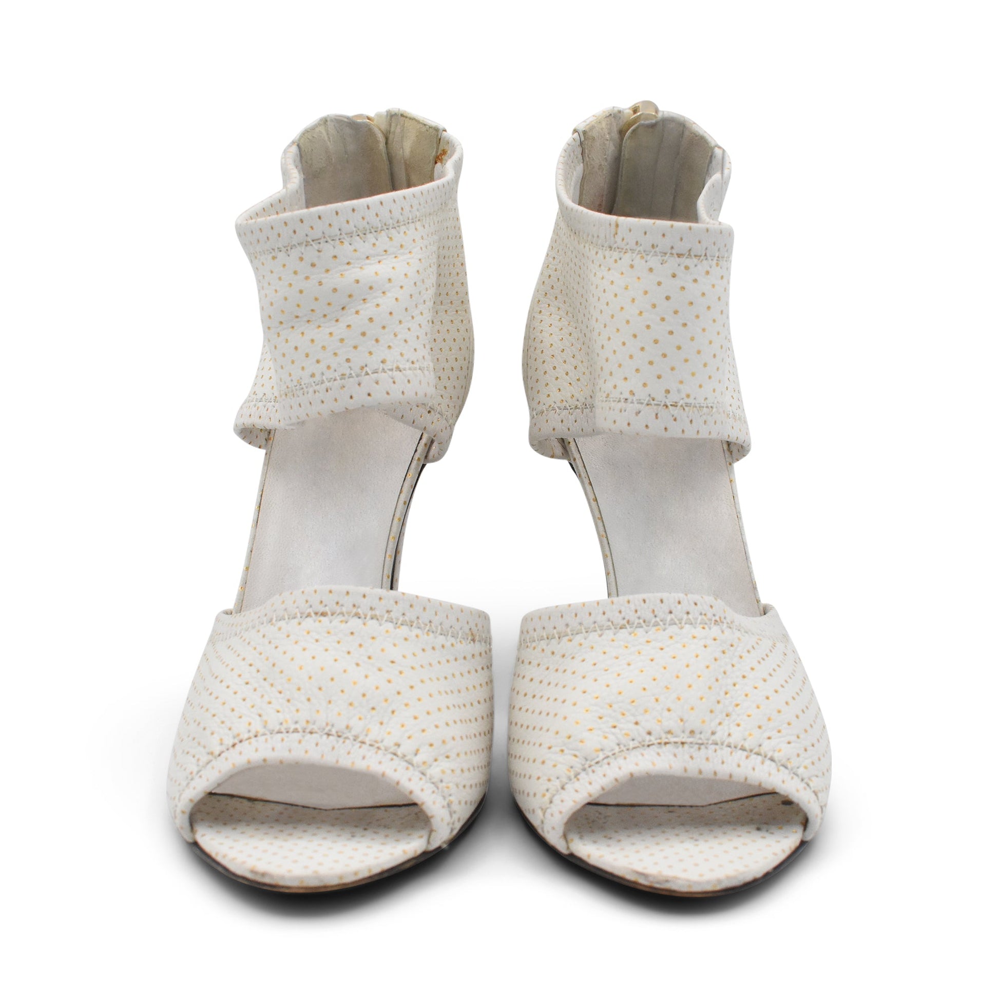 Chanel vintage peep-toe heels in white leather with gold polka dot pattern throughout. Features a thick ankle strap, a stiletto heel, and a back zipper closure.