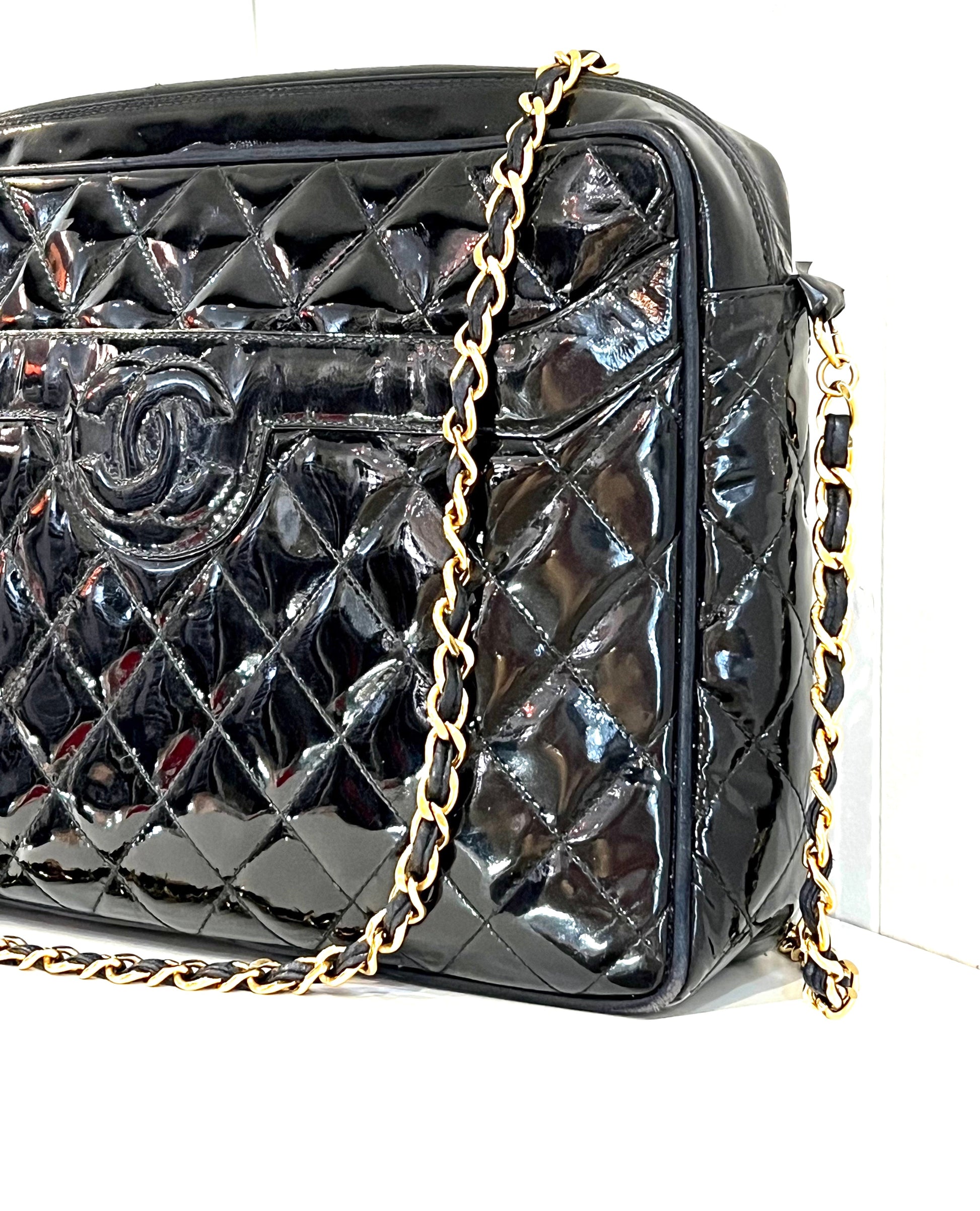 CHANEL VINTAGE QUILTED PATENT CAMERA TASSEL MEDIUM BAG