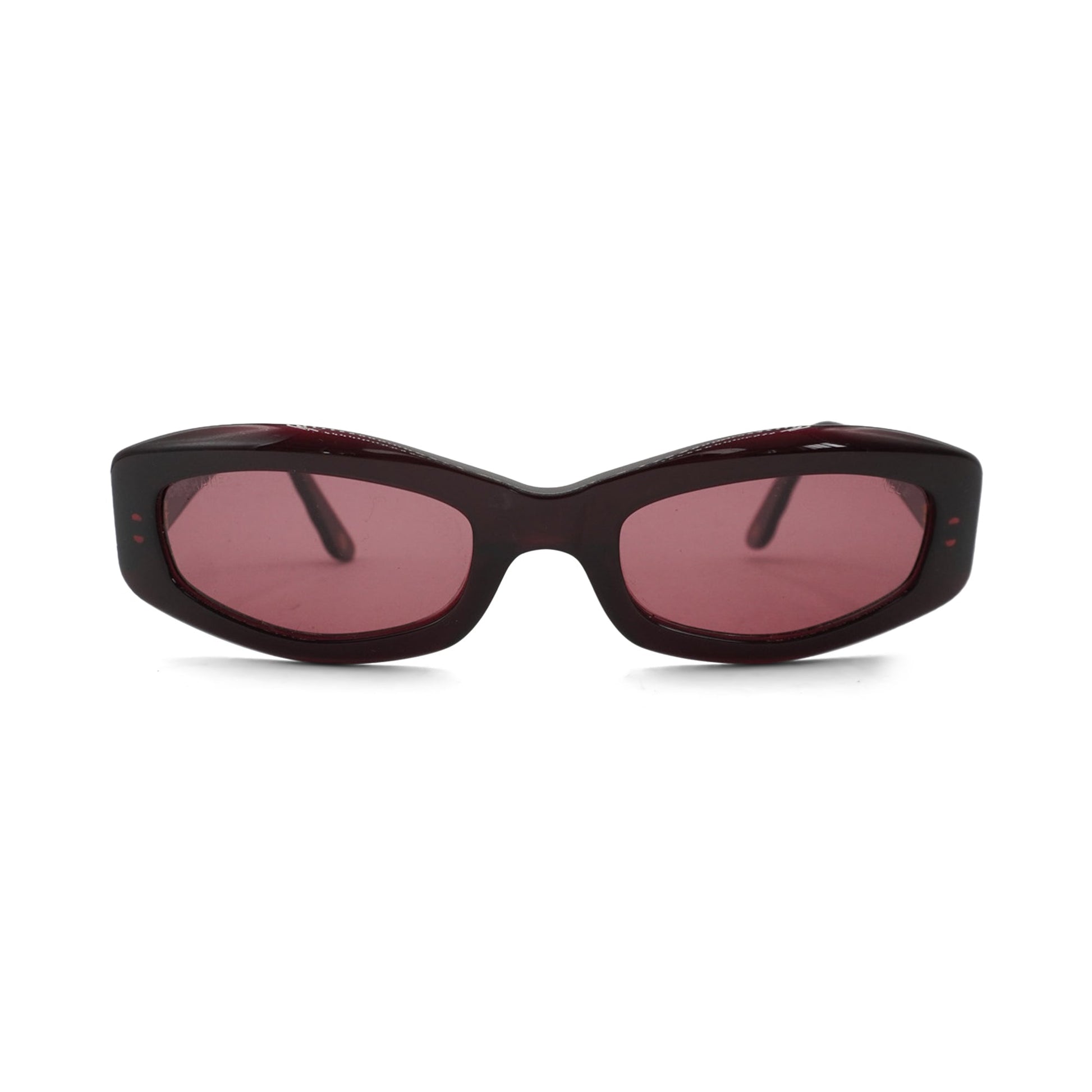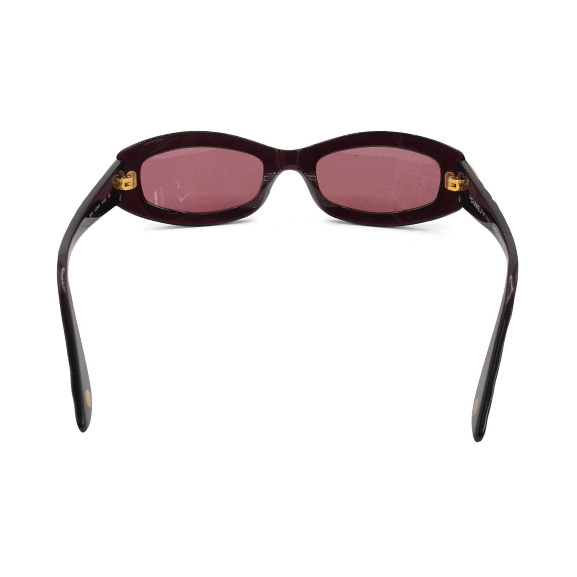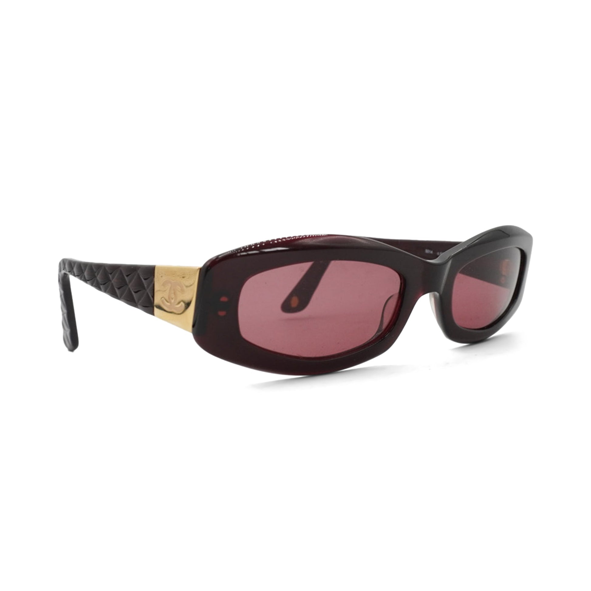 Chanel vintage rectangular sunglasses in semi transparent burgundy acetate with quilted arms and gold CC logo hardware.