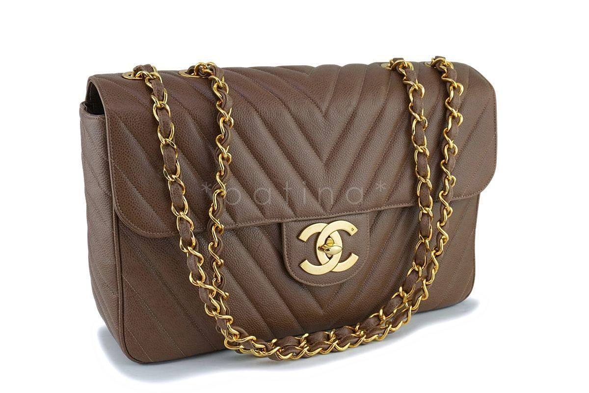 Chanel Vintage Taupe Beige Caviar Chevron Maxi "Jumbo XL" Classic Flap Bag 24k GHW KM5
