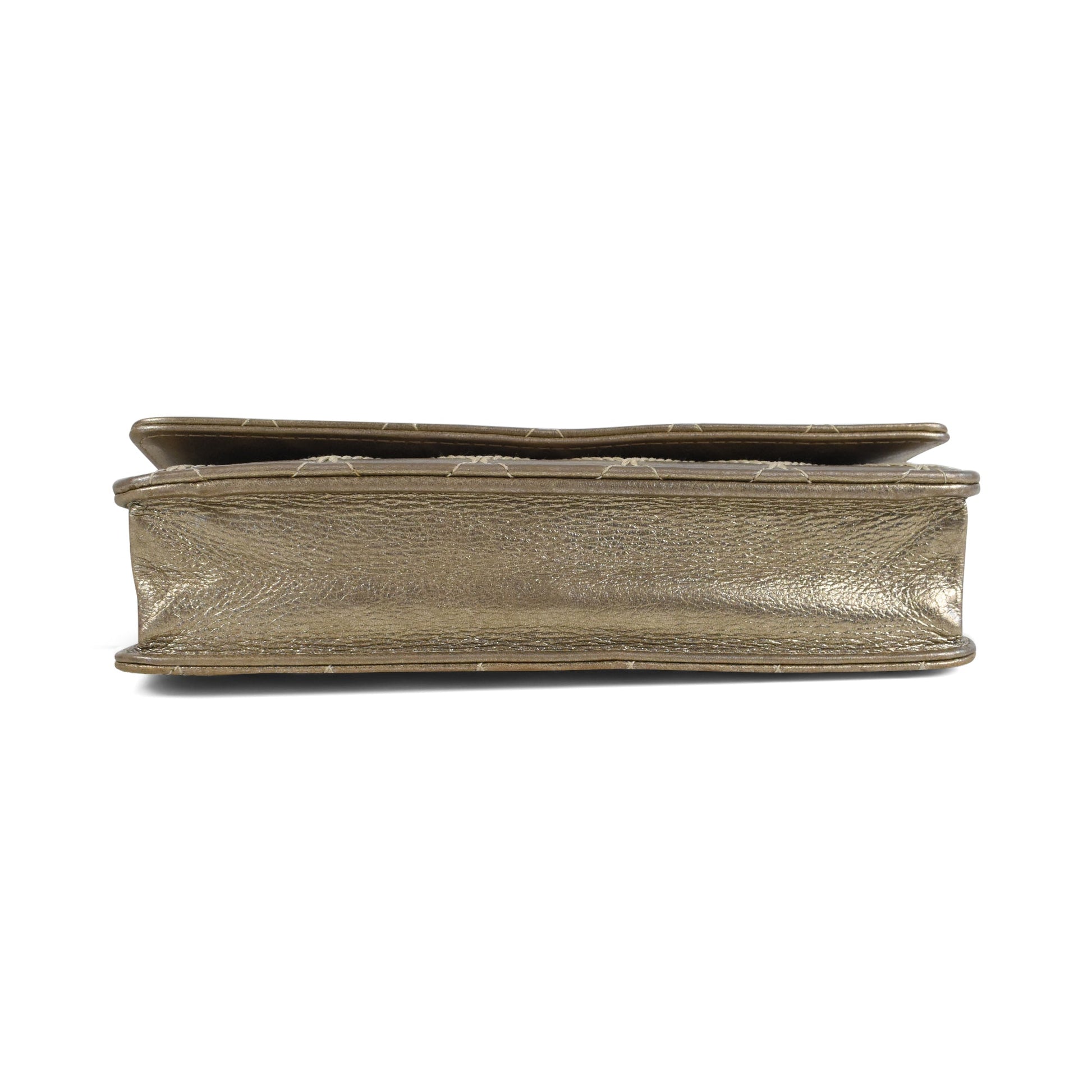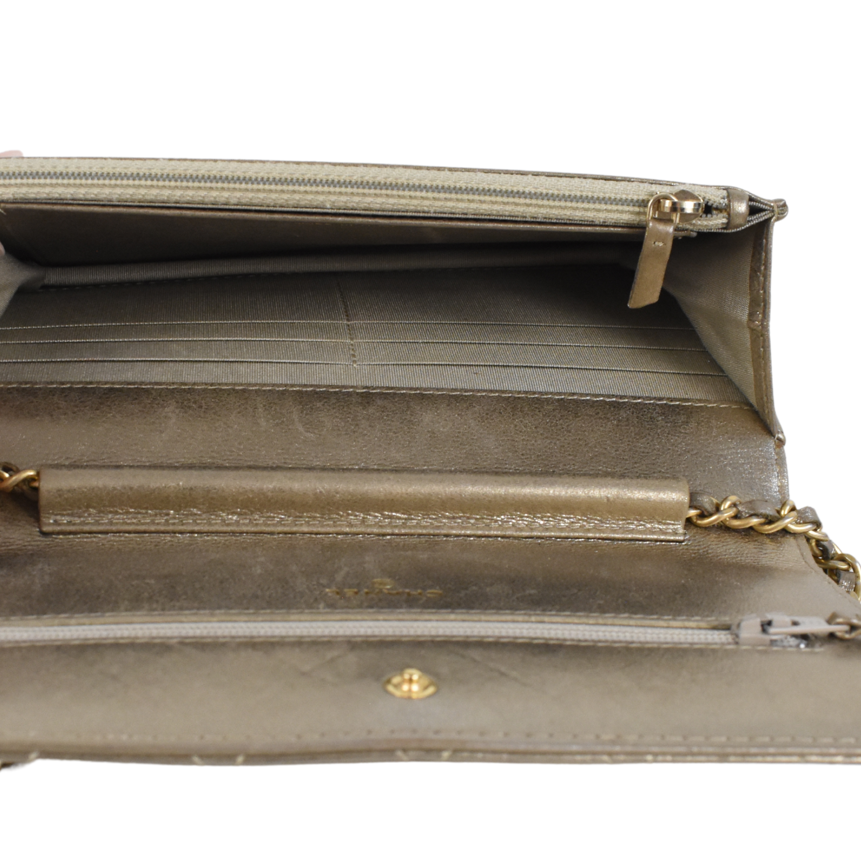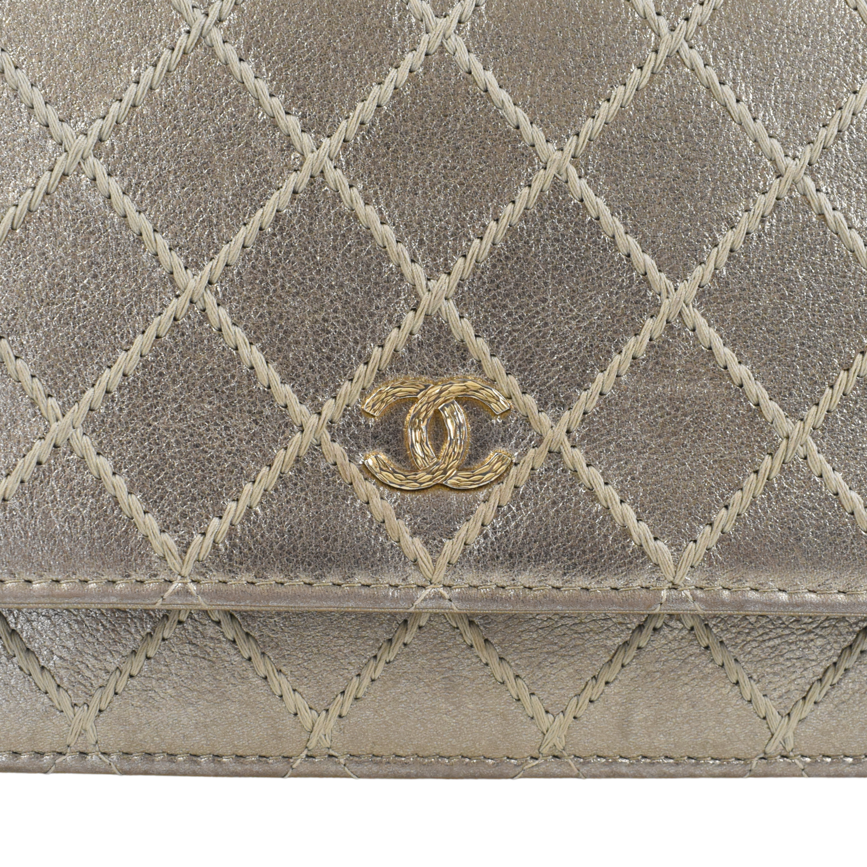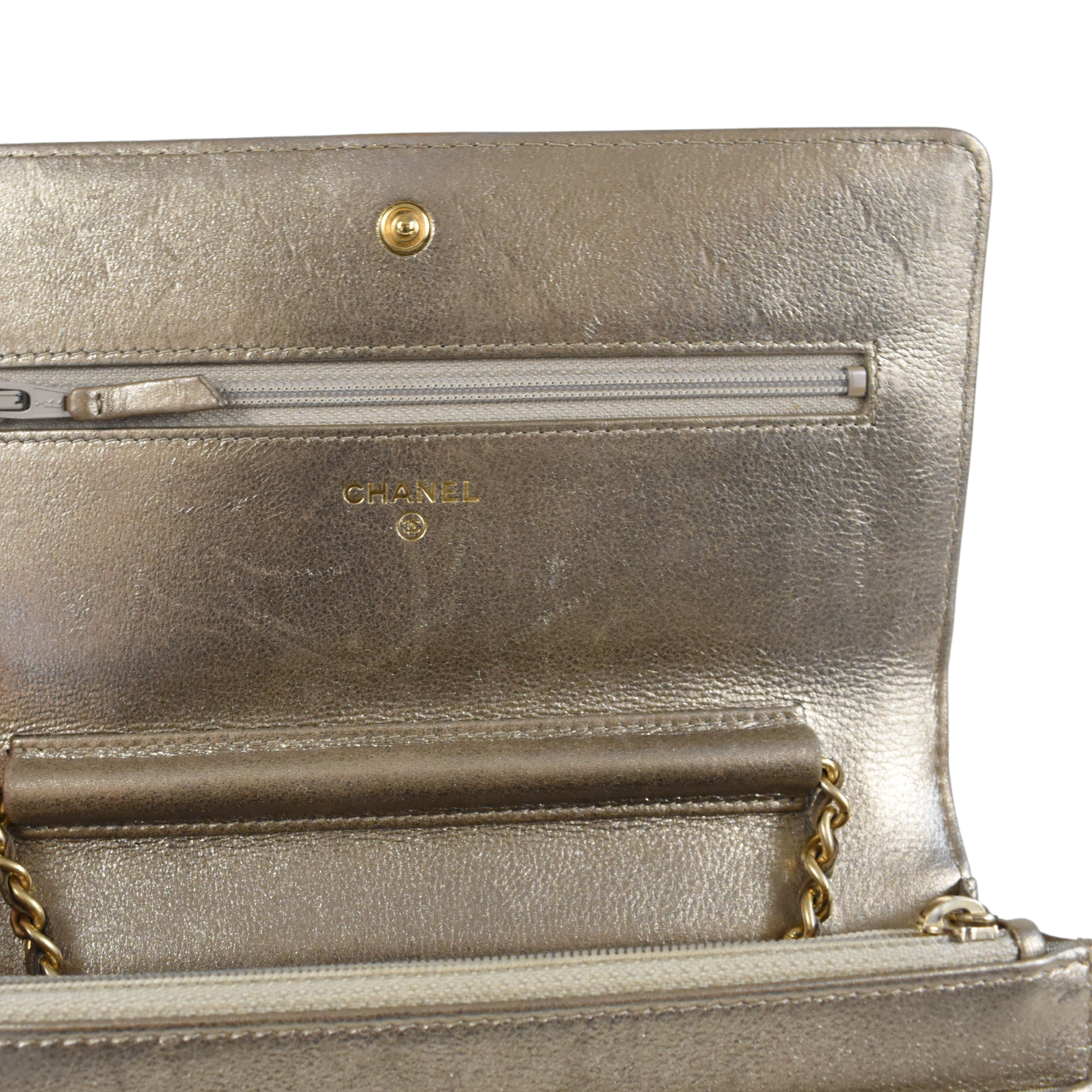 Chanel wallet on chain handbag in metallic pewter gold leather with a thick quilted stitching design, a textured gold 'CC' emblem on the front, and a long woven leather and chain strap. The bag has a top flap opening with a snap button closure revealing beige canvas inner lining with zip and card pockets.