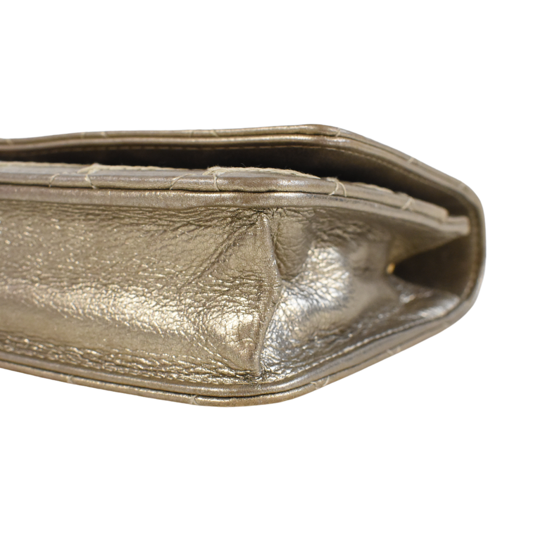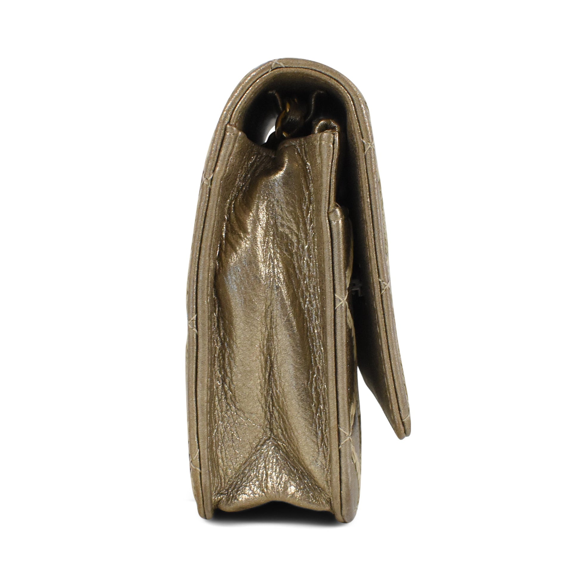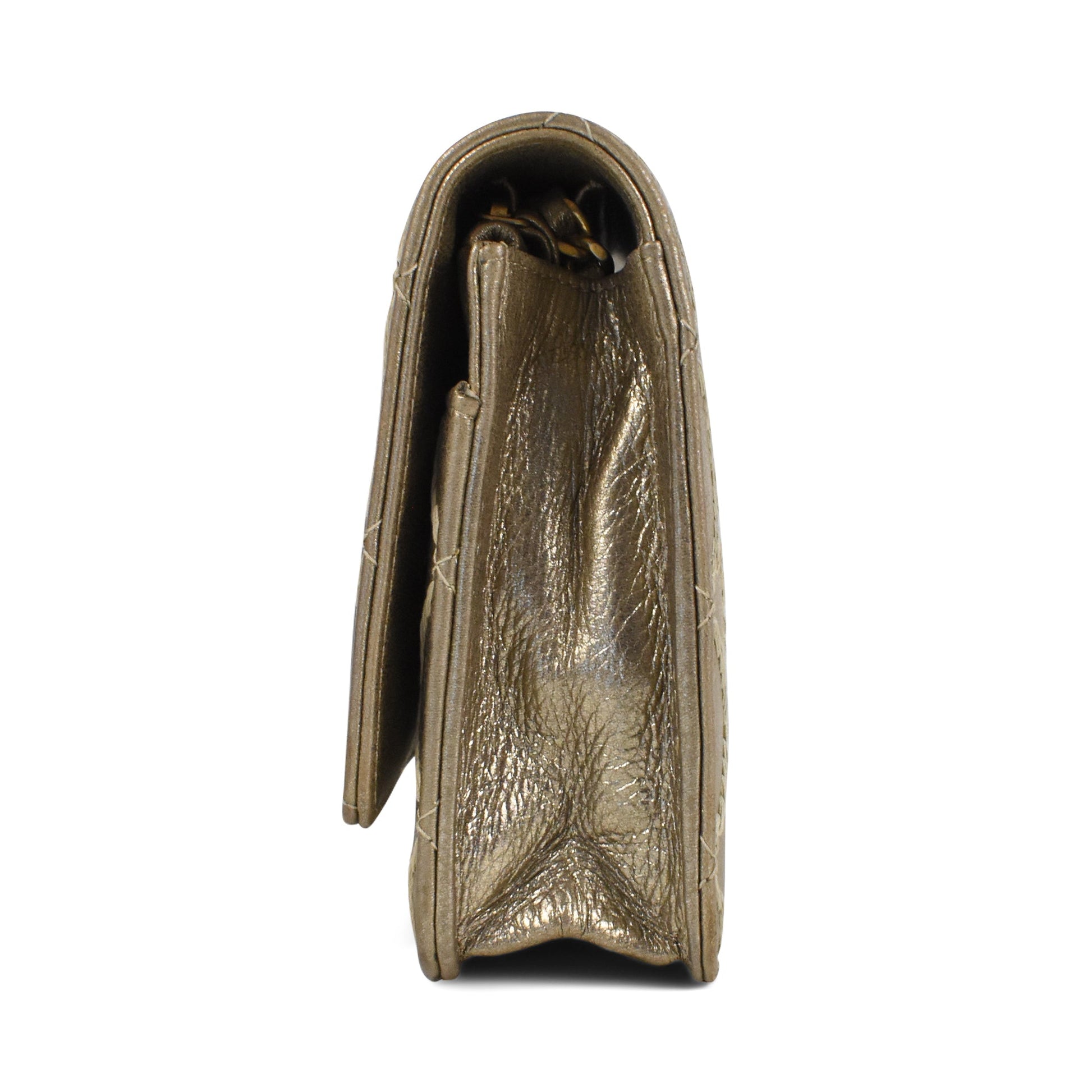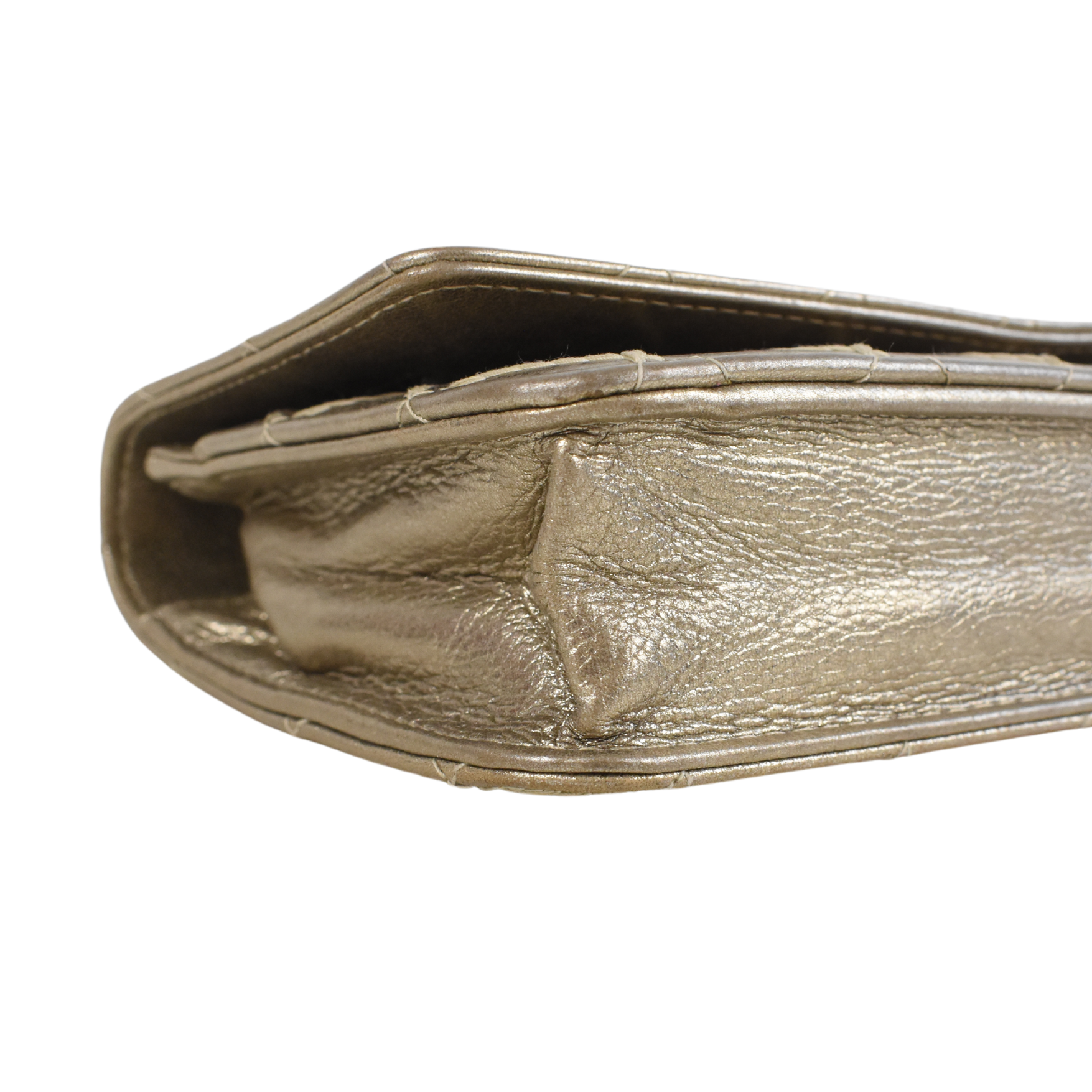 Chanel wallet on chain handbag in metallic pewter gold leather with a thick quilted stitching design, a textured gold 'CC' emblem on the front, and a long woven leather and chain strap. The bag has a top flap opening with a snap button closure revealing beige canvas inner lining with zip and card pockets.