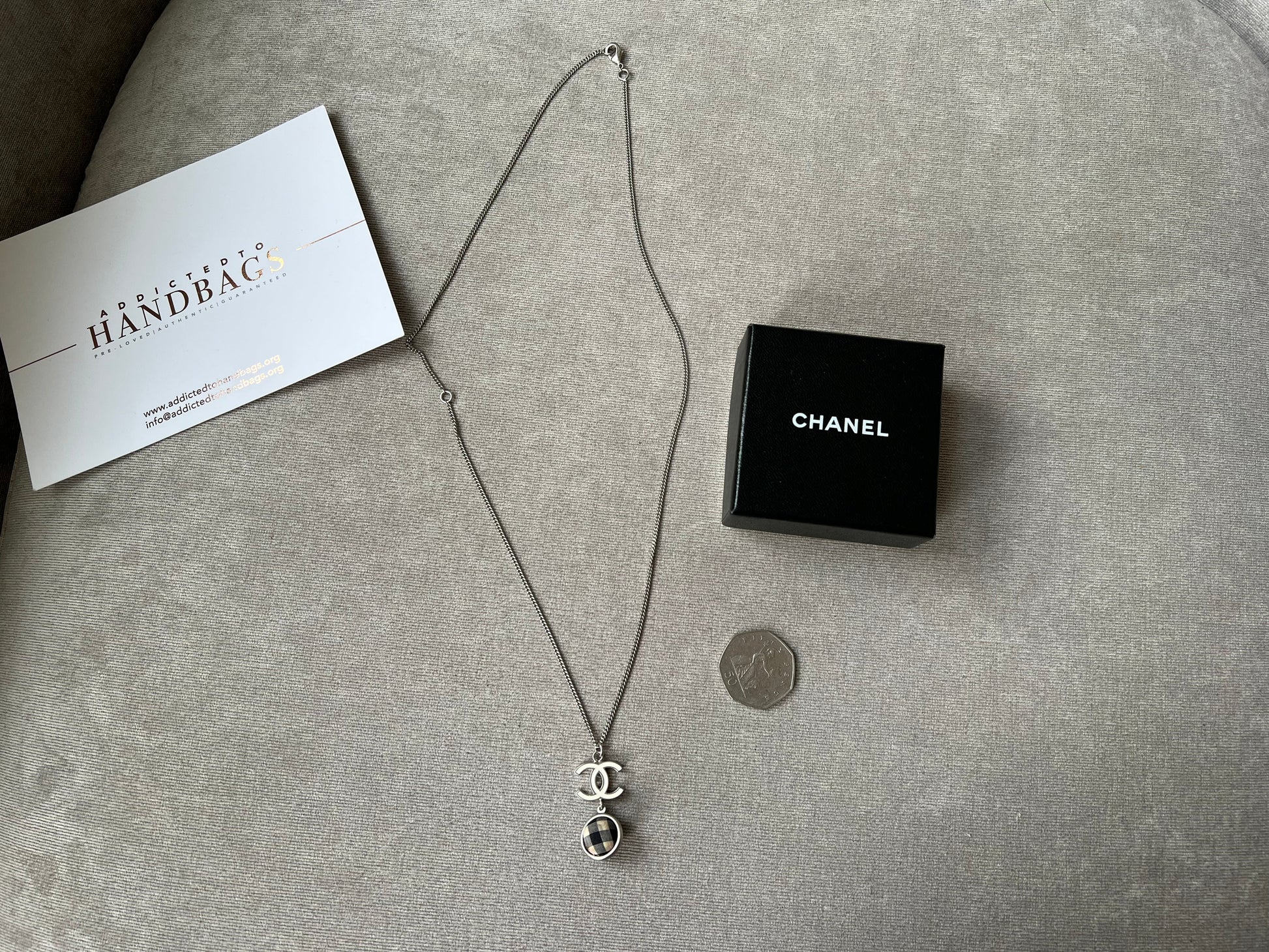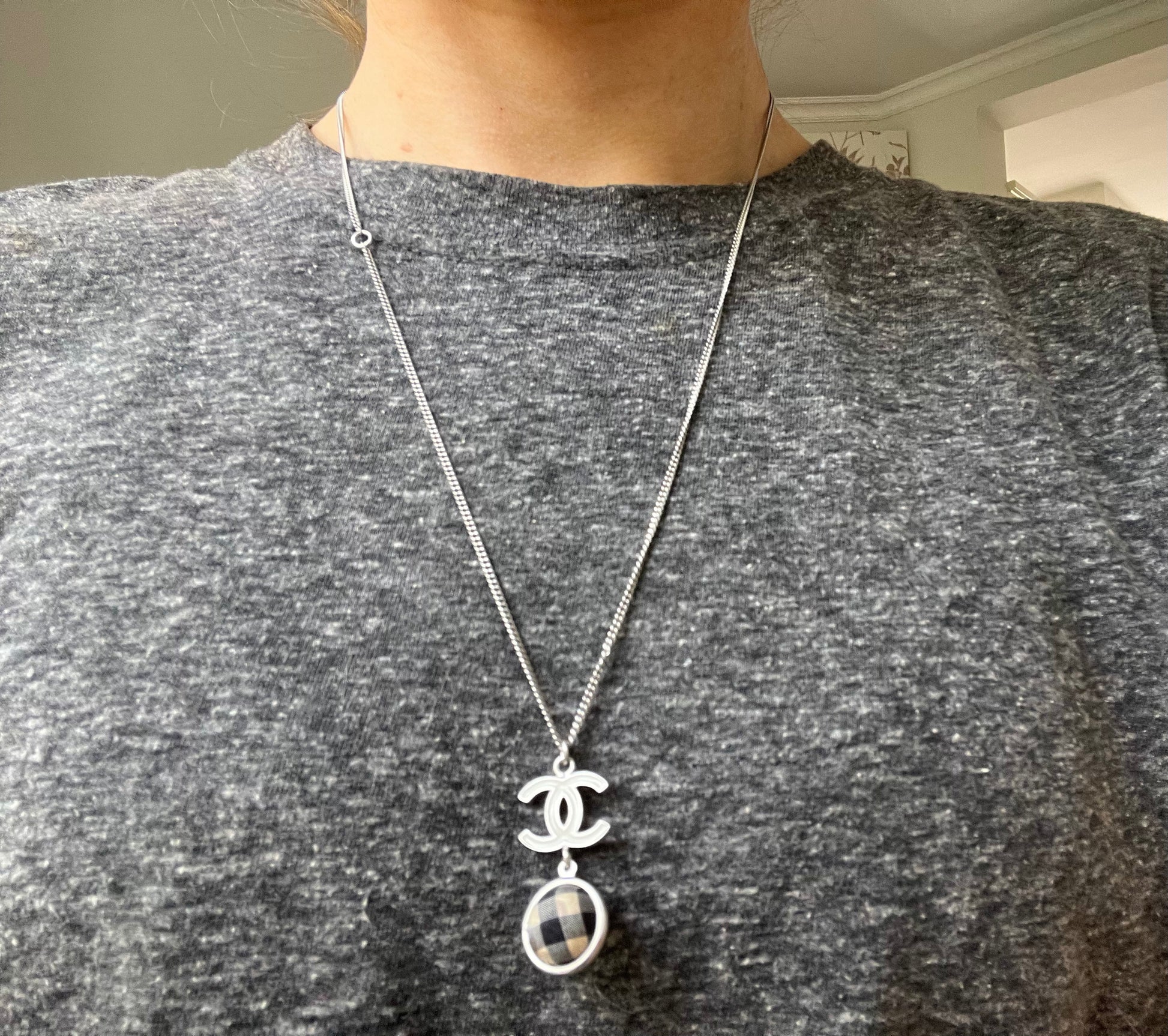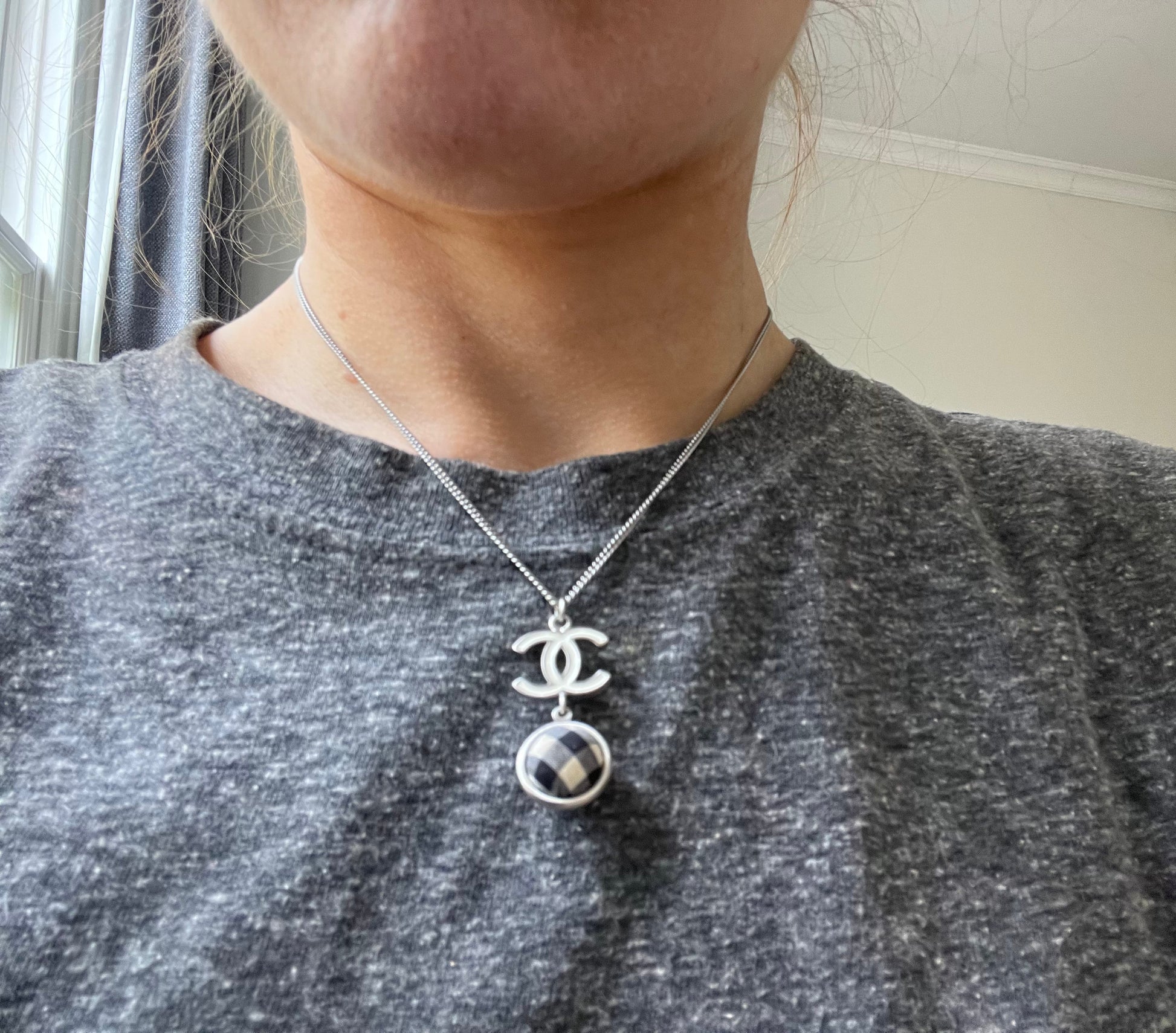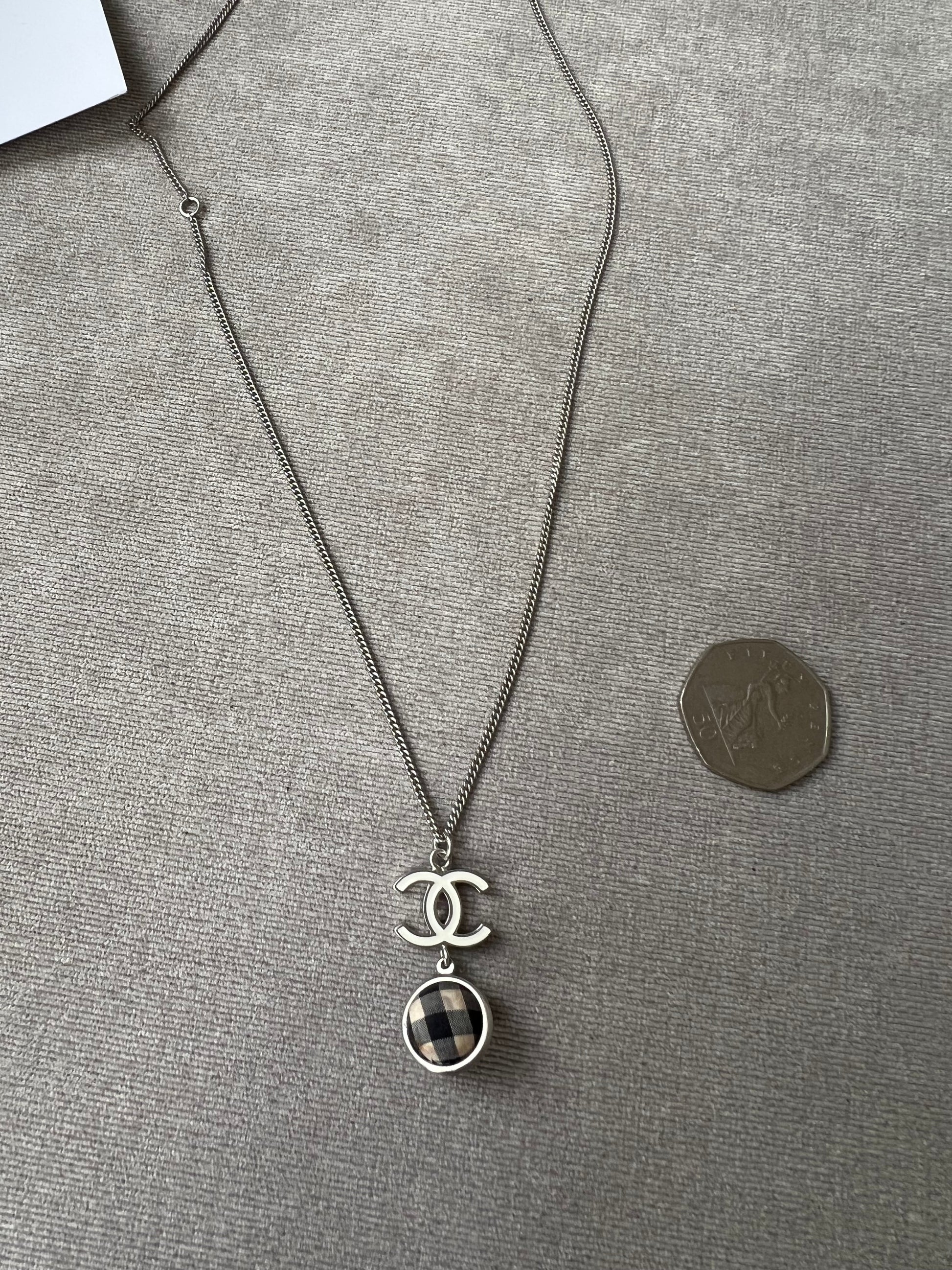 Chanel White Enamel CC Plaid / Check Ball Pendant Necklace. Silver metal chain. Can be worn long or short.