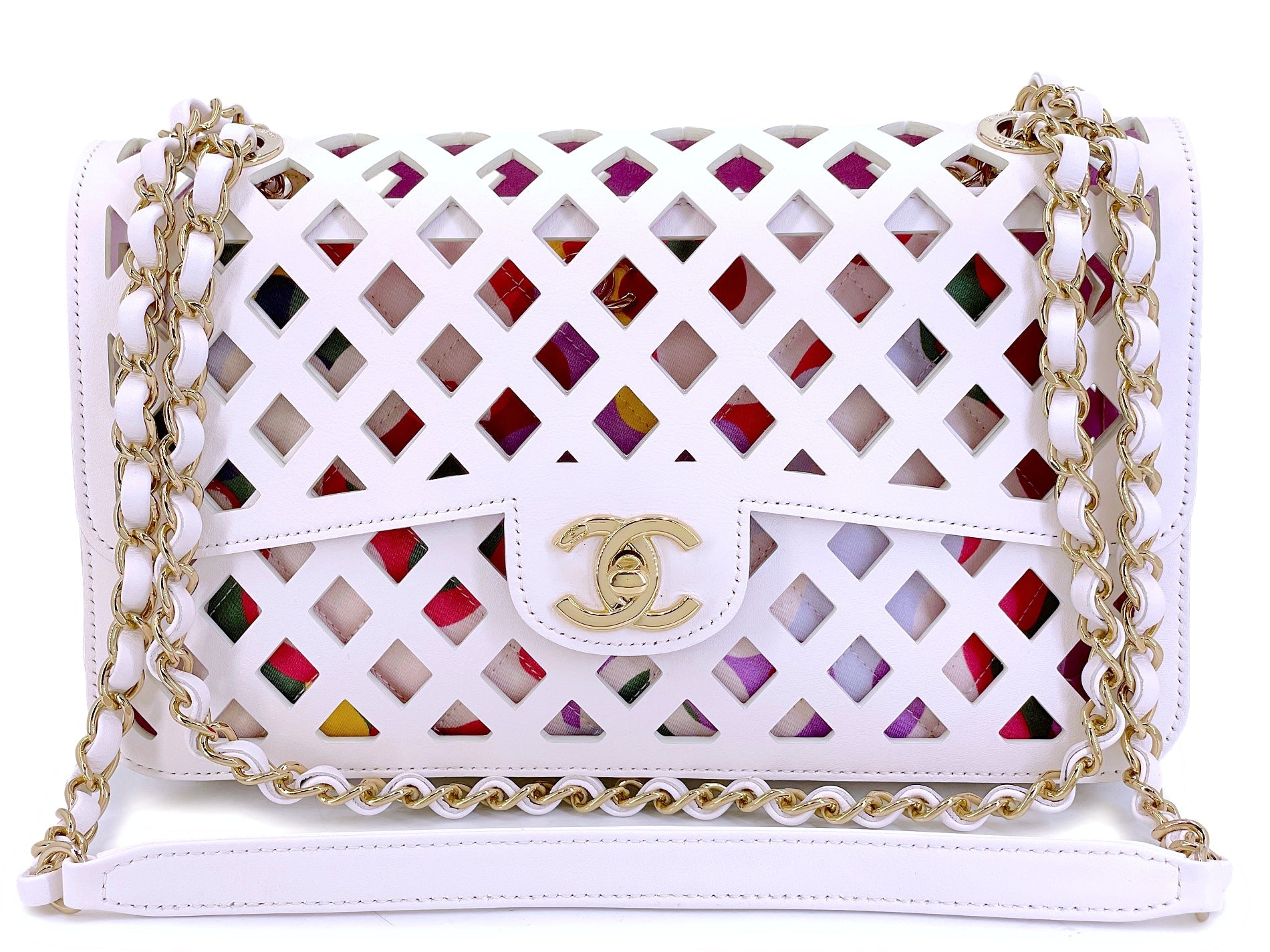 A whimsical, lightweight Chanel flap with intricate laser-cut diamond cutouts in smooth white calfskin.
