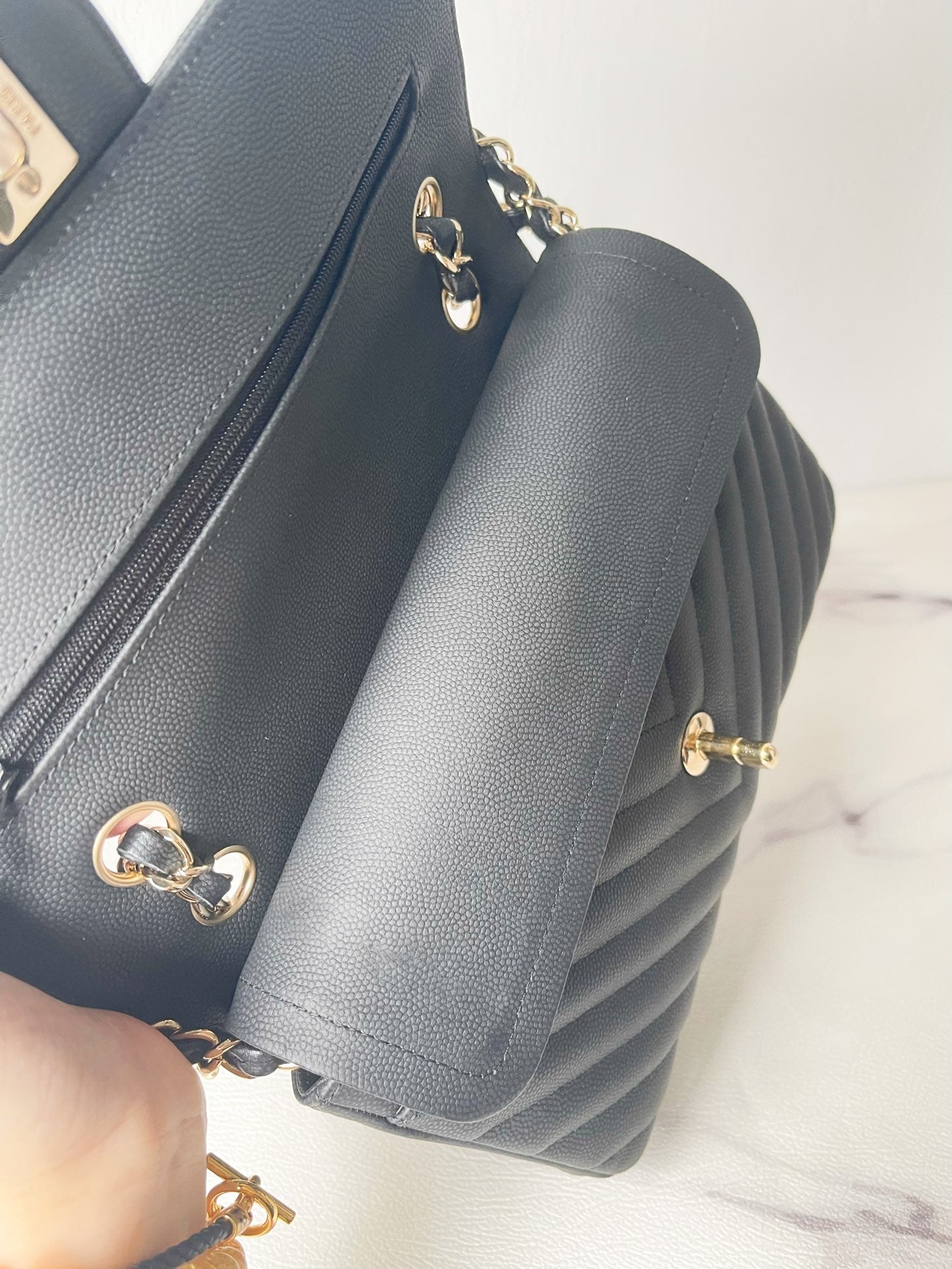 Chanel19S Classic Small Double Flap Black Matte Chevron Caviar with light gold hardware