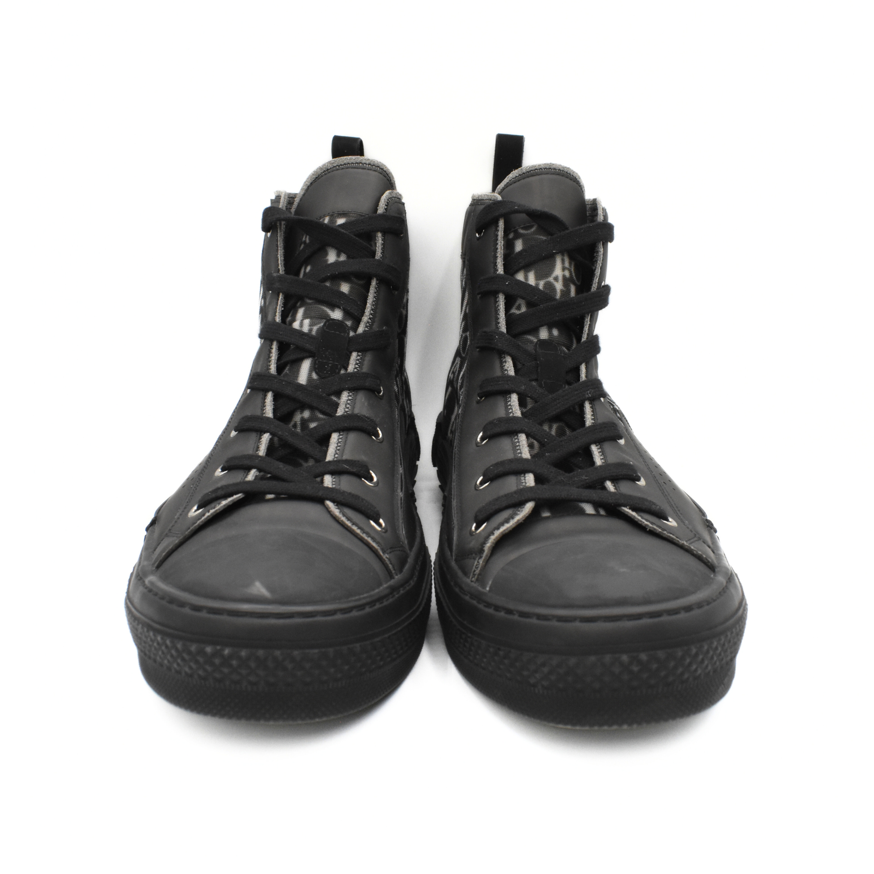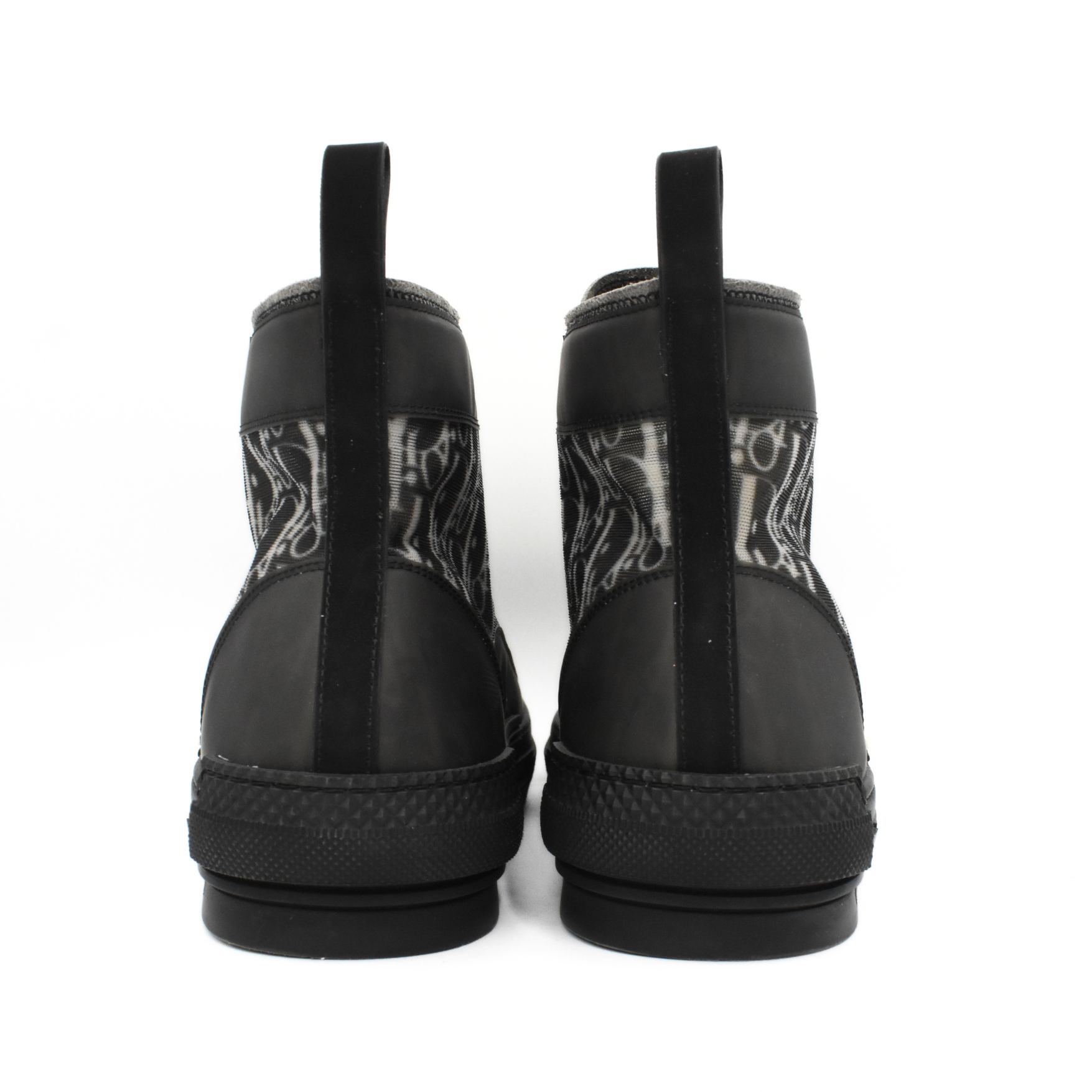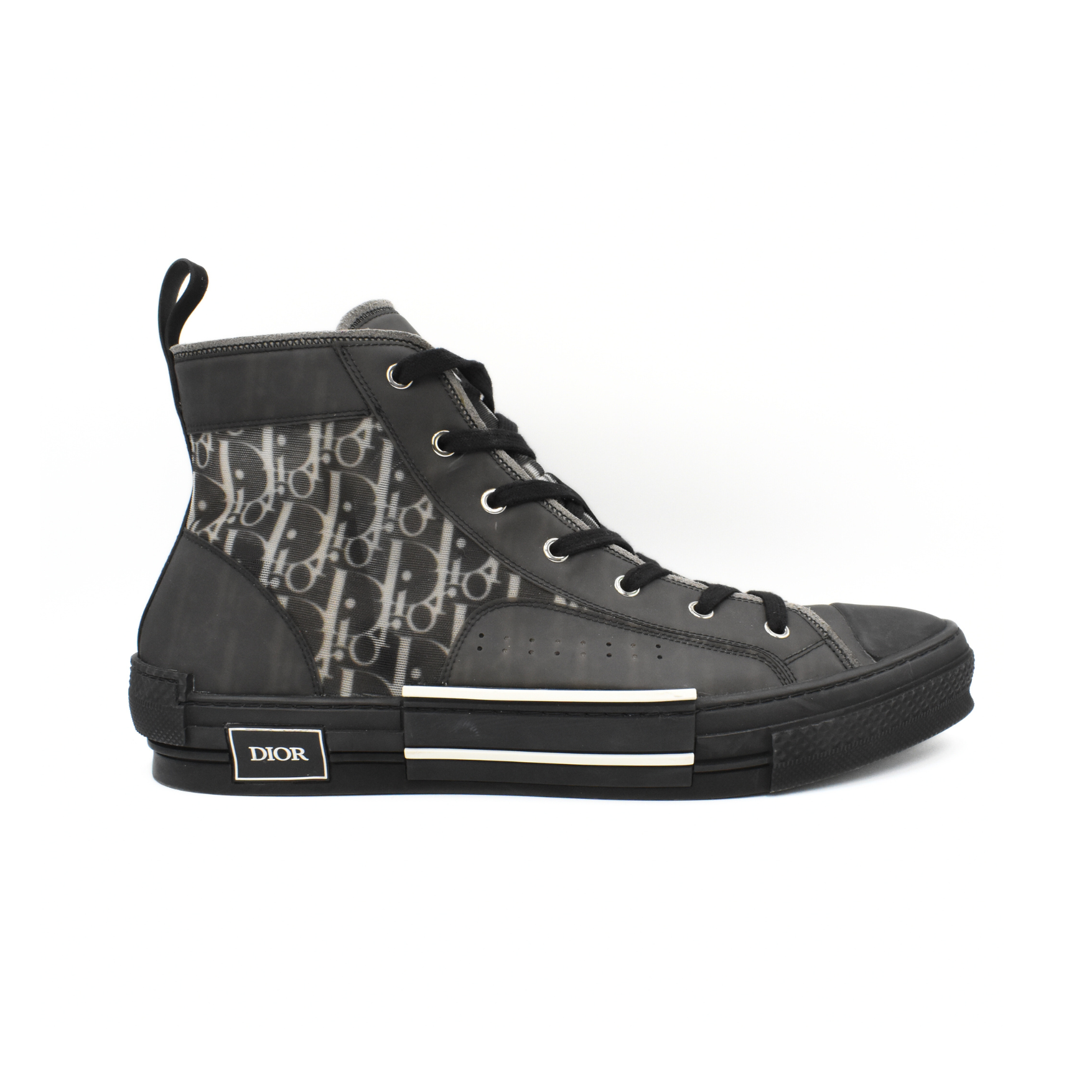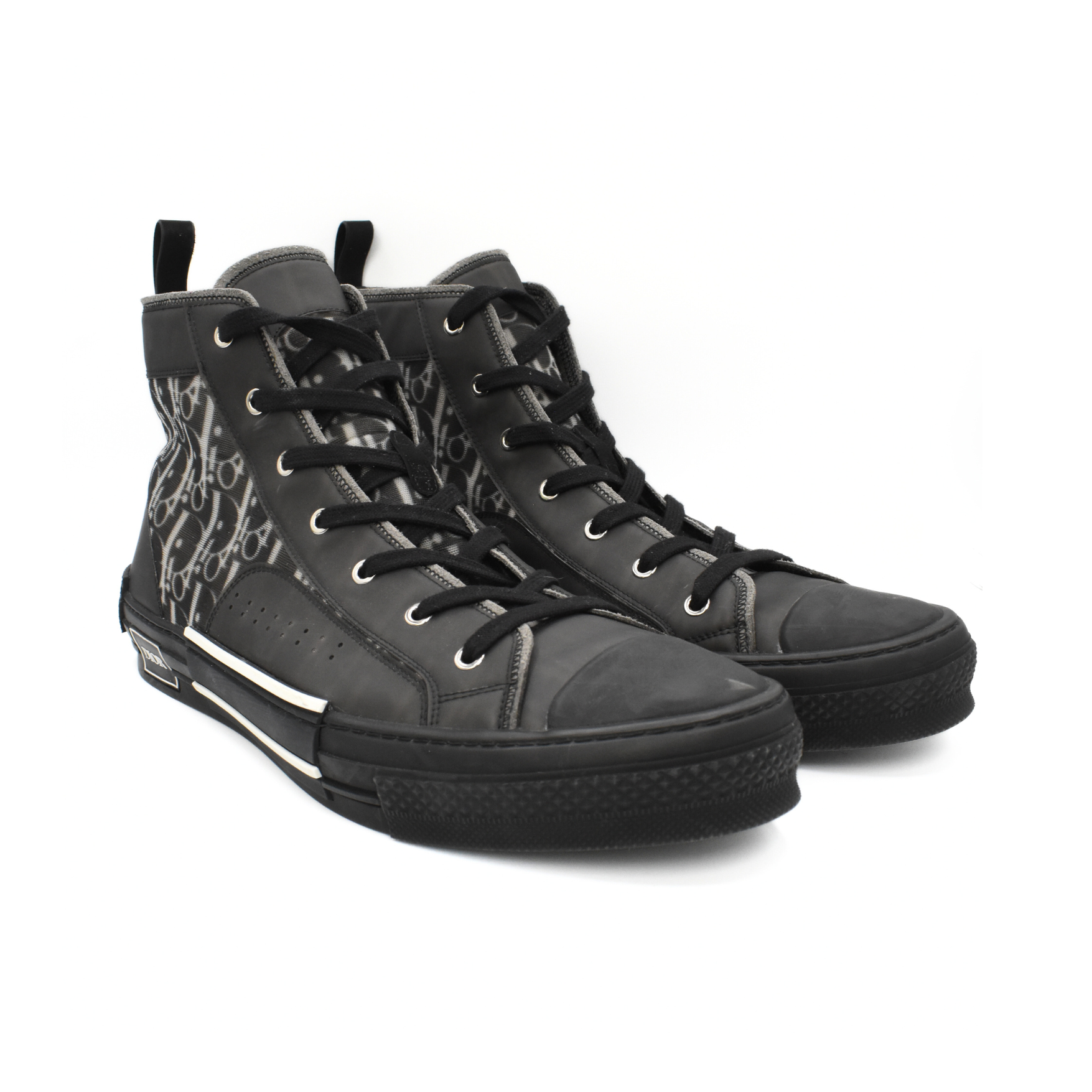 Christian Dior 'B23' high-top sneakers in sheer black mesh and rubber with an all-over white oblique monogram print, black rubber soles, and white trim on the sides.
