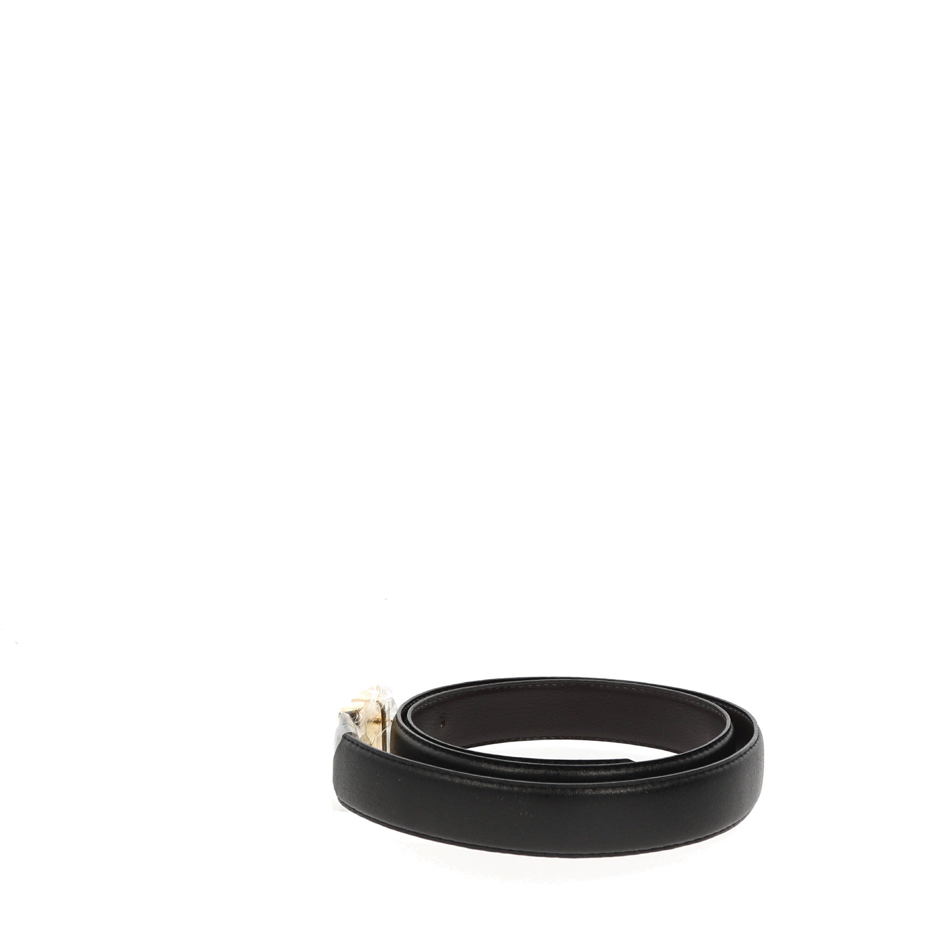 This elegant belt is finely crafted of coated leather and leather in Black with golden color hardware