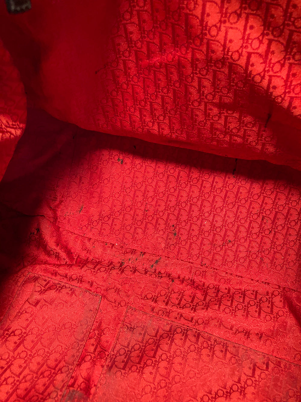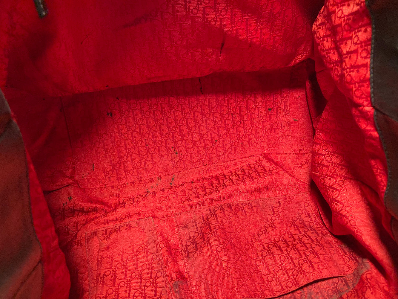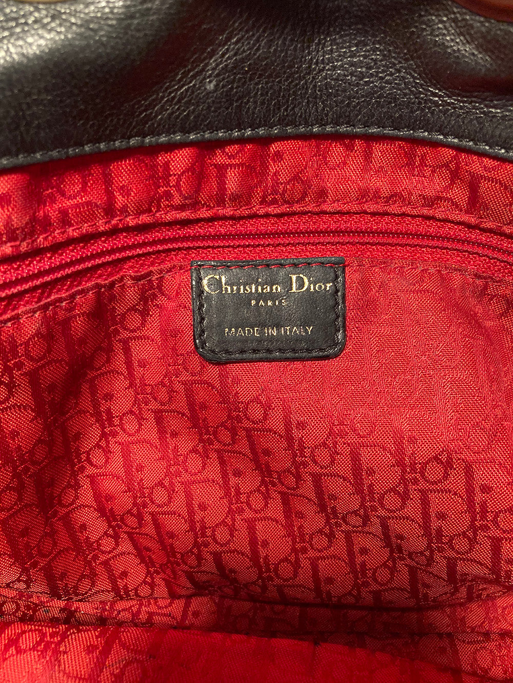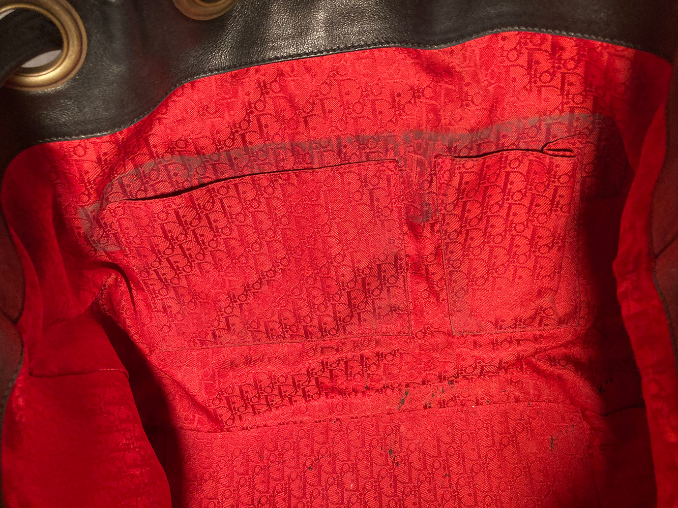 Christian Dior Black Leather Cannage Drawstring Shoulder Bag in very good condition. black cannage quilted leather trimmed with antiqued bronze hardware. Drawstring style top opens to a red nylon lined interior with one zip and 2 slit side pockets. Clean corners and exterior. Light pen marks/stains inside and one stripe of darkness above slit pockets see photos for details. Purchase includes dust cover. measurements: 15"x12"x6" 12" strap drop